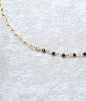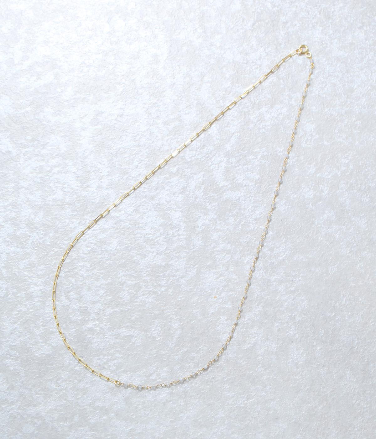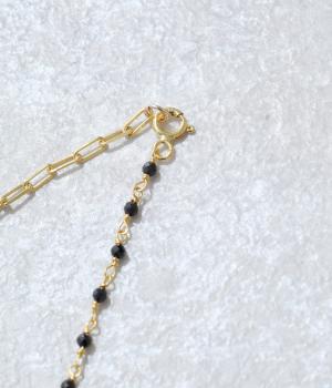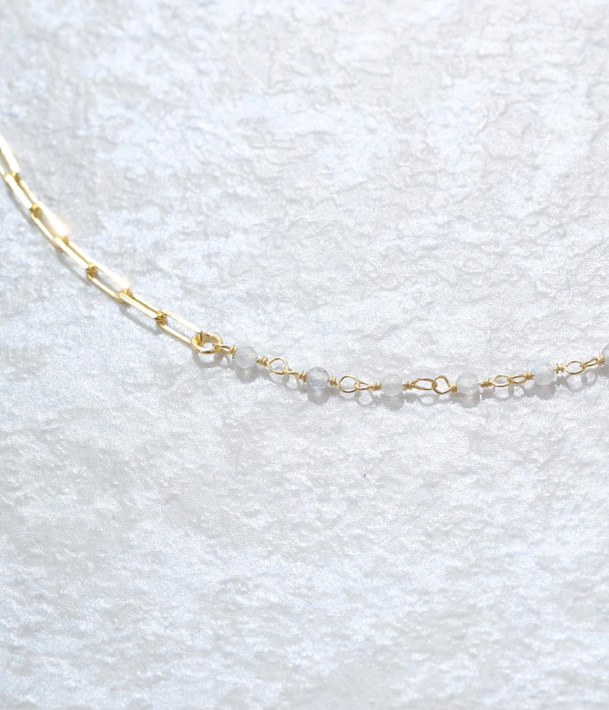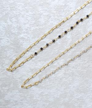 【素材】品の良い光沢が特徴的なブラックオニキスと、半透明で肌なじみのよいムーンストーンを使用しました。【デザイン】小粒のブラックオニキスとムーンストーンを、ゴールドのチェーンと組み合わせたネックレスです。チェーンにも変化を持たせ、胸元のアクセントとしてぴったりのアイテムに。ギフトにもおすすめです。