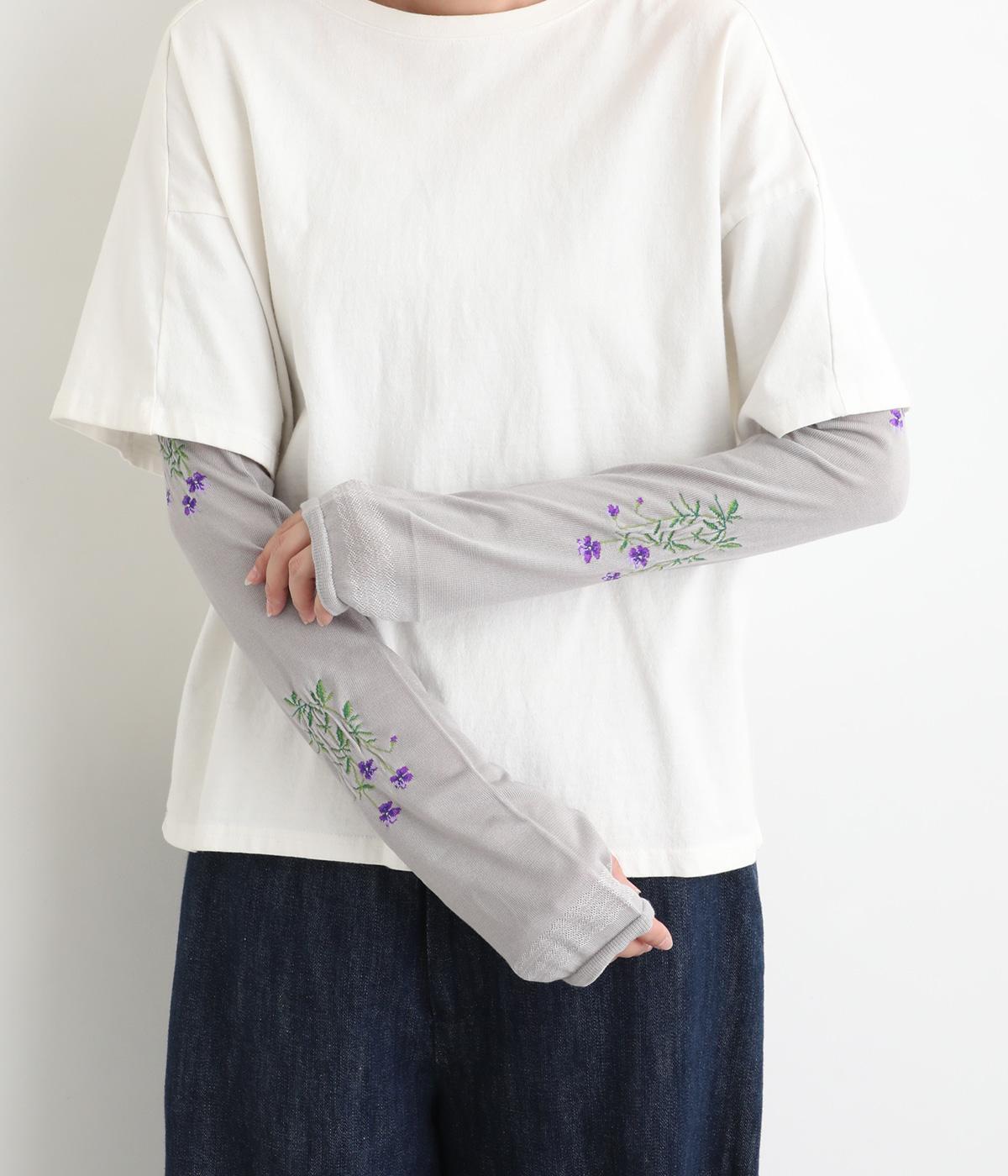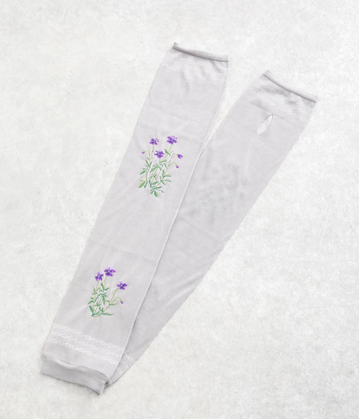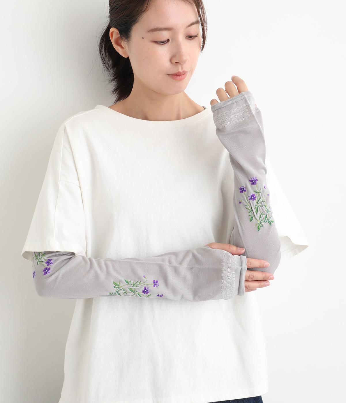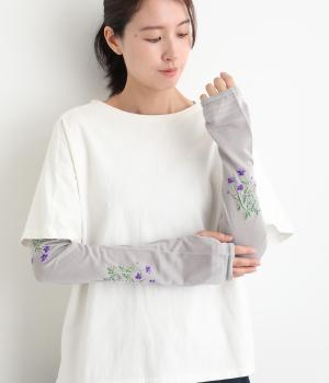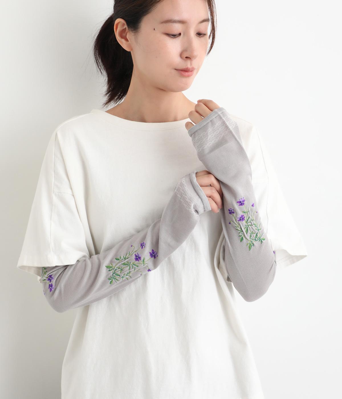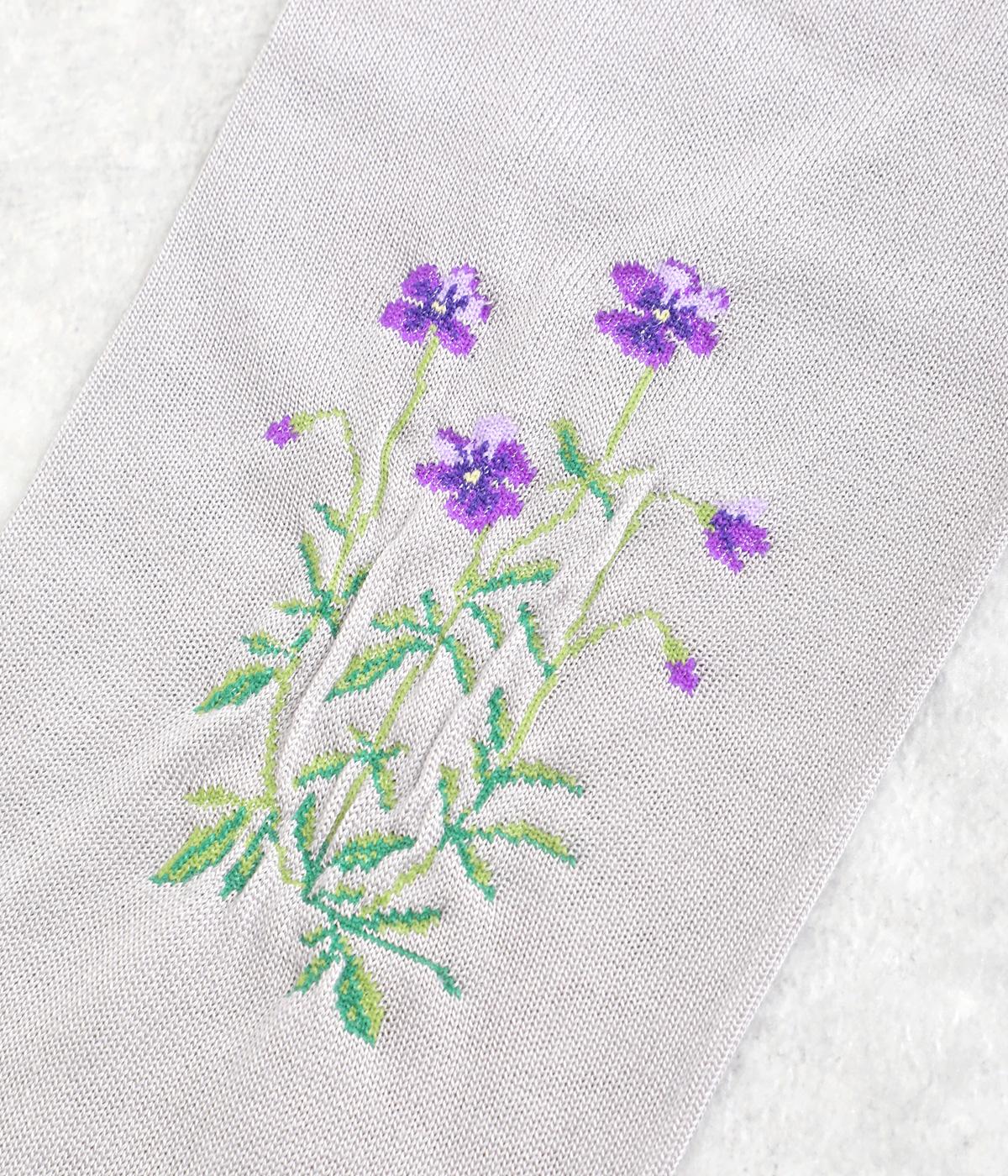 ビオラ柄がやわらかな彩りを添えるアームカバー。手元にはダイヤ柄の透かし模様をあしらい、軽やかな抜け感をプラスしました。ひんやりとした素材で暑い季節も快適に、二の腕までやさしくカバーします。