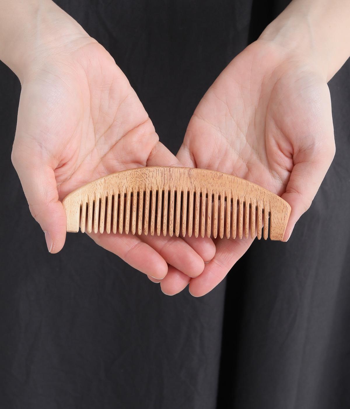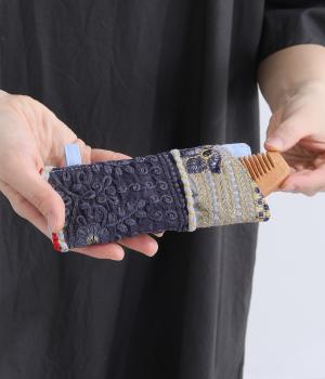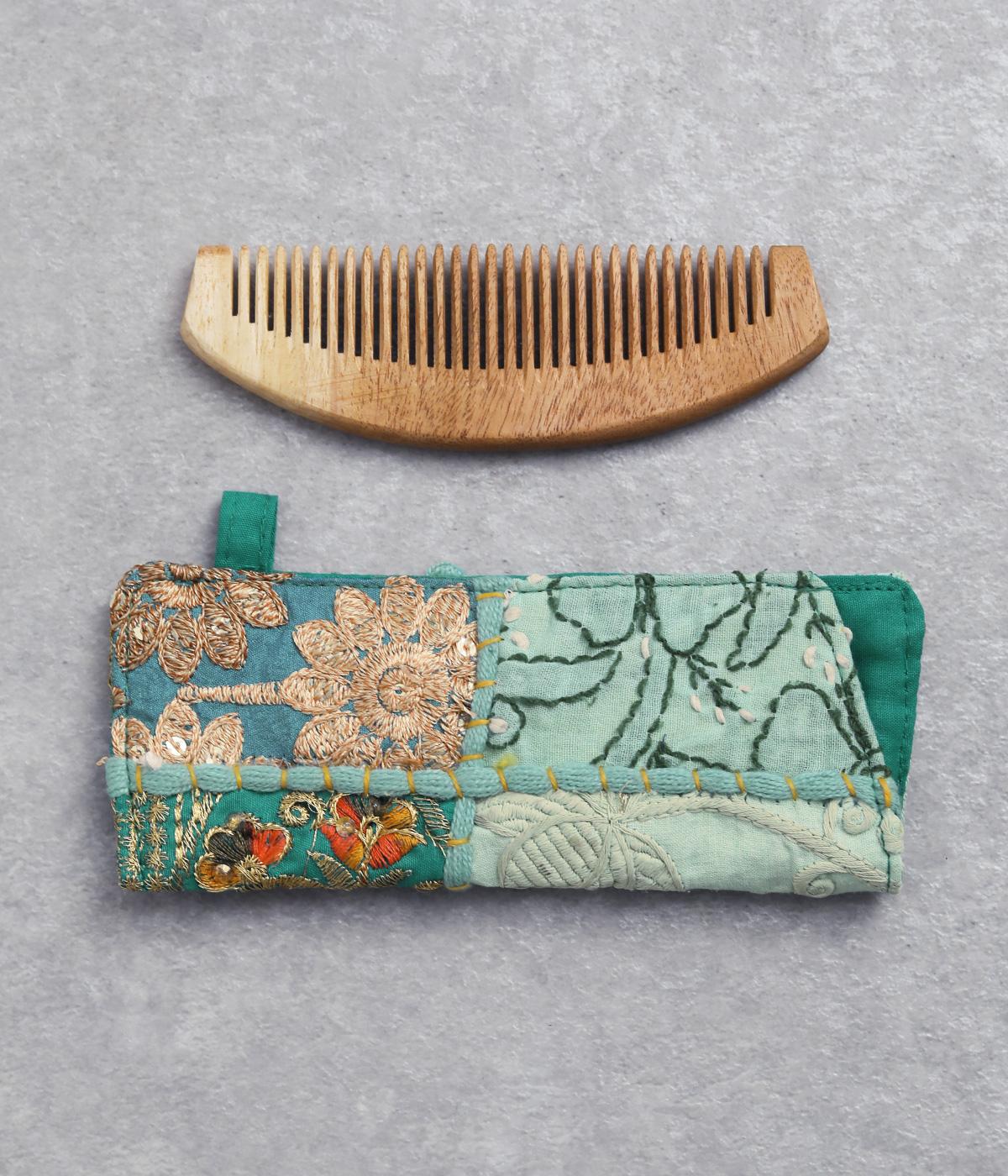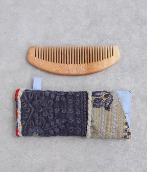 美髪効果も期待できるニームの樹で作られたコームと、手仕事ならではの色柄が魅力のパッチワークケースのセットです。マスタードオイル仕上げで髪を整える効果も。オンリーワンの特別感が日常にそっと華やぎを添えます。