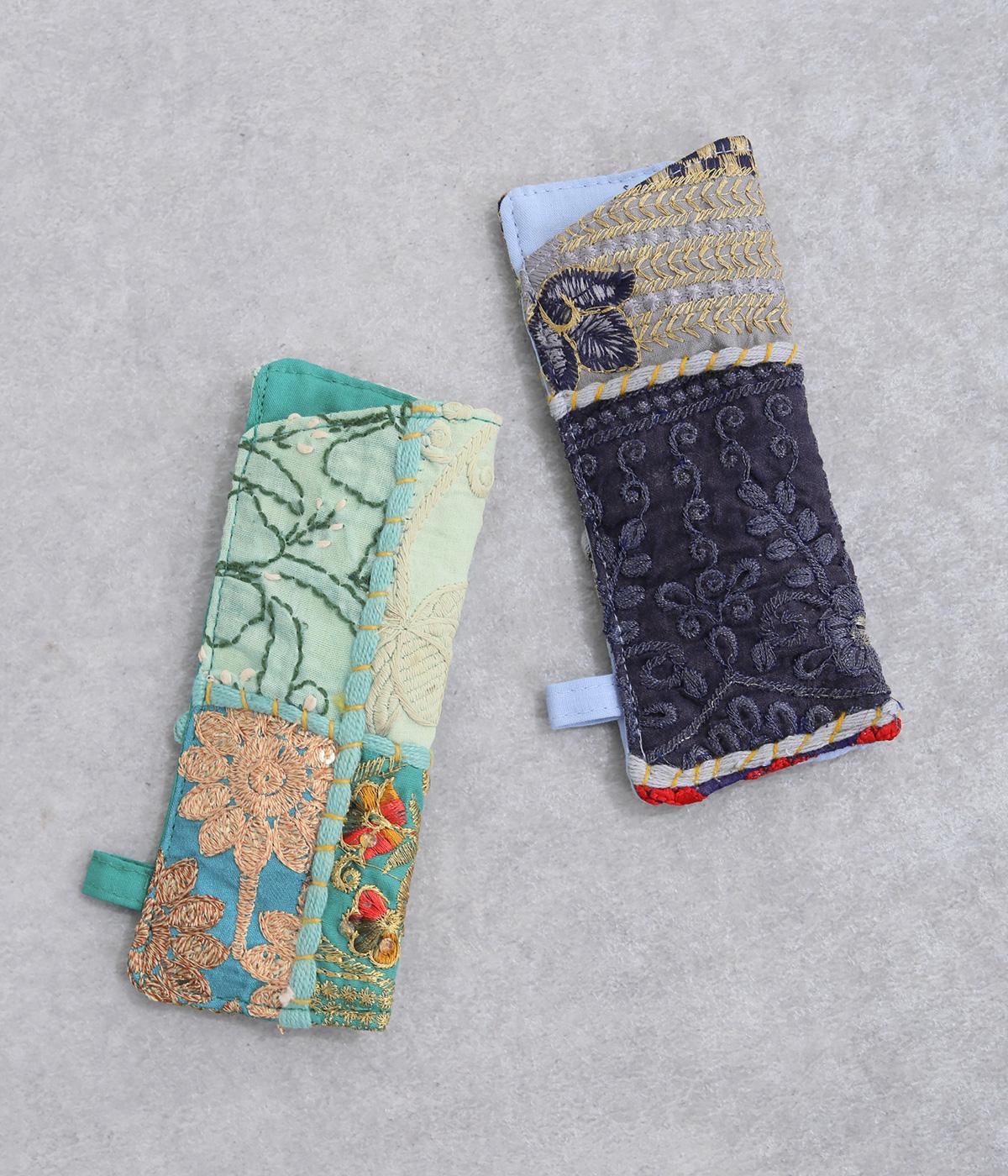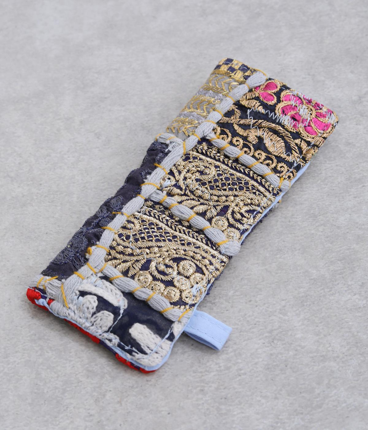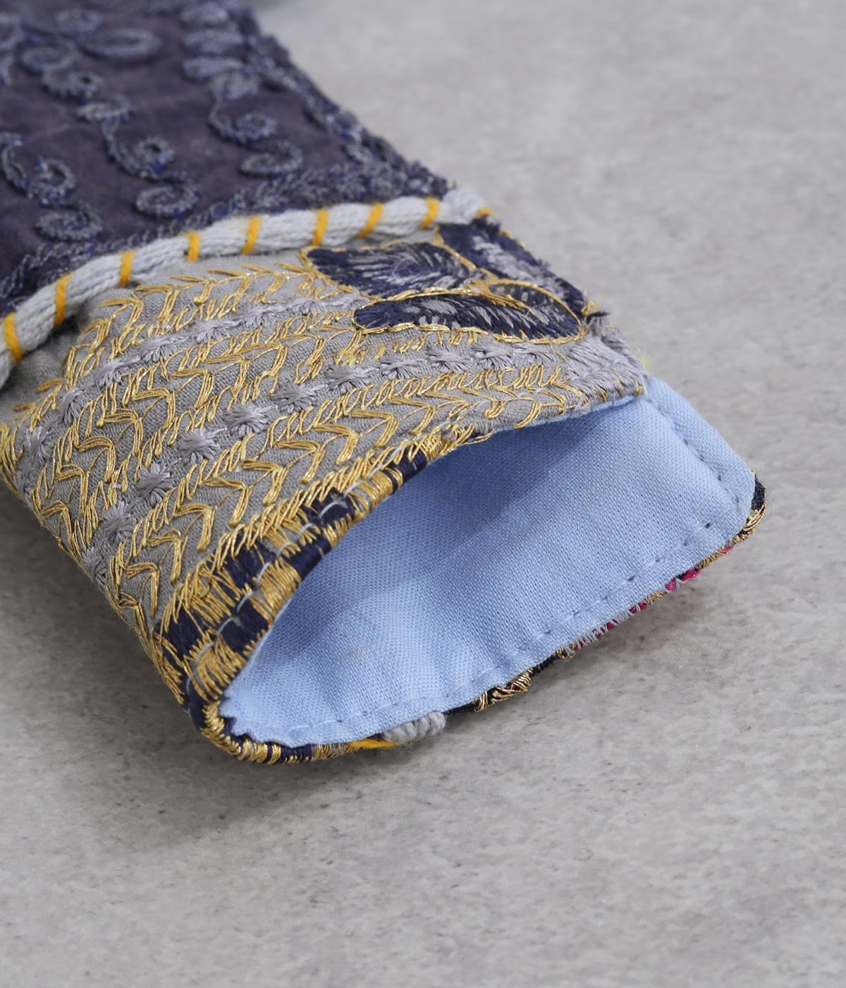 北インドの希少なヴィンテージ布を丁寧に手でつなぎ合わせた生地。華やかな刺しゅうやビーズの立体感があり、手に取るたび温かみを感じられます。