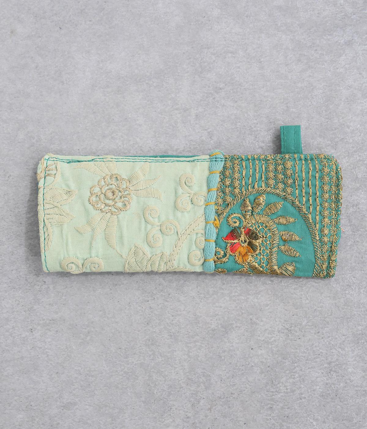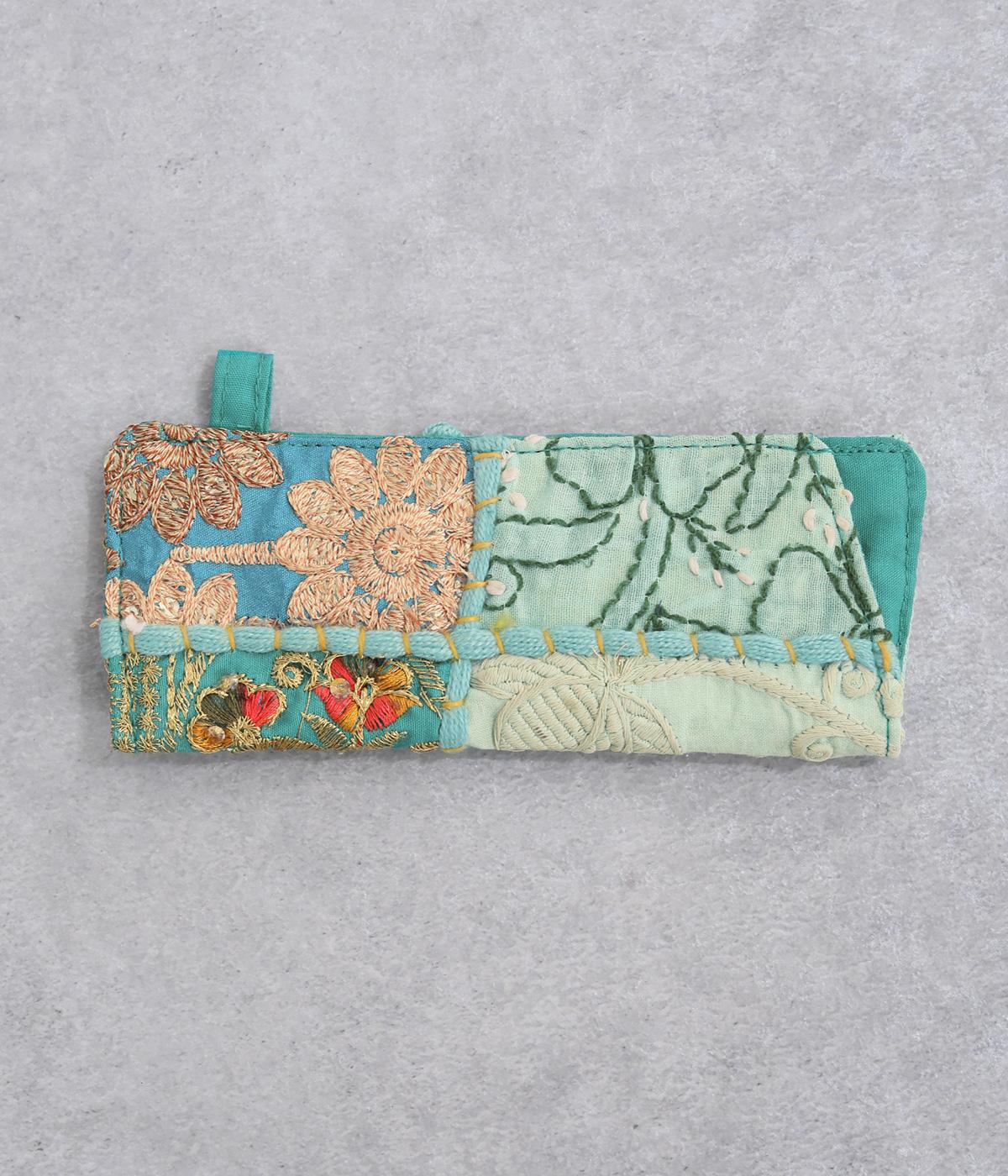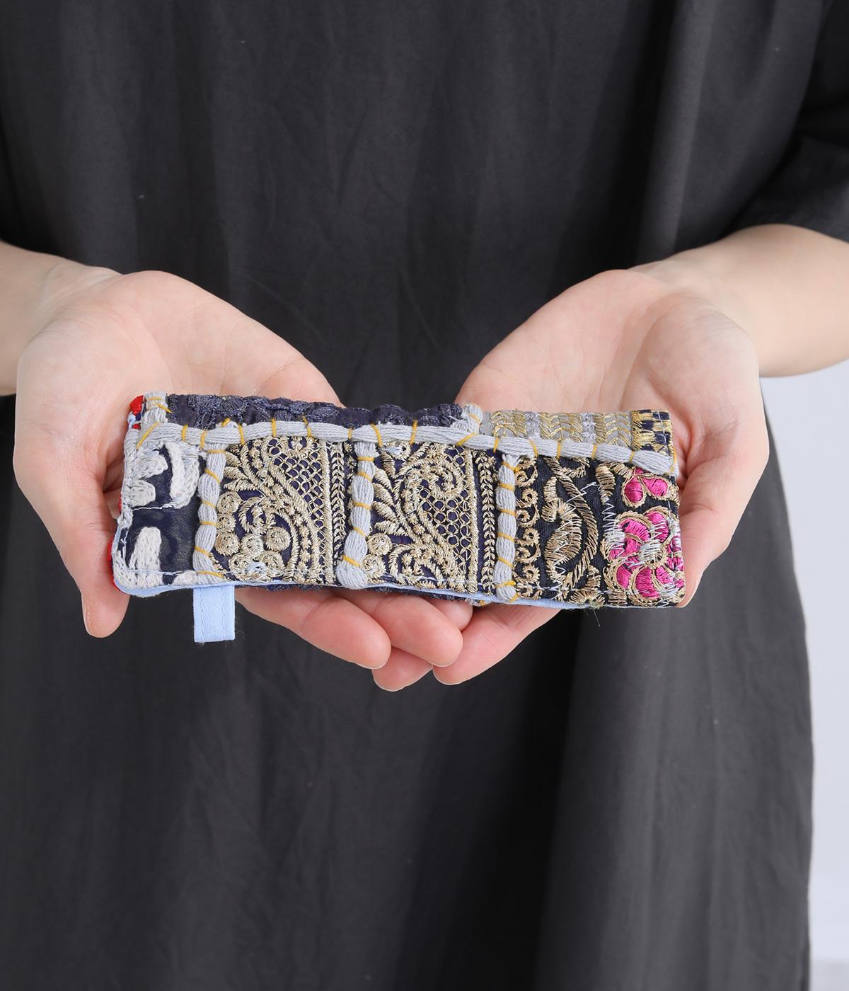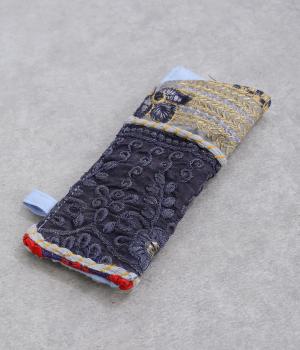 北インドの希少なヴィンテージ布を丁寧に手でつなぎ合わせた生地。華やかな刺しゅうやビーズの立体感があり、手に取るたび温かみを感じられます。