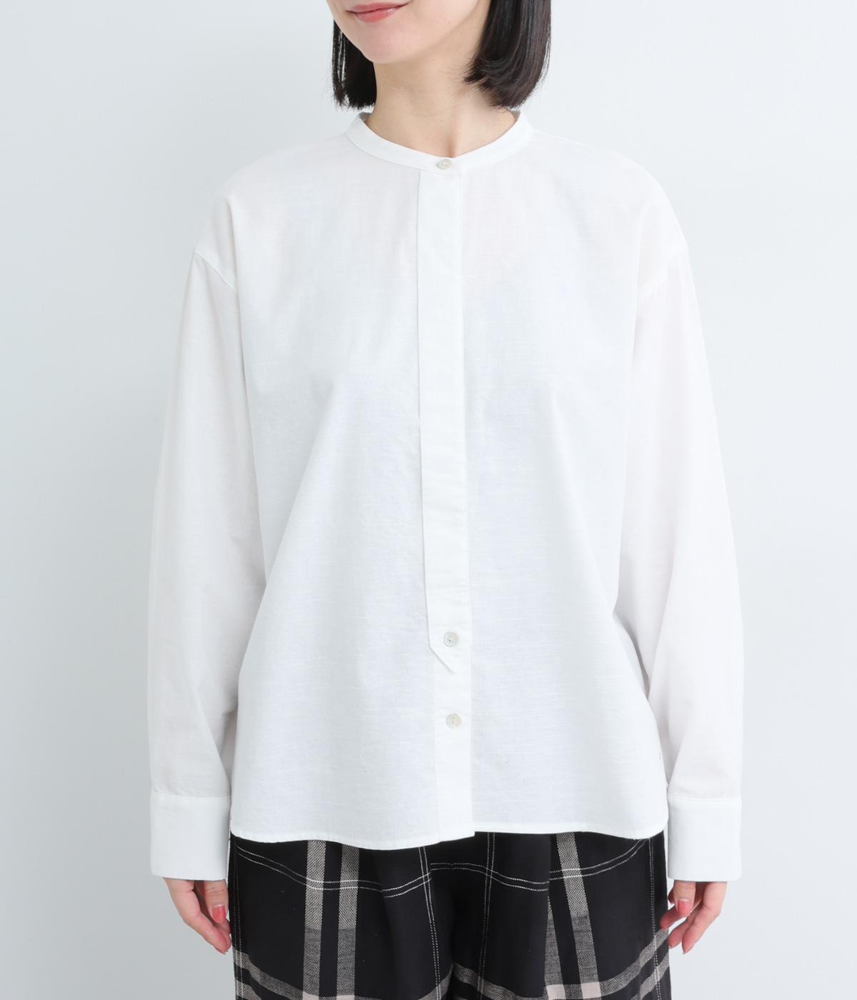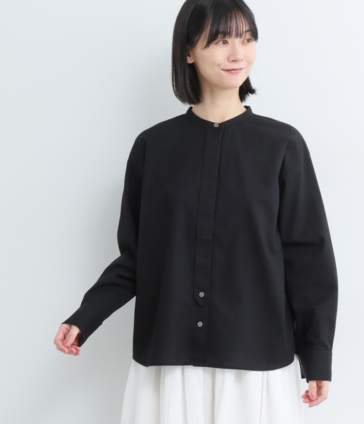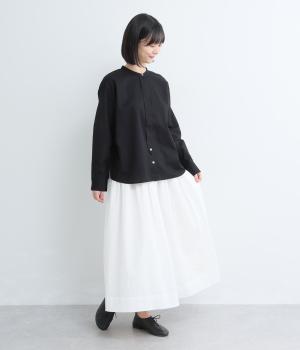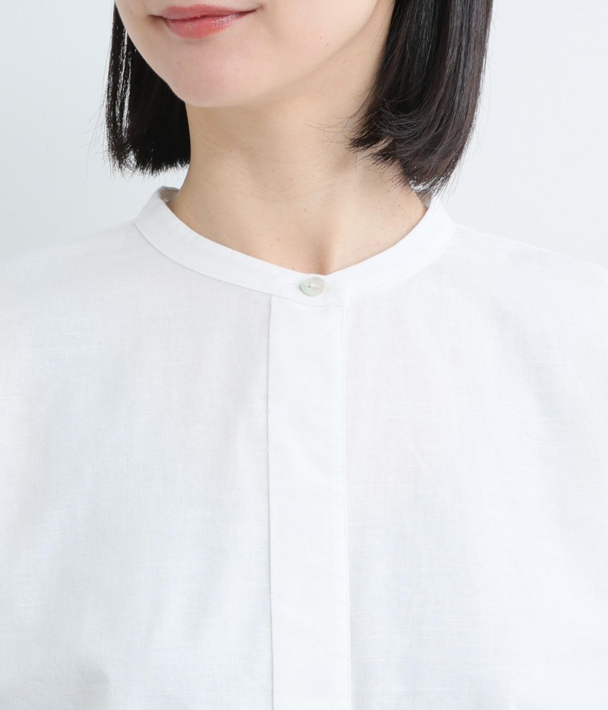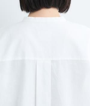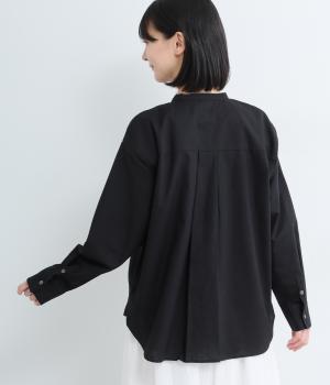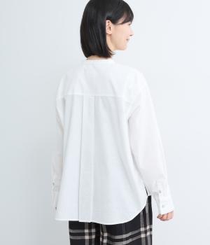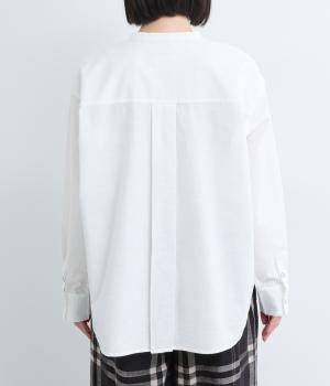 気持ちの良い素材感を活かし、バンドカラーですっきり仕立てました。部分比翼の前立てデザインにこだわり、きらりと光るシェルボタンがちょうどいいアクセントに。後ろ着丈を長くしたサイドスリット入りで、トップスアウトもお洒落見え。