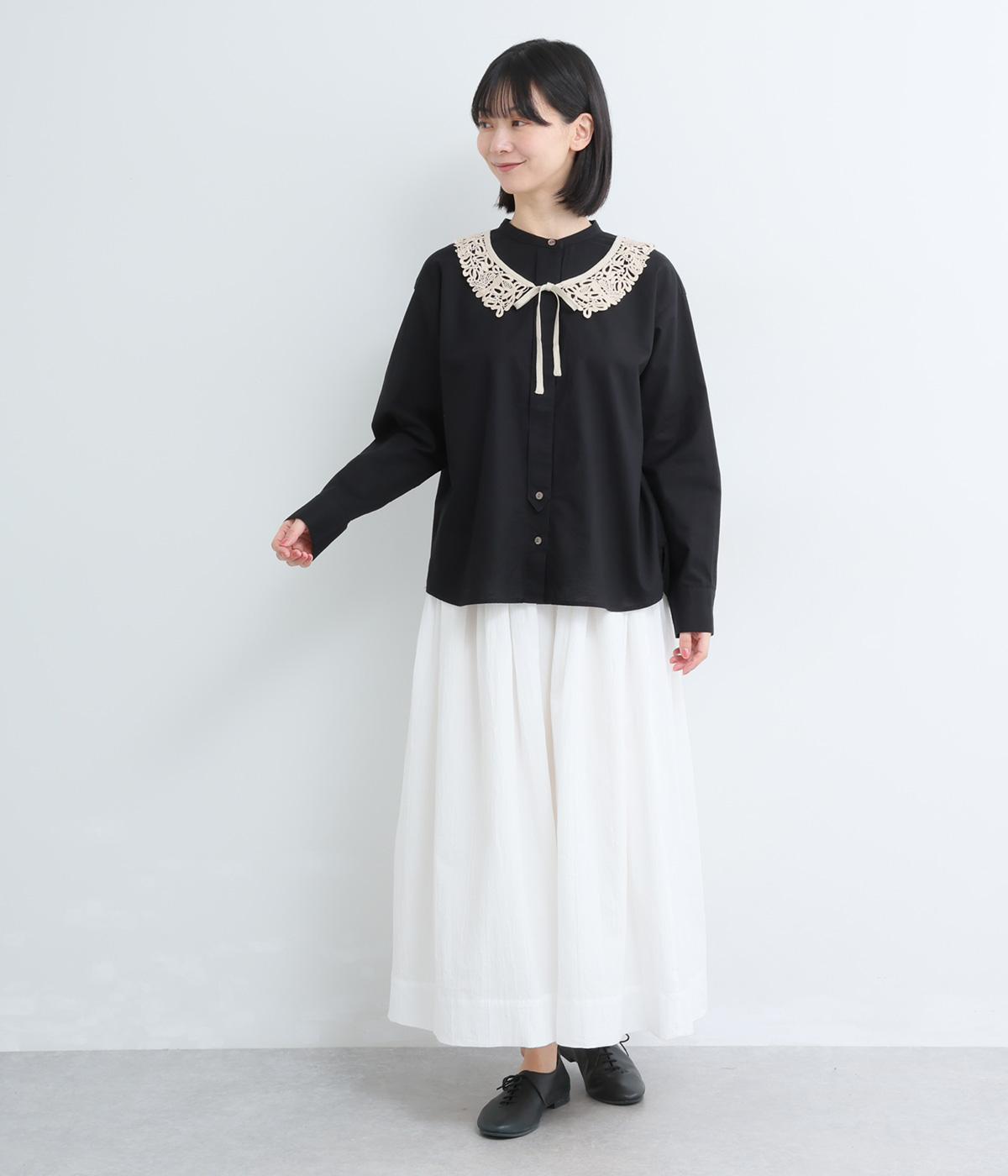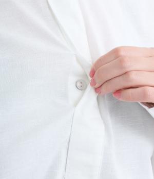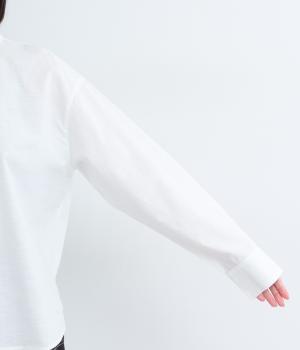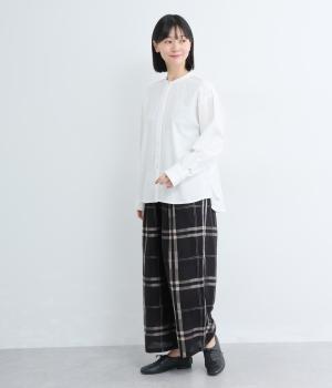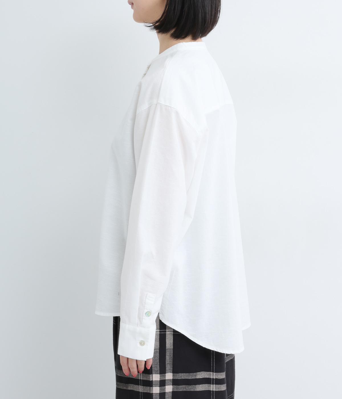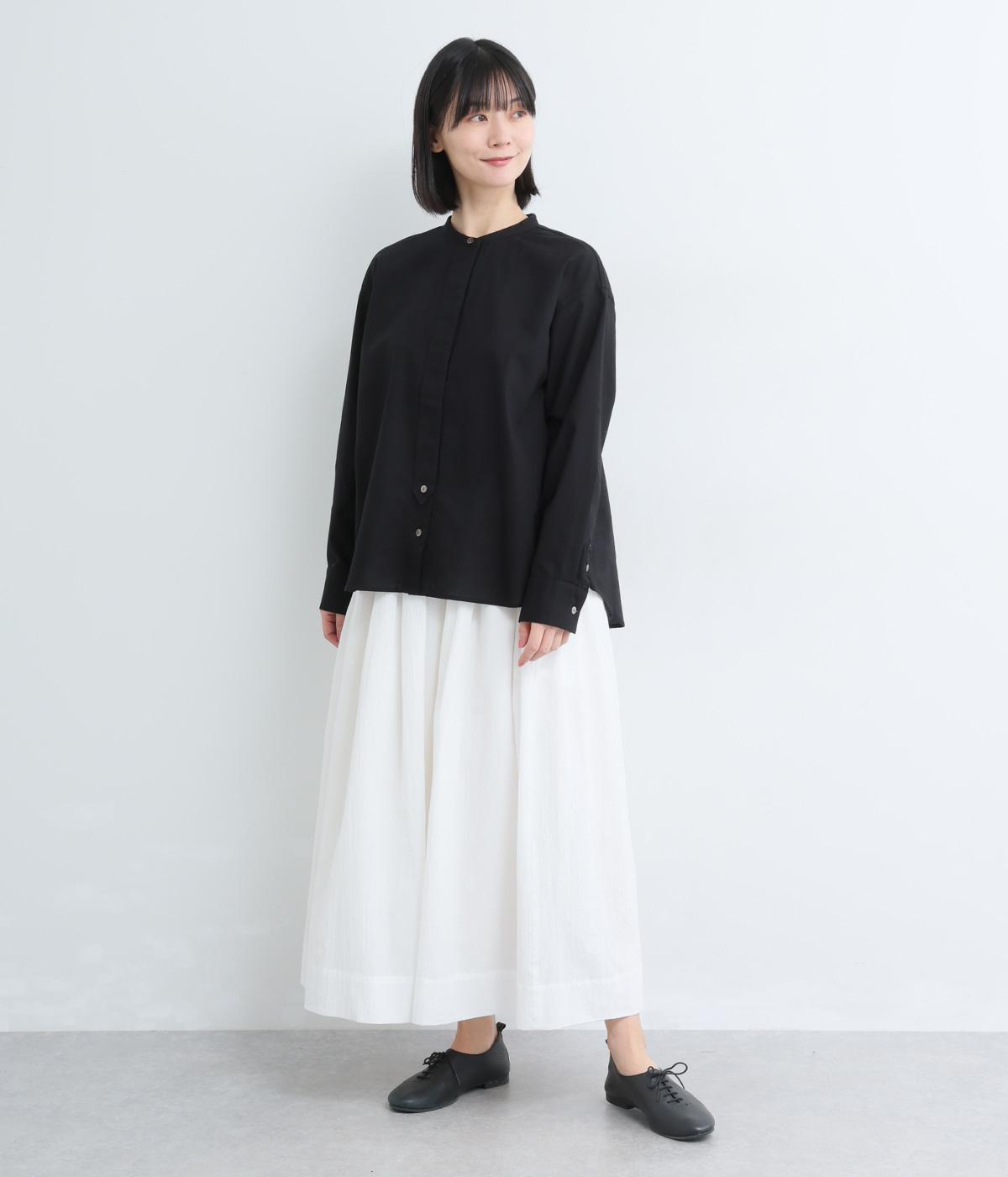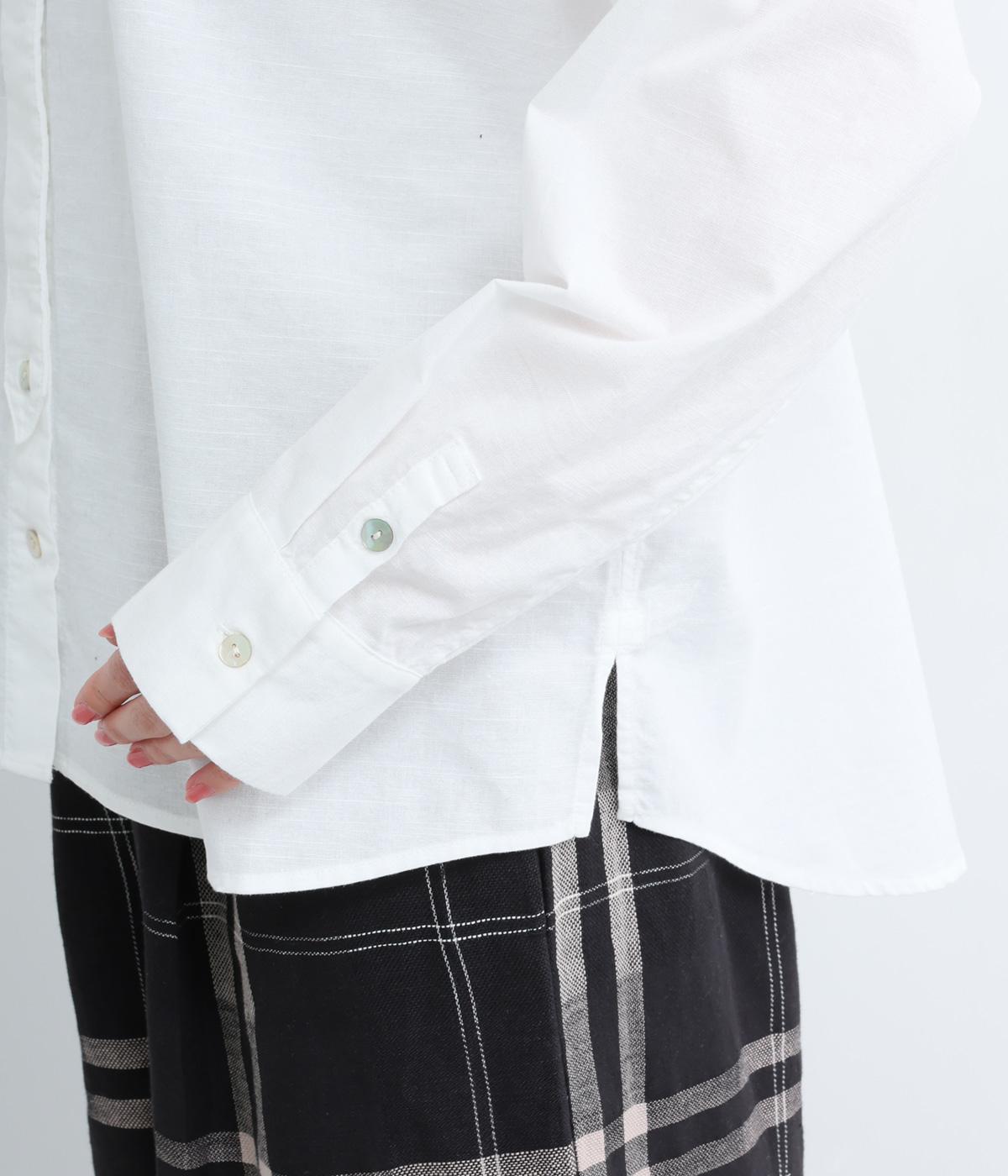 気持ちの良い素材感を活かし、バンドカラーですっきり仕立てました。部分比翼の前立てデザインにこだわり、きらりと光るシェルボタンがちょうどいいアクセントに。後ろ着丈を長くしたサイドスリット入りで、トップスアウトもお洒落見え。