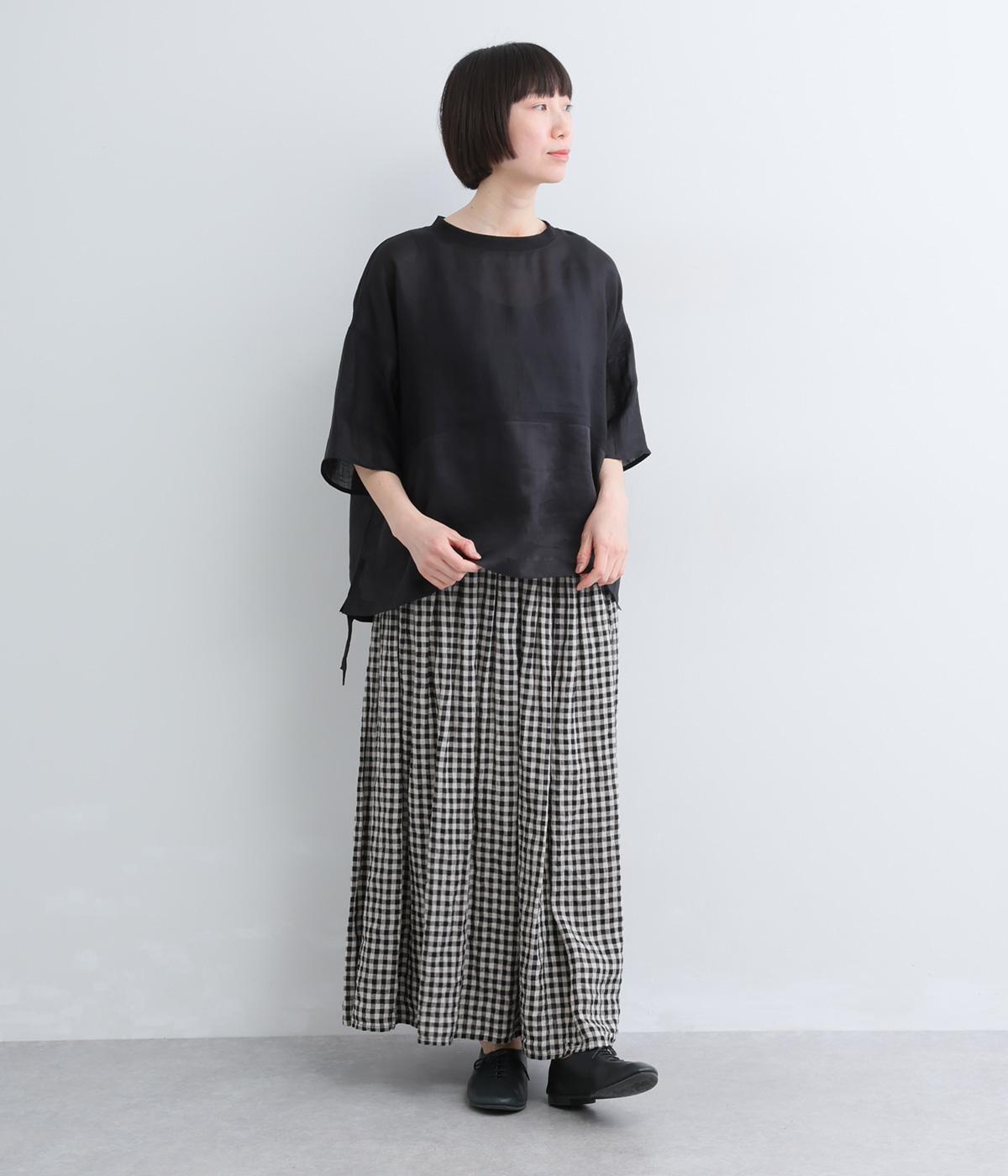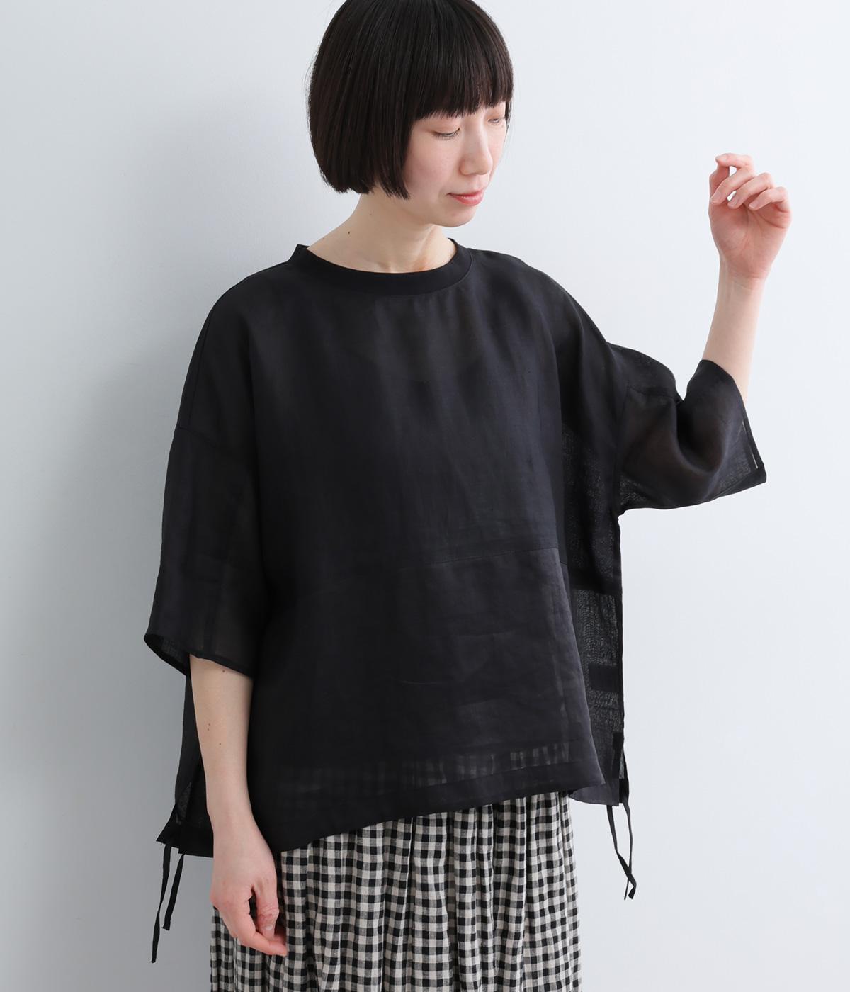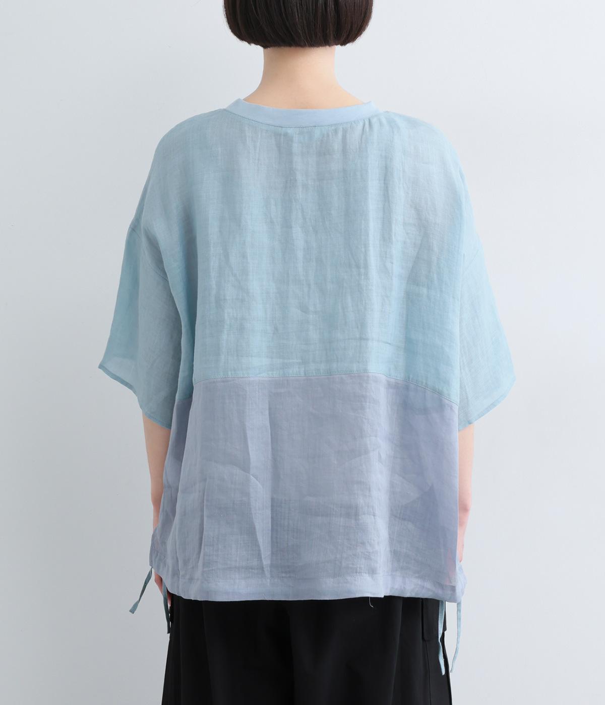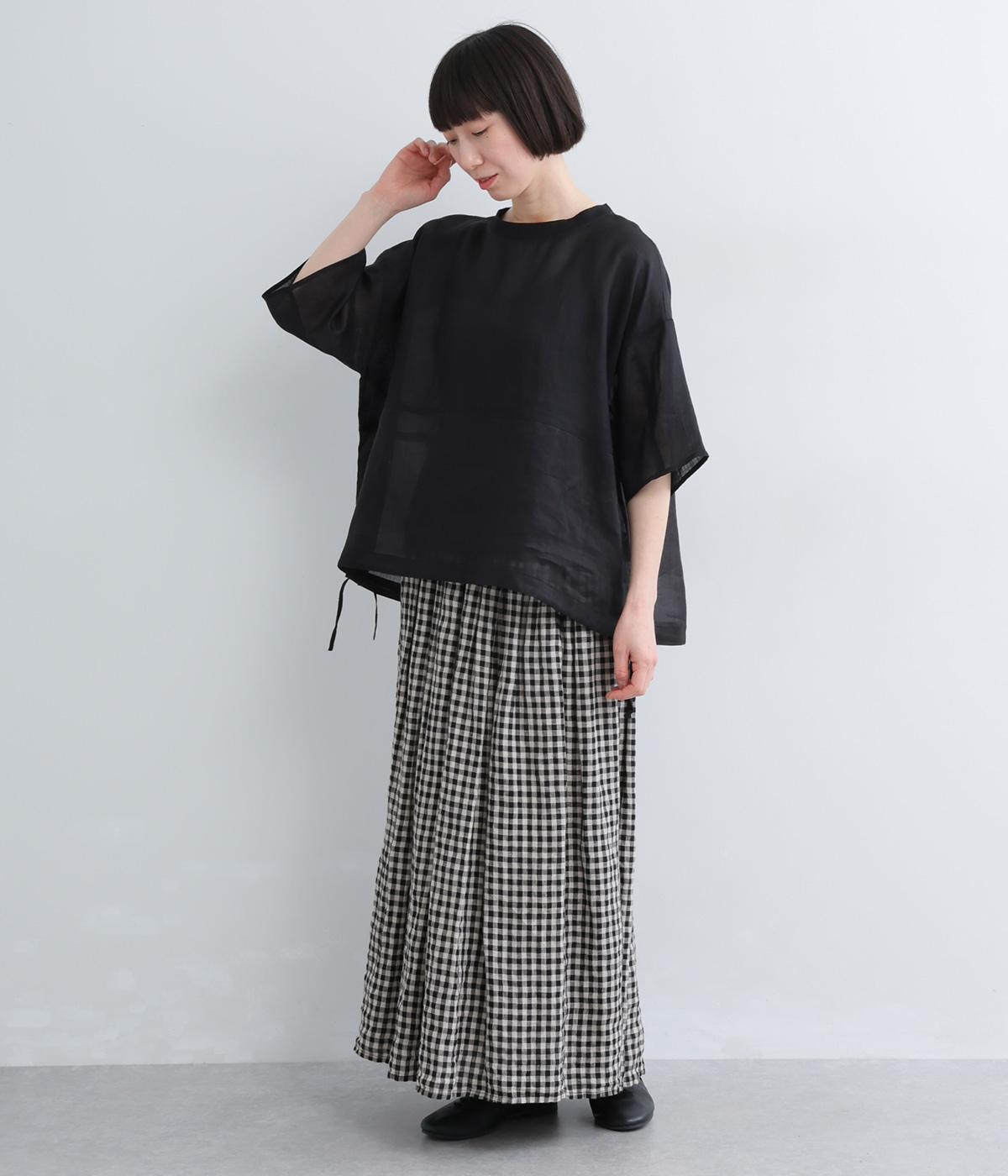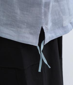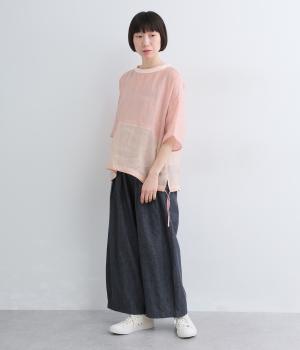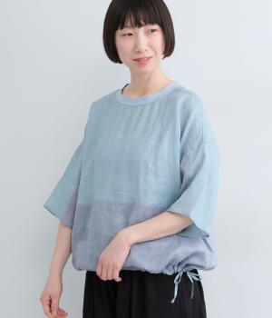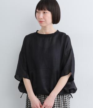 ゆったりとしたプルオーバーシャツは、そのまま着ればリラクシーに、裾のドロストコードをしぼればブラウジングしたような立体的なシルエットになります。シアー素材が適度な抜け感を生み、インナー合わせで奥行きのあるスタイリングが完成。