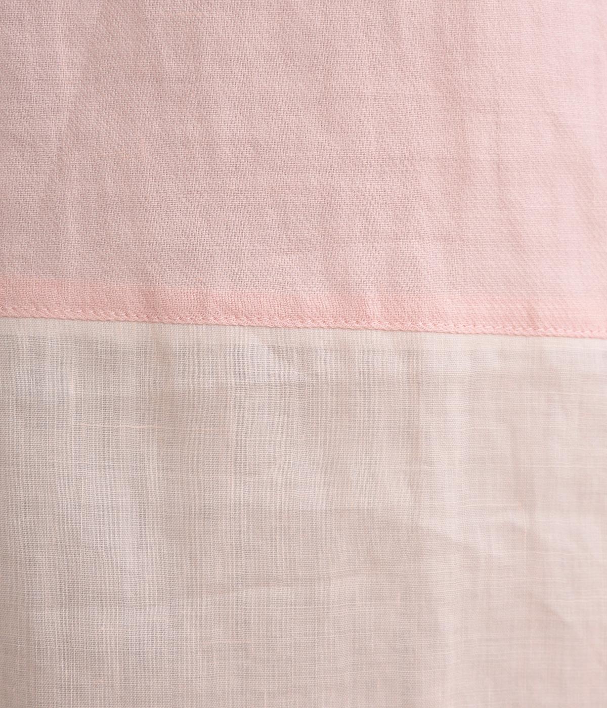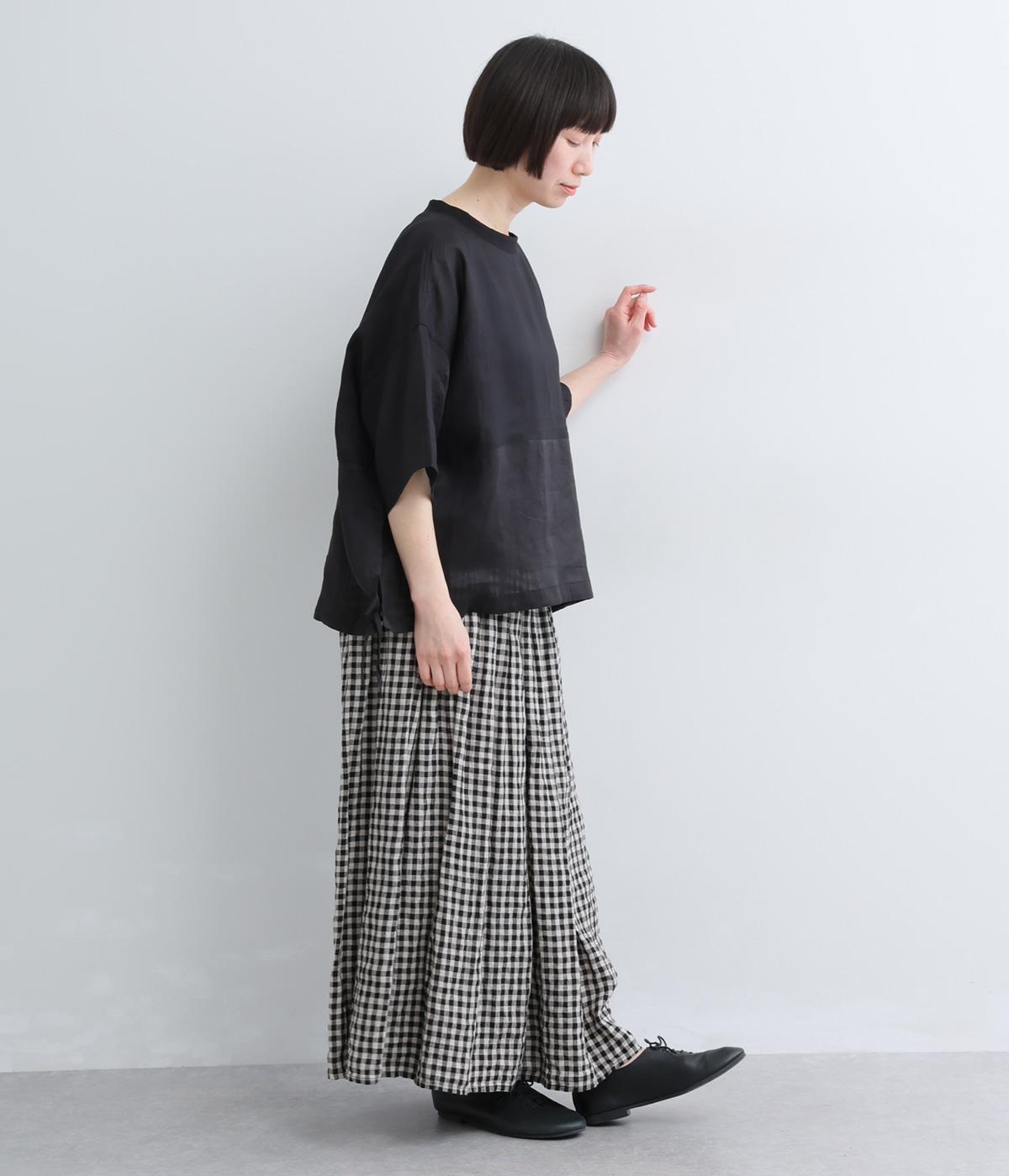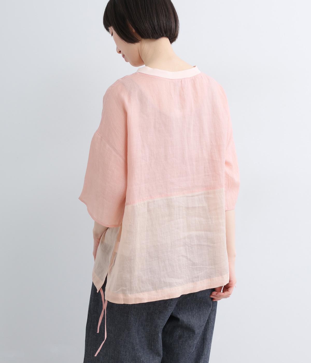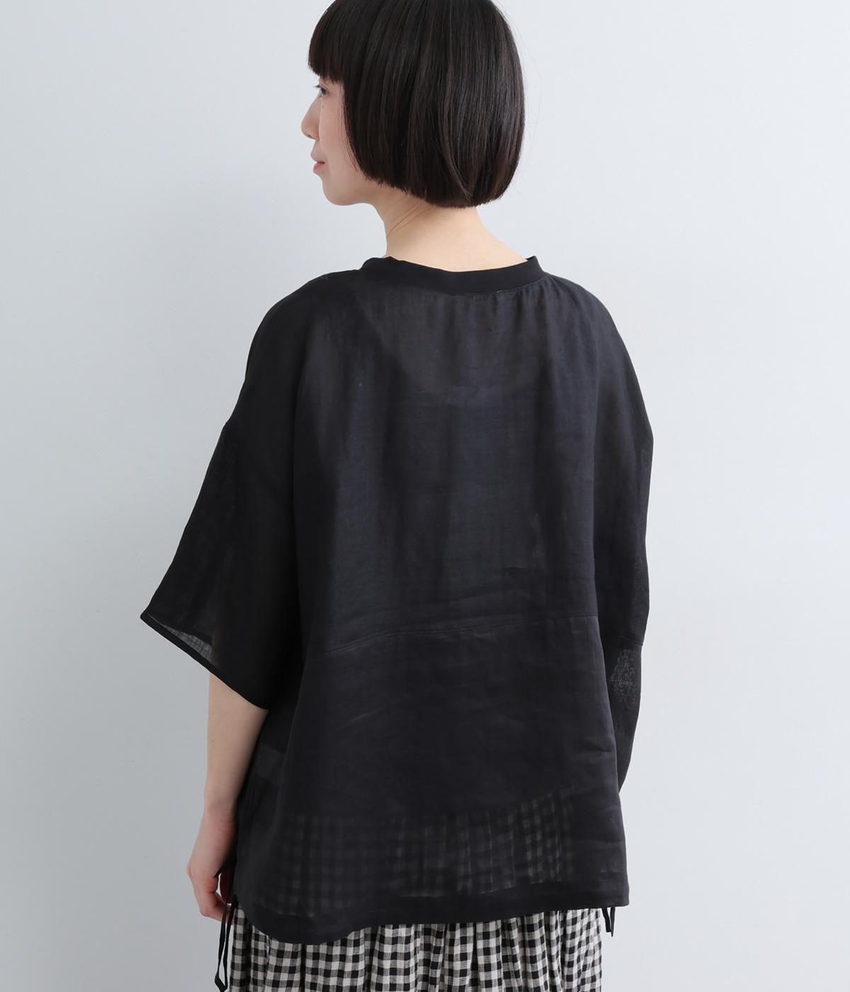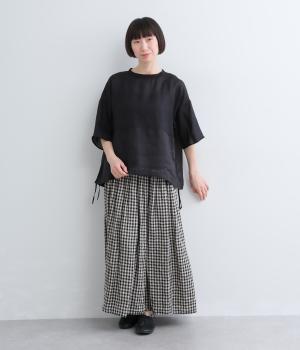 ゆったりとしたプルオーバーシャツは、そのまま着ればリラクシーに、裾のドロストコードをしぼればブラウジングしたような立体的なシルエットになります。シアー素材が適度な抜け感を生み、インナー合わせで奥行きのあるスタイリングが完成。