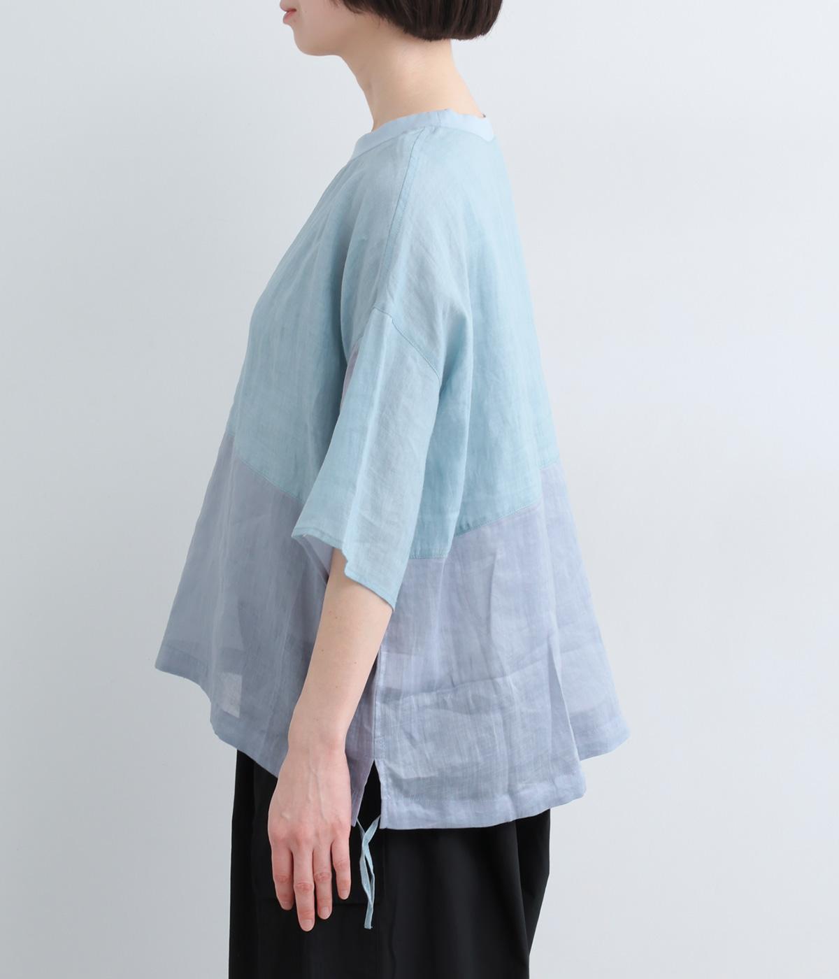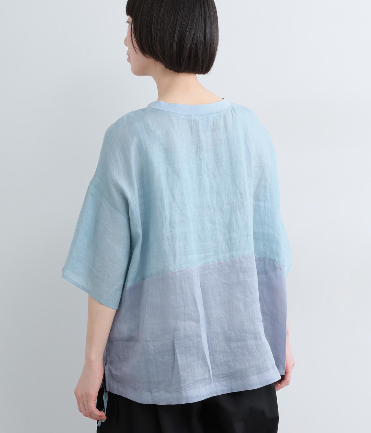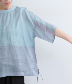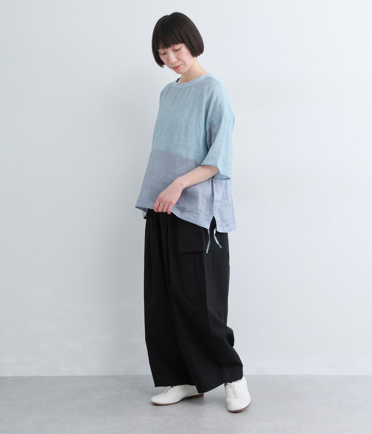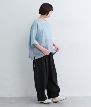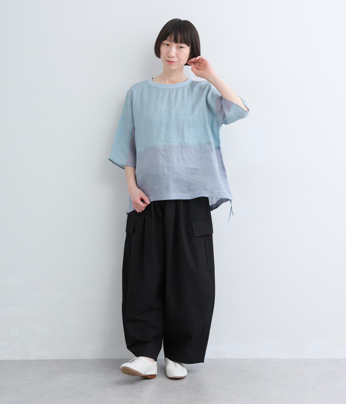 ドライでコシのある質感が特徴的なラミーツイル生地を使用しています。わずかにグラデーションをきかせた切り替えコンビがさり気なく表情をプラス。