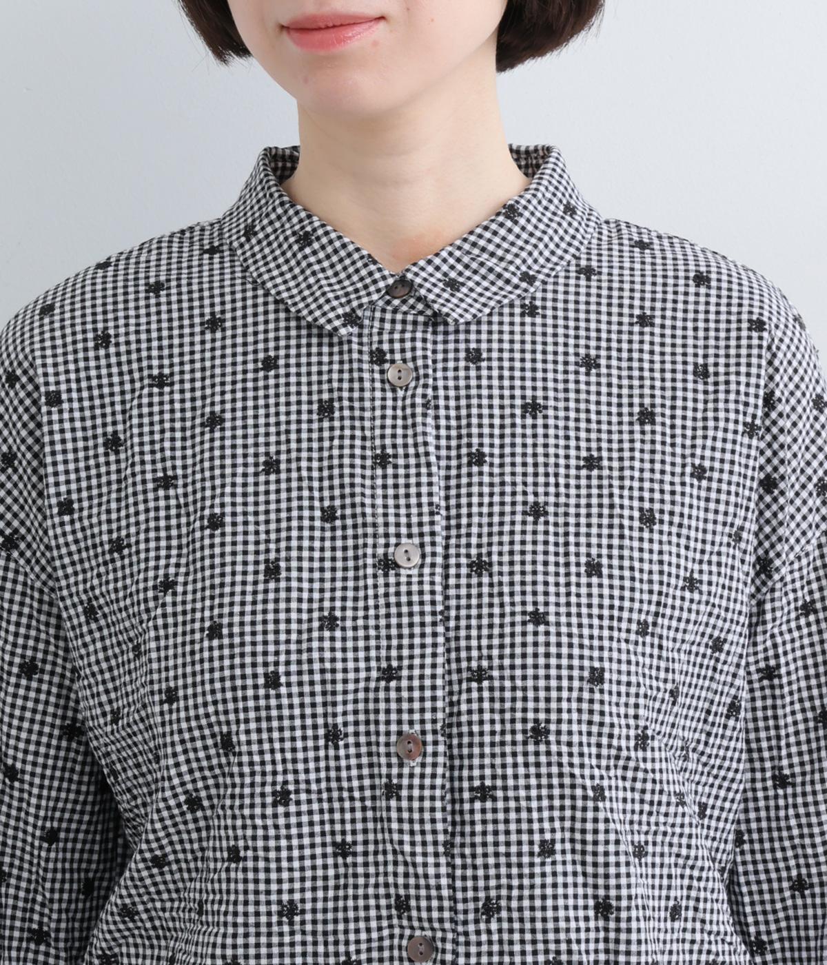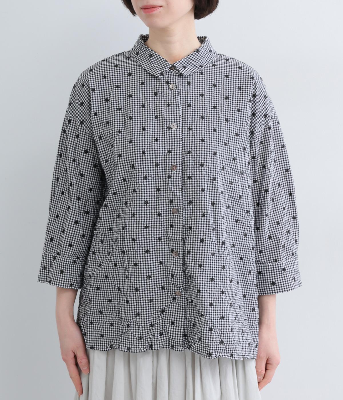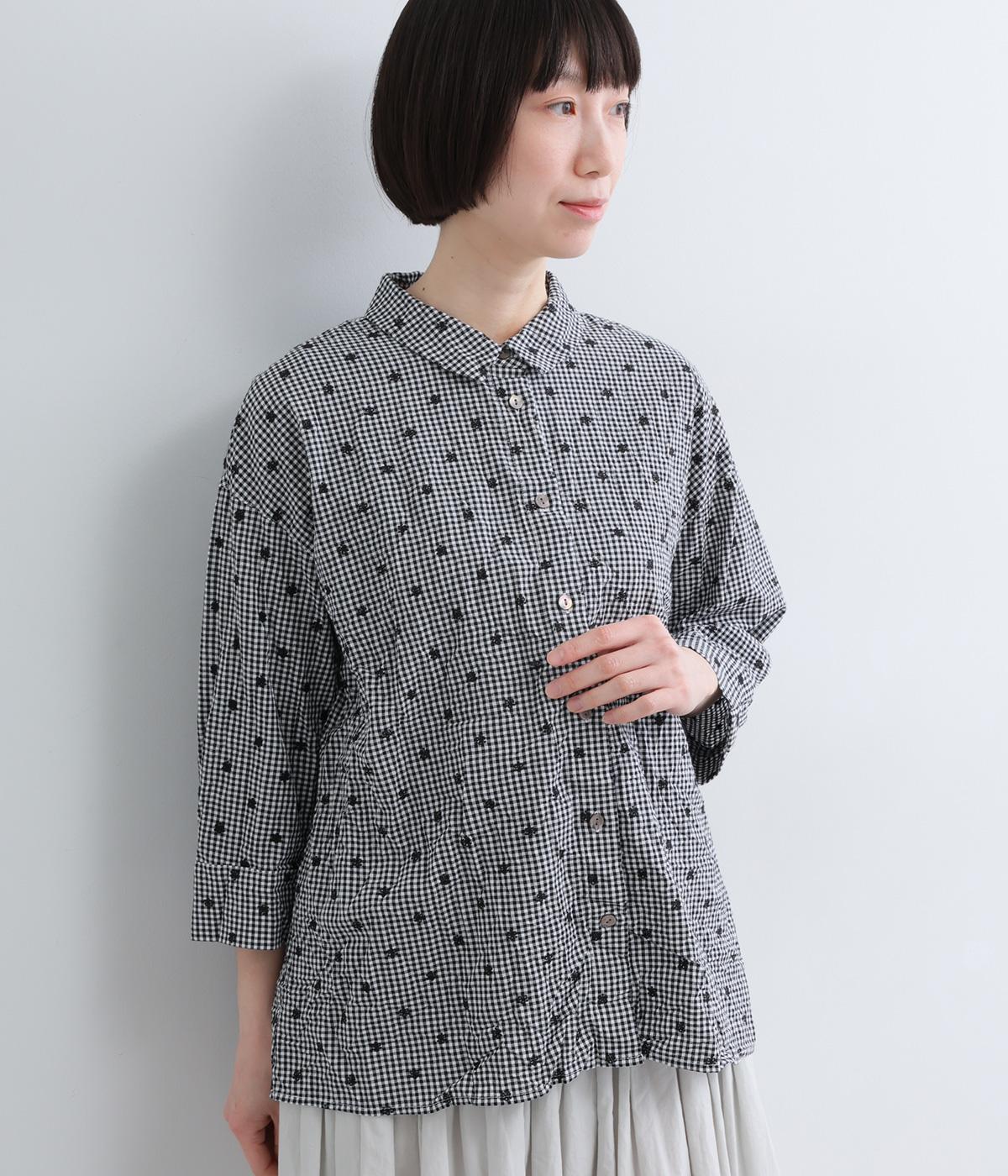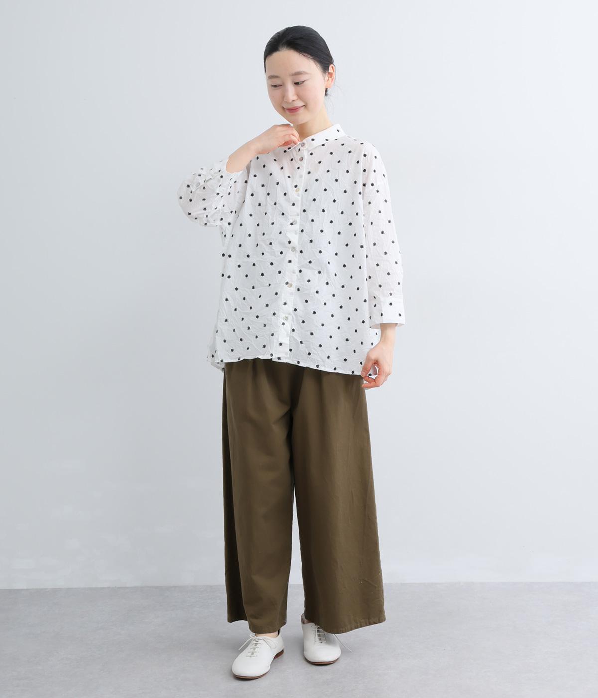 ナチュラル感が魅力のコットン生地に刺しゅうを加えてより着映え力を高めた一枚。ベーシックな襟つきシャツもワッシャー加工によっていつもとはちがった表情を魅せます。手首をすっきり見せた7分袖は折り返しても◎。きらりと光るシェルボタンがポイントに。