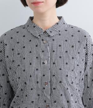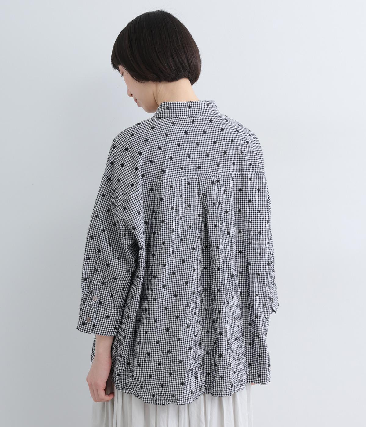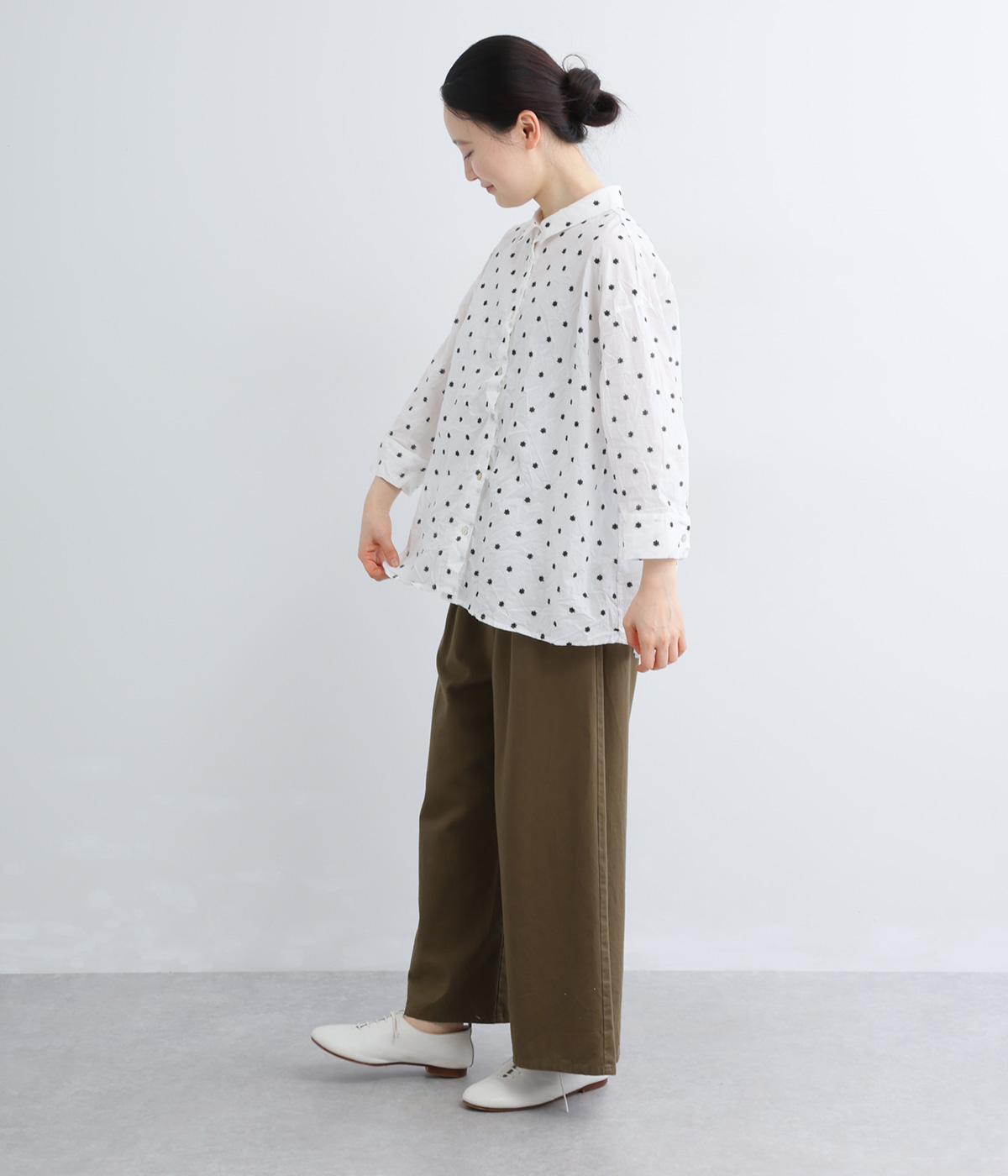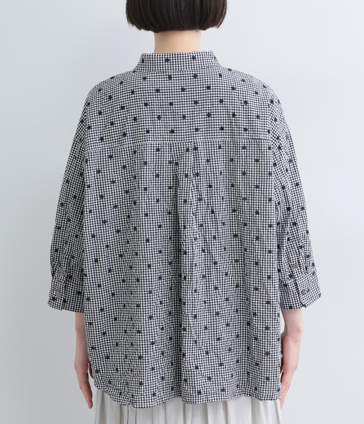 ナチュラル感が魅力のコットン生地に刺しゅうを加えてより着映え力を高めた一枚。ベーシックな襟つきシャツもワッシャー加工によっていつもとはちがった表情を魅せます。手首をすっきり見せた7分袖は折り返しても◎。きらりと光るシェルボタンがポイントに。