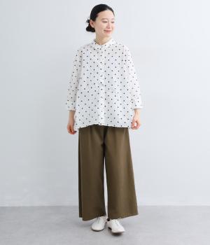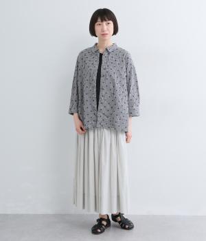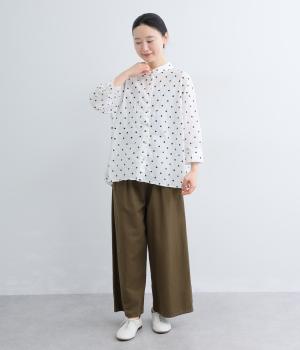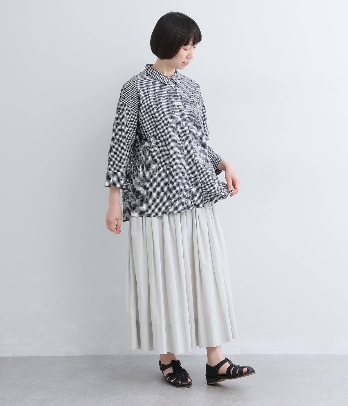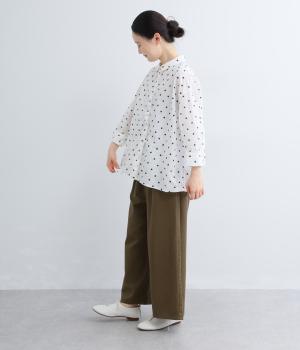 さらりと軽やかなコットン生地にキャッチワッシャー加工をほどこして自然なシワ感とソフトな風合いを加えました。やや薄手ながらもふくらみがあり、心地よい着用感を運びます。