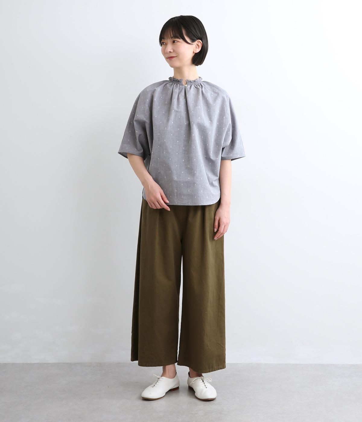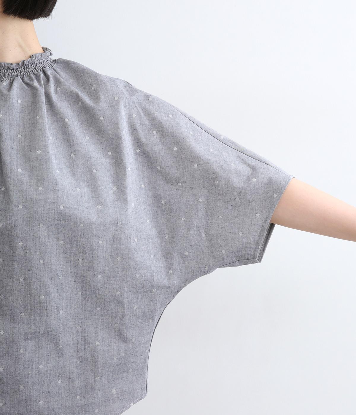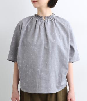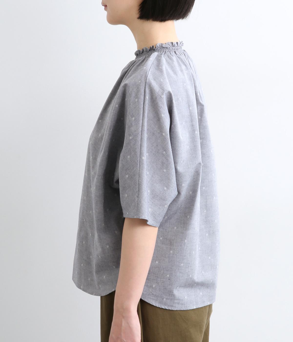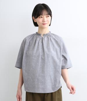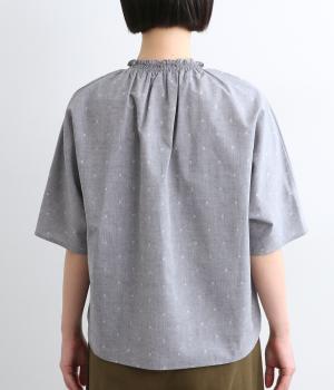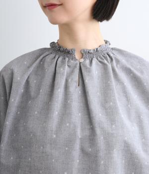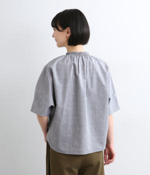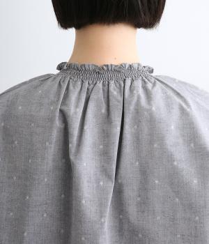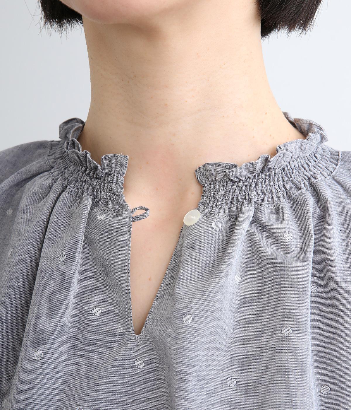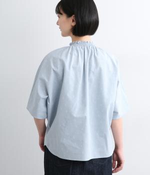 シャーリングを寄せたフリルカラーの甘さと生地の持つさわやかさのバランスが良い一枚。身幅にゆとりを持たせたドルマンスリーブは、体のラインを拾いにくく着心地も抜群。後ろ裾をラウンドさせて全体のシルエットをきれいに見せています。