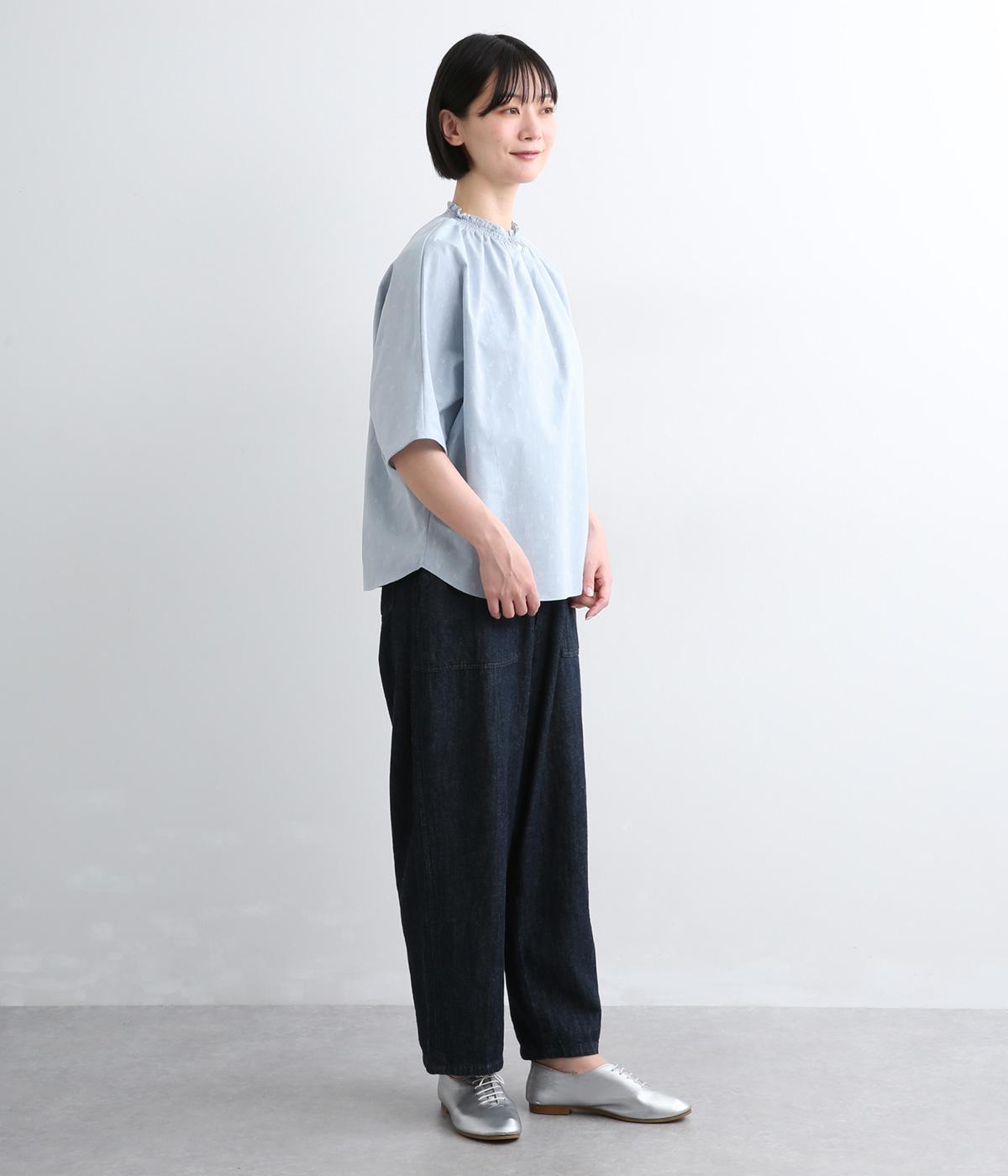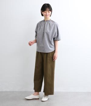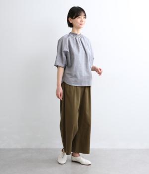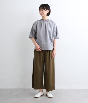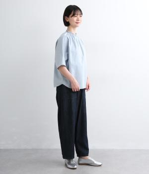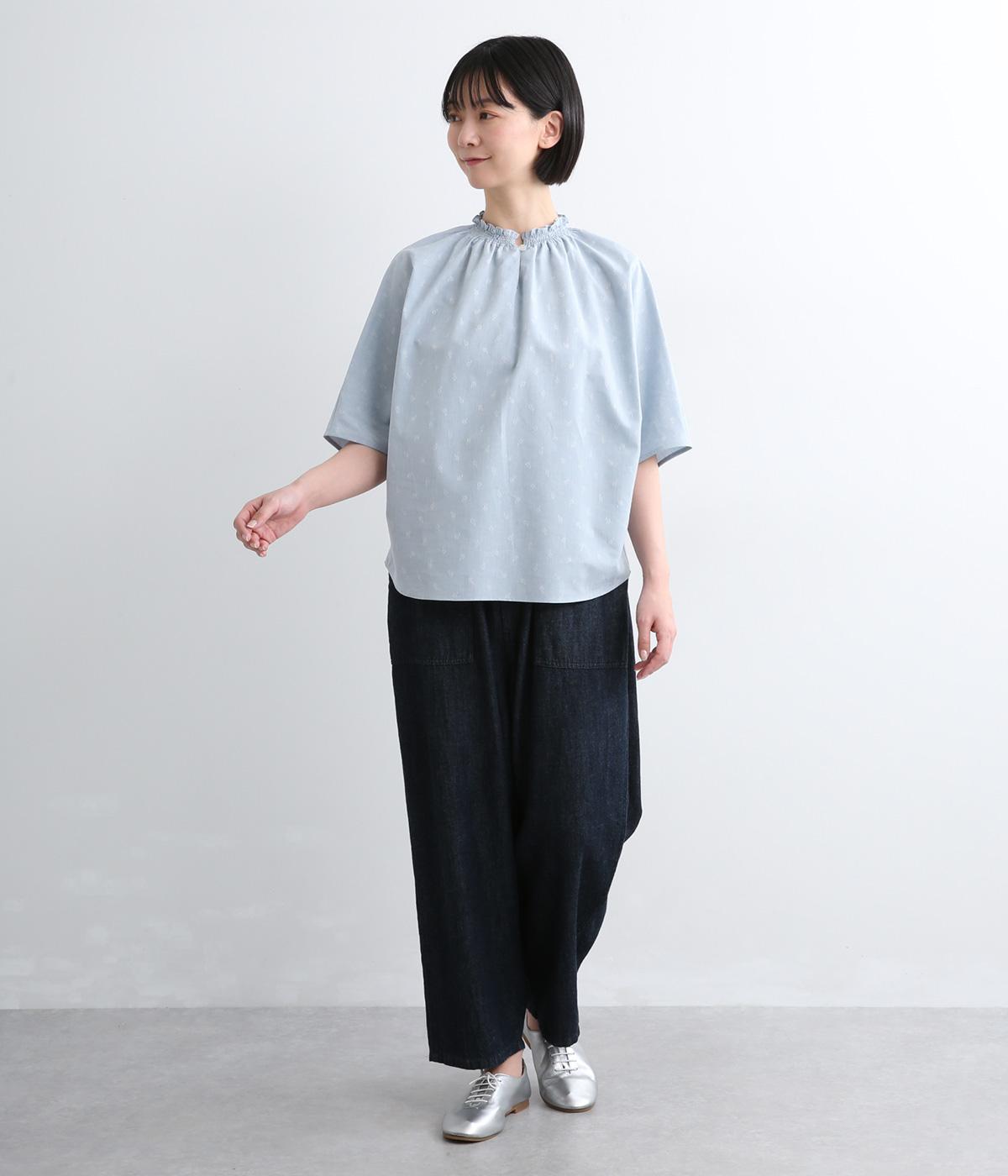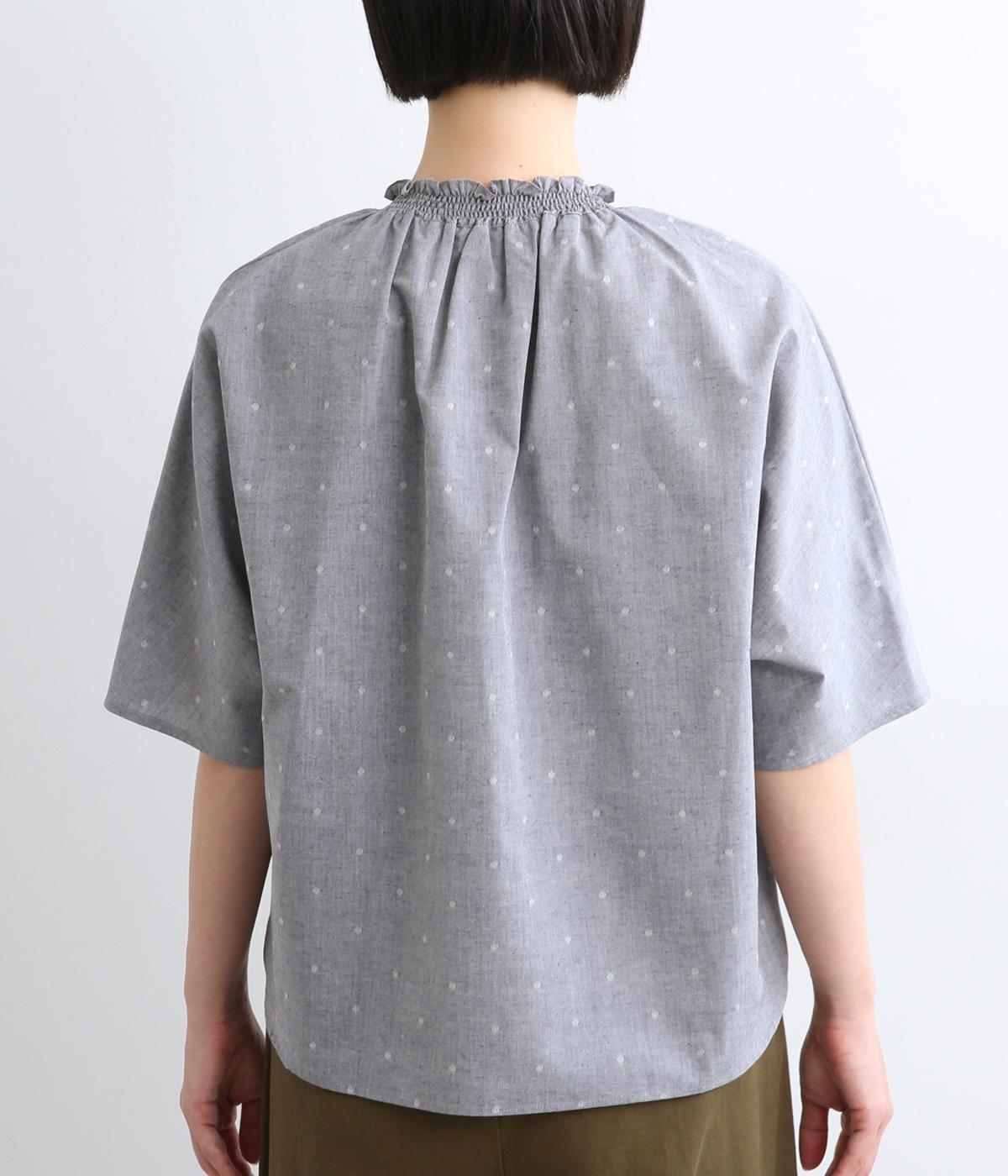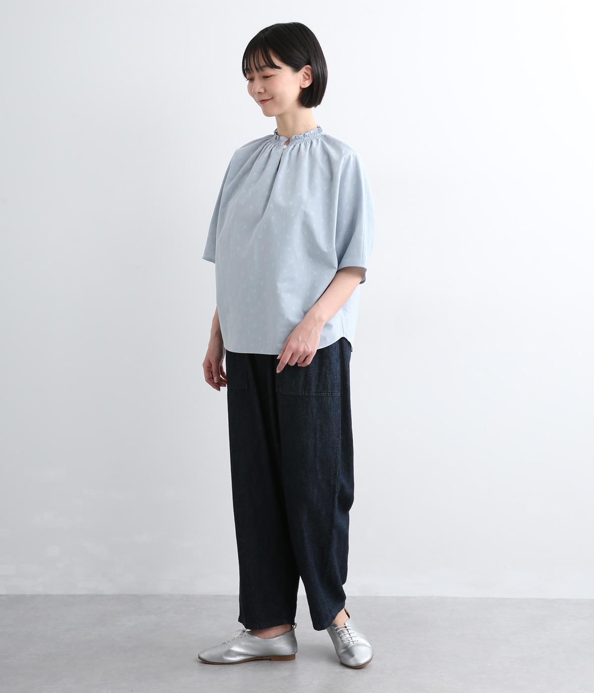 シャーリングを寄せたフリルカラーの甘さと生地の持つさわやかさのバランスが良い一枚。身幅にゆとりを持たせたドルマンスリーブは、体のラインを拾いにくく着心地も抜群。後ろ裾をラウンドさせて全体のシルエットをきれいに見せています。