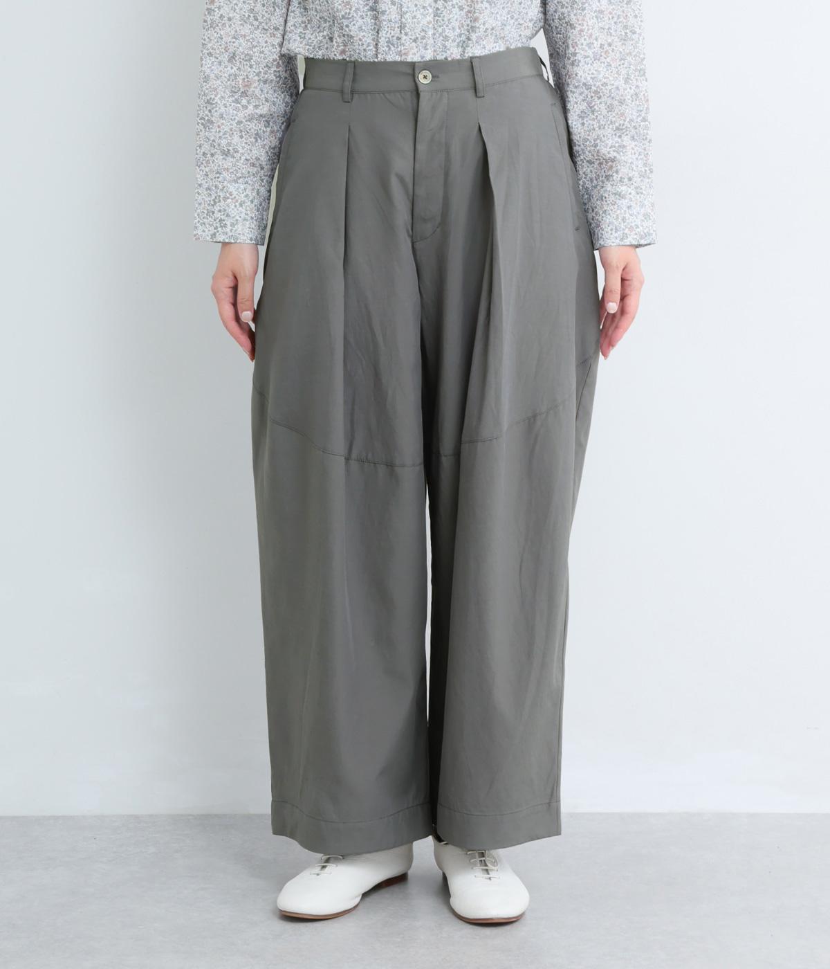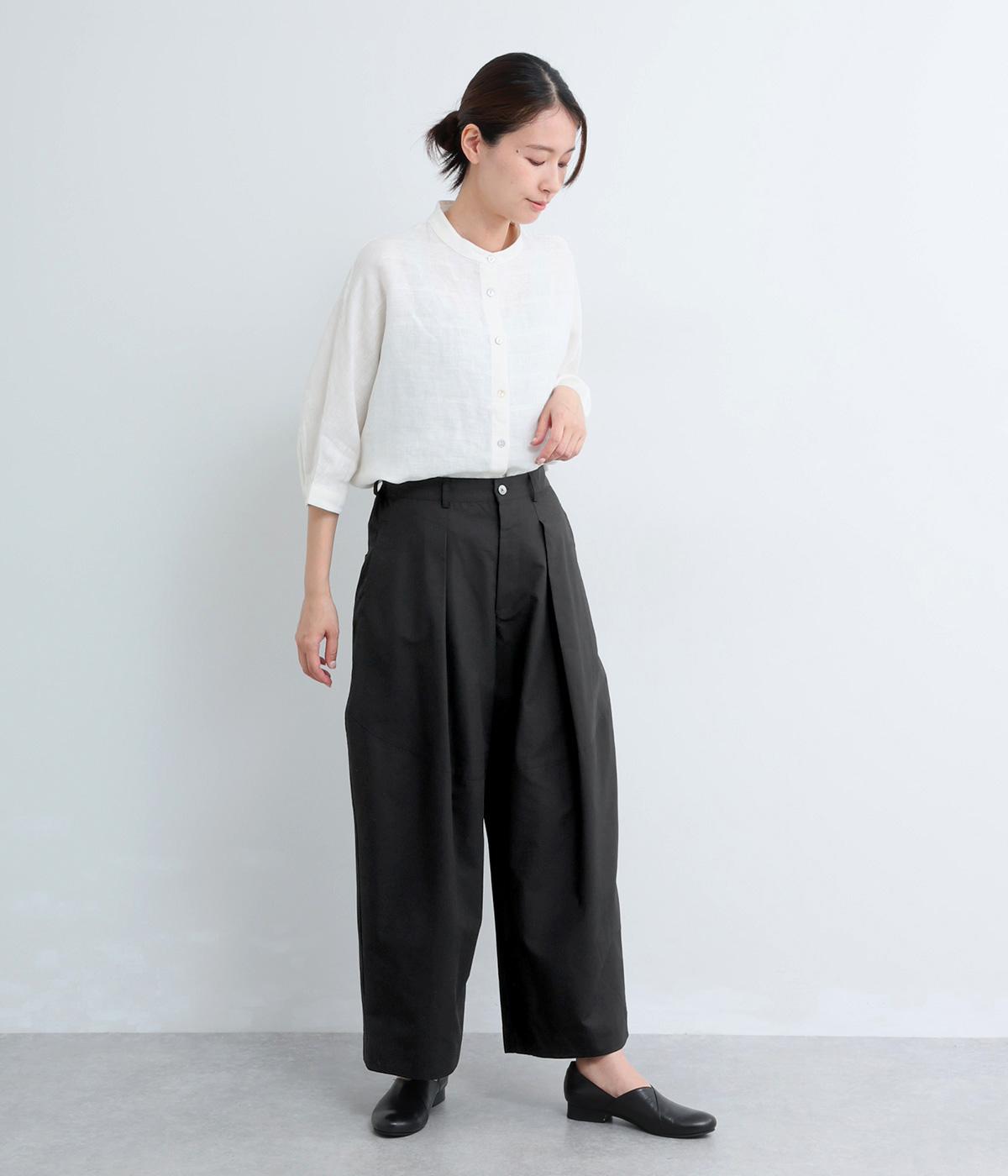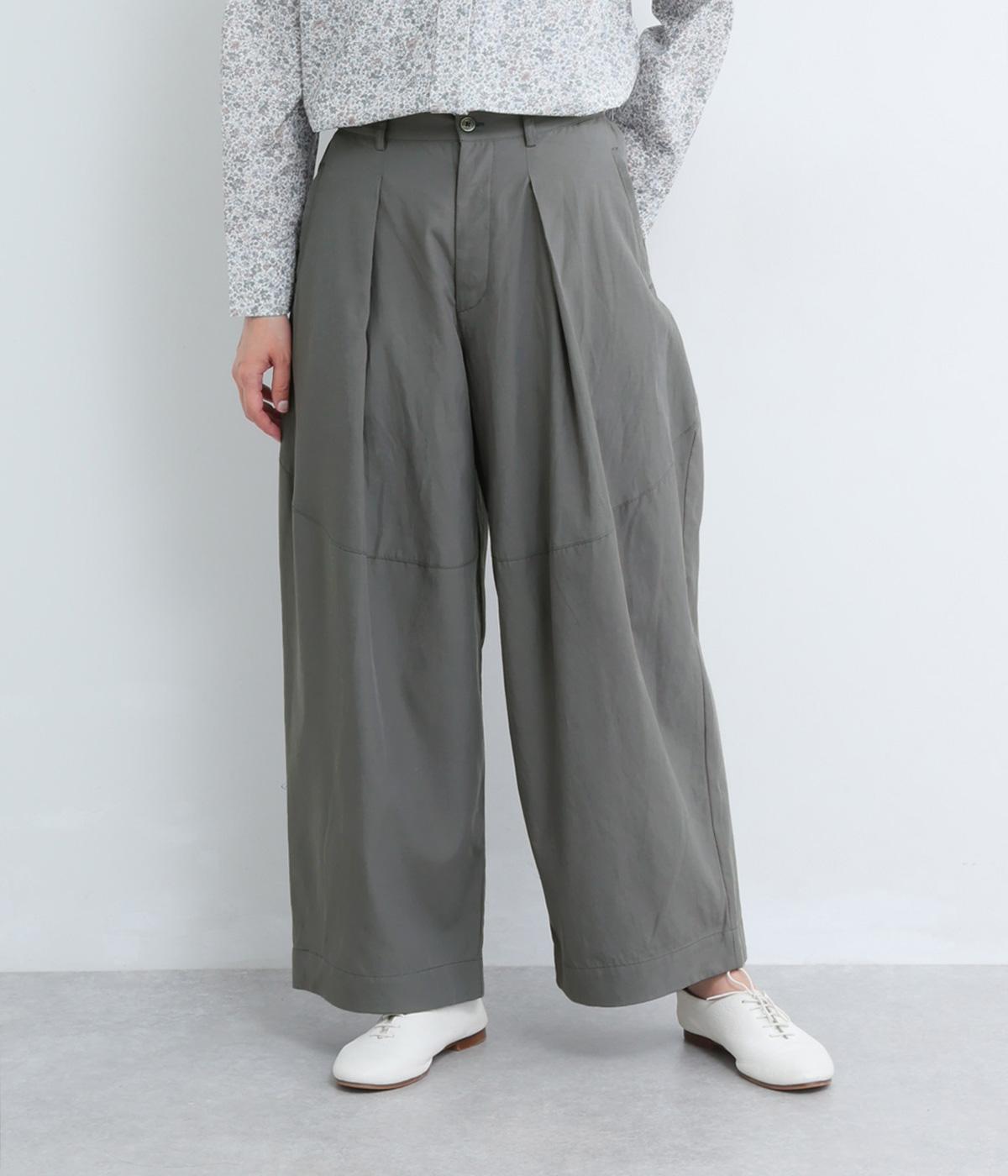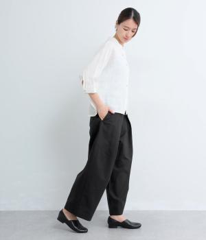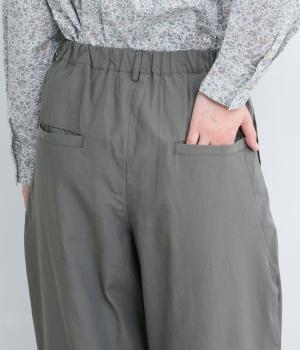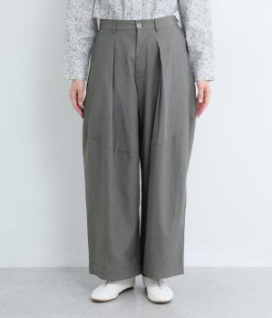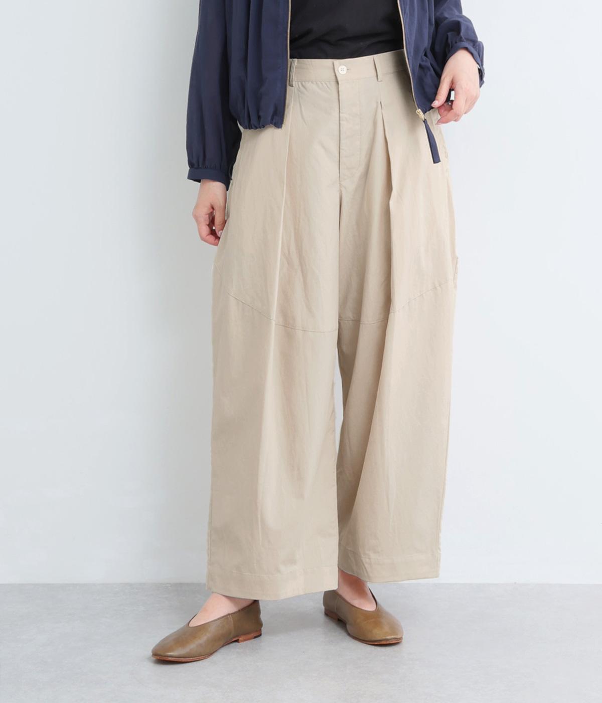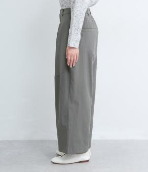 タックを入れてウエストからひざにかけてフレア感を出し、裾に向けて丸みを帯びたコクーンシルエットが特徴。ボタンフライの前あき仕様でおなかまわりをすっきり見せ、後ろウエストゴム仕様でフィット感も◎。きれいめな装いにも活躍する一本です。