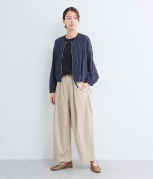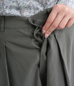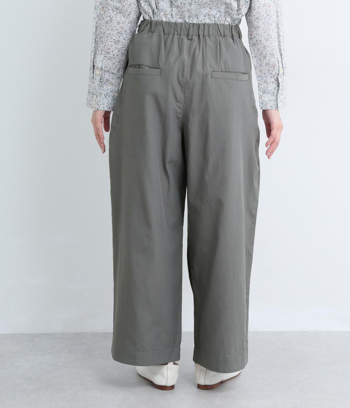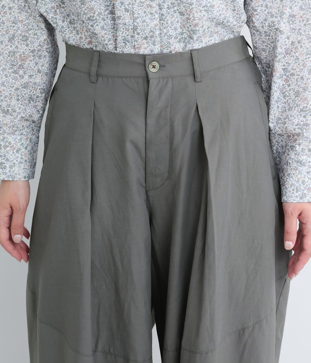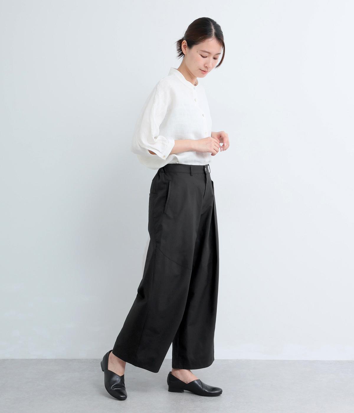 タックを入れてウエストからひざにかけてフレア感を出し、裾に向けて丸みを帯びたコクーンシルエットが特徴。ボタンフライの前あき仕様でおなかまわりをすっきり見せ、後ろウエストゴム仕様でフィット感も◎。きれいめな装いにも活躍する一本です。