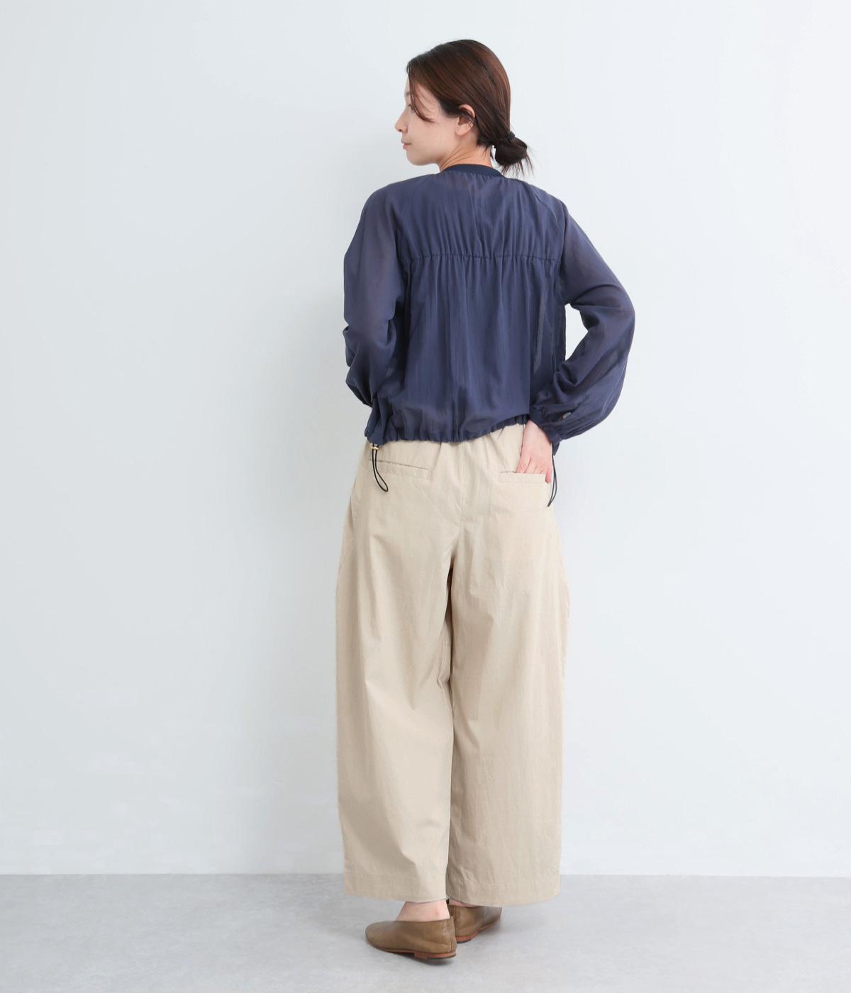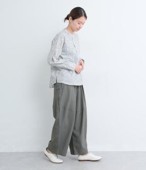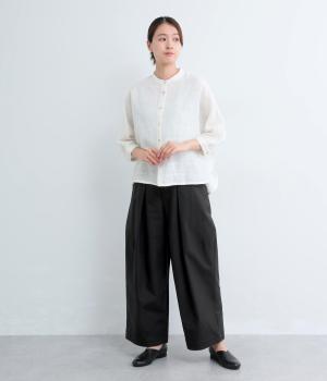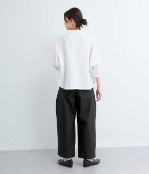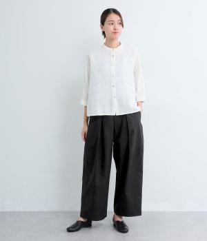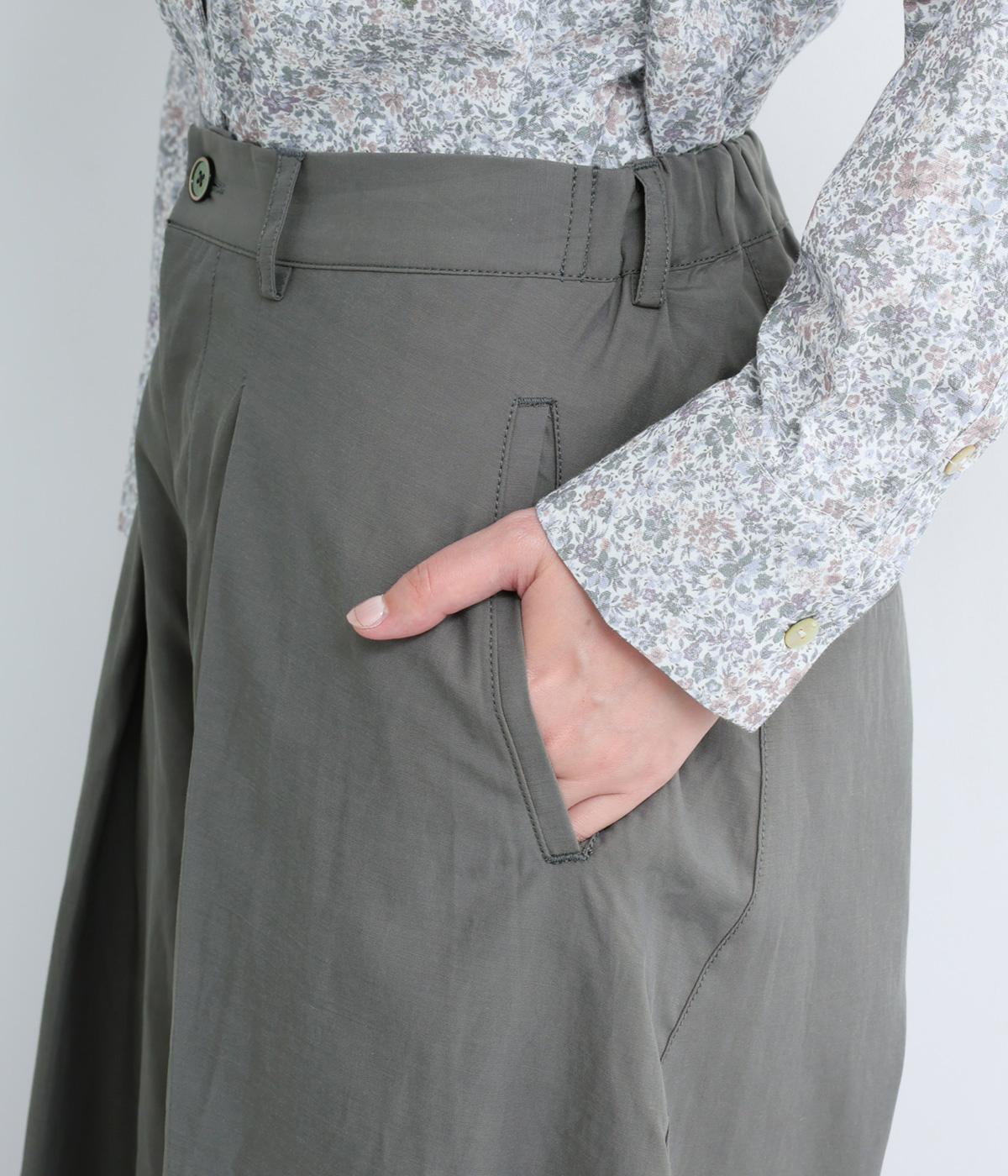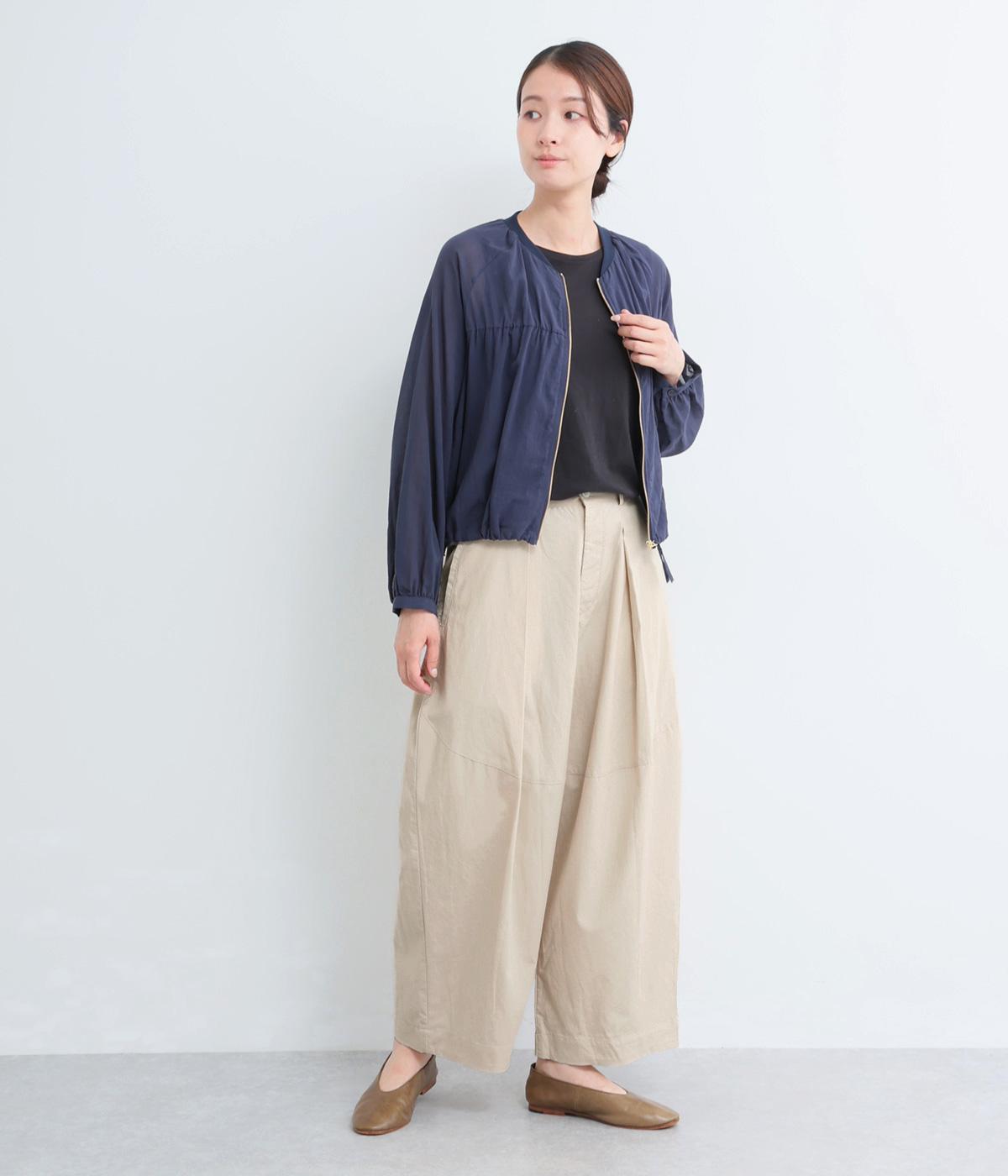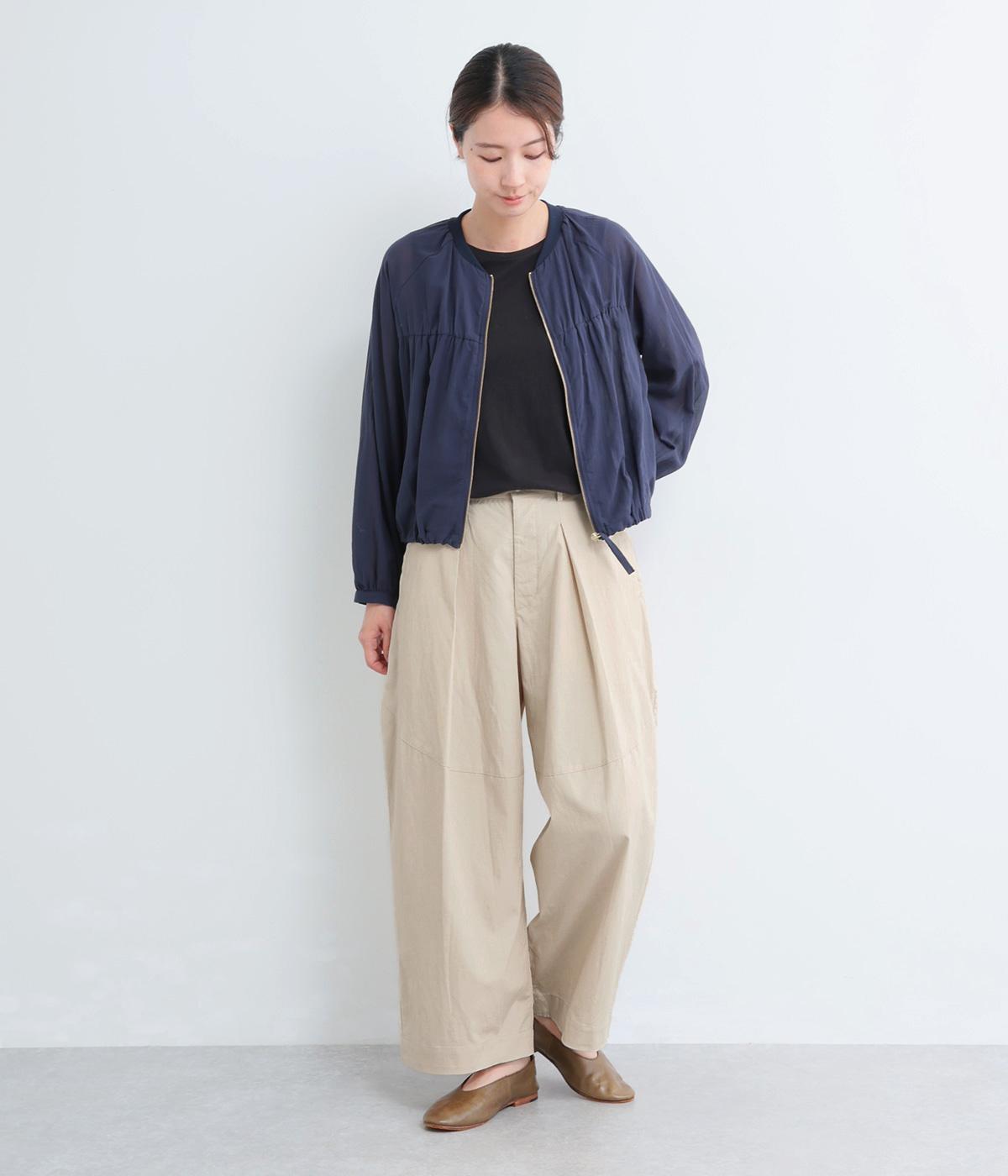 タックを入れてウエストからひざにかけてフレア感を出し、裾に向けて丸みを帯びたコクーンシルエットが特徴。ボタンフライの前あき仕様でおなかまわりをすっきり見せ、後ろウエストゴム仕様でフィット感も◎。きれいめな装いにも活躍する一本です。