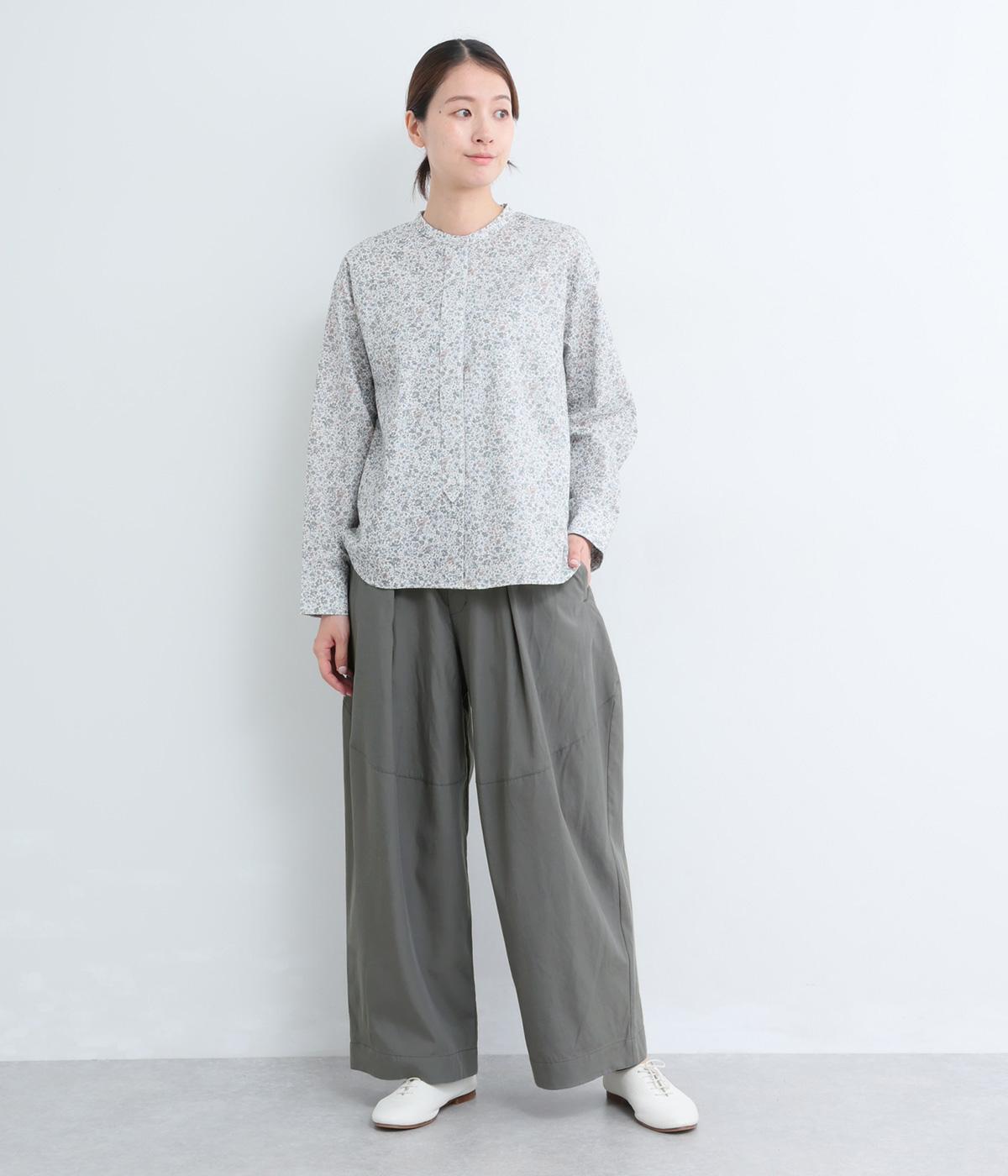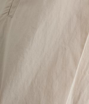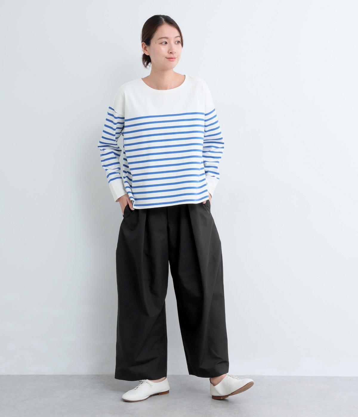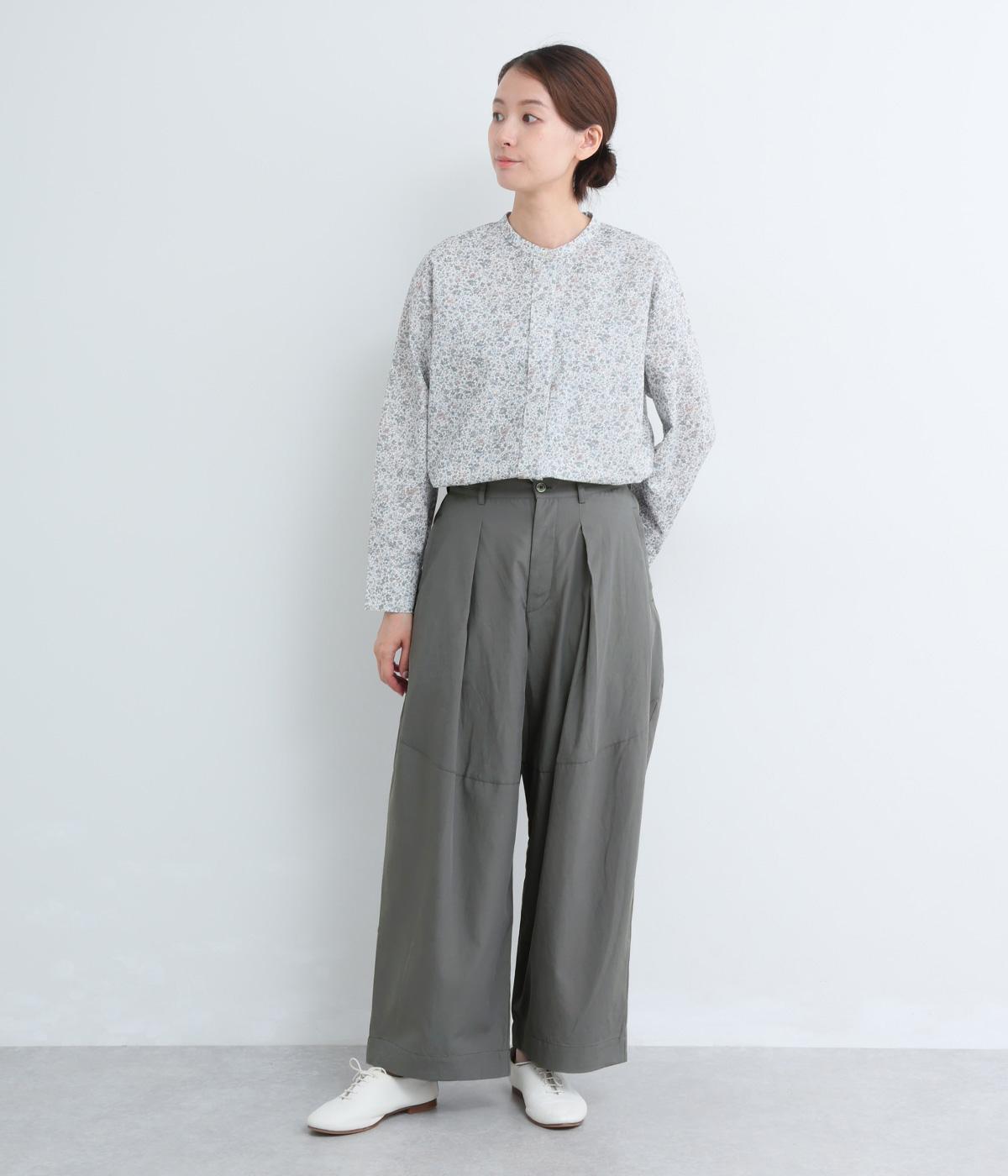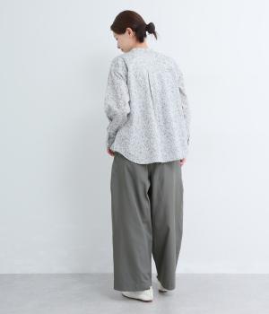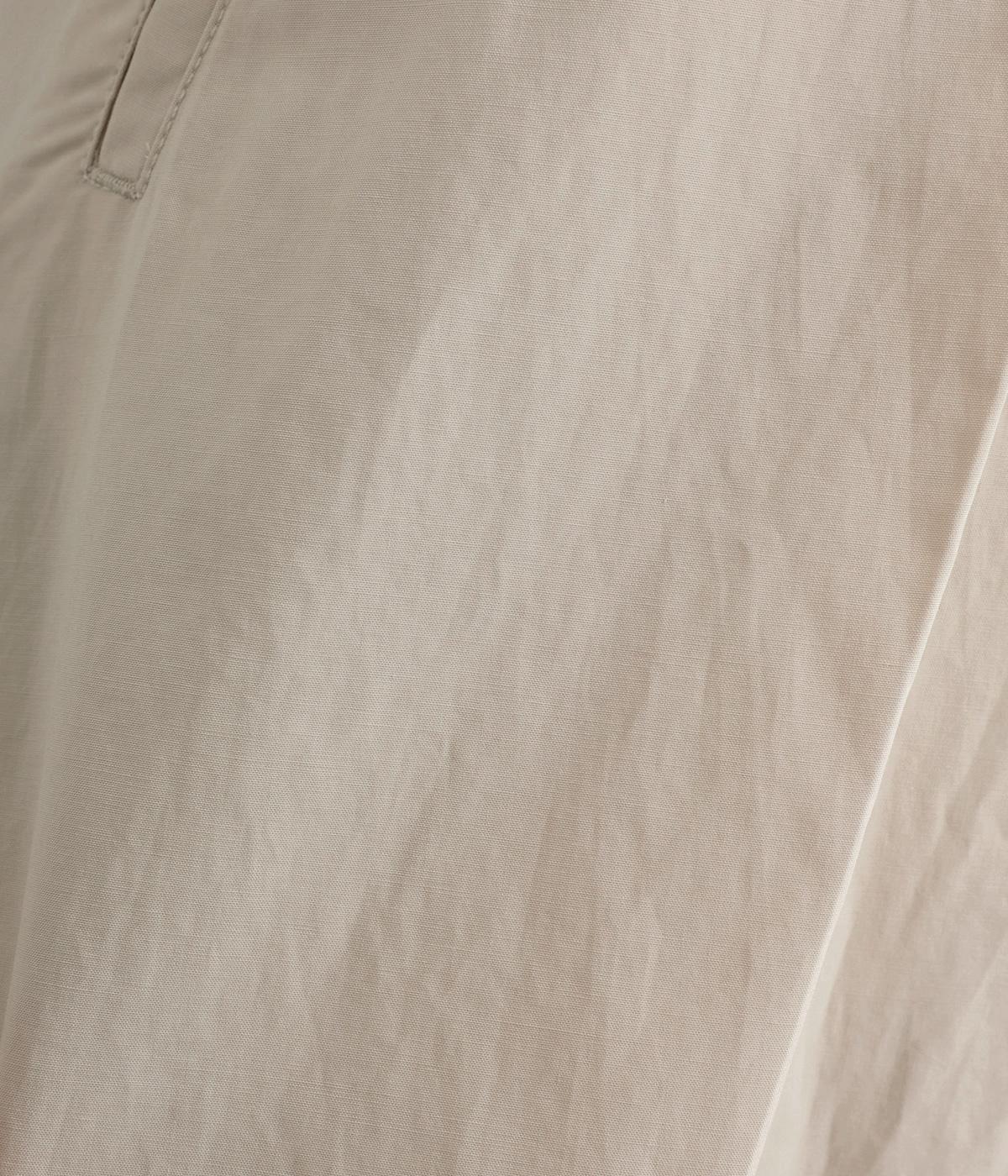 タックを入れてウエストからひざにかけてフレア感を出し、裾に向けて丸みを帯びたコクーンシルエットが特徴。ボタンフライの前あき仕様でおなかまわりをすっきり見せ、後ろウエストゴム仕様でフィット感も◎。きれいめな装いにも活躍する一本です。