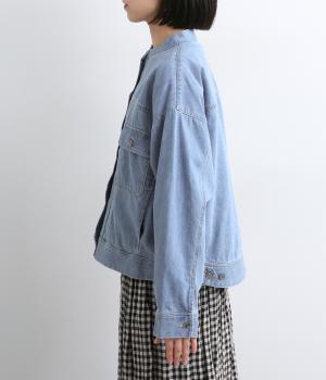 肩のラインを落としてゆとりのある仕立てが女性らしいやわらかさを生むデニムジャケット。軽く羽織りやすく、スタンドカラーなのでフーディトップスとも好相性。ほのかに光るシェルボタンがぢょうといいポイントに。