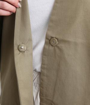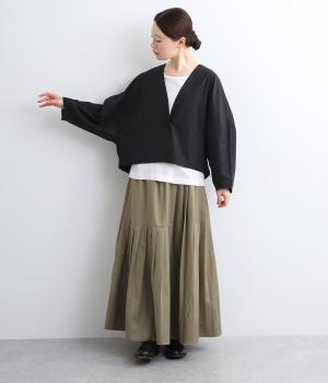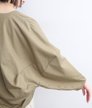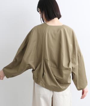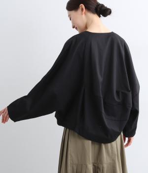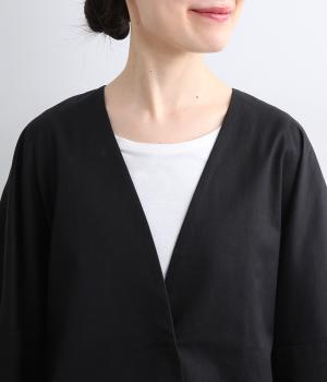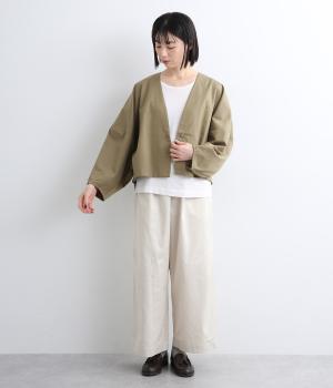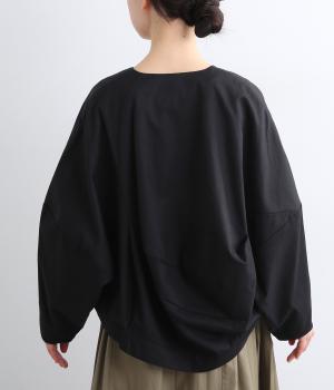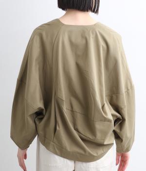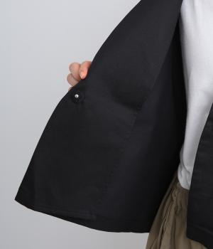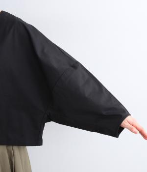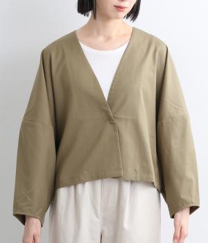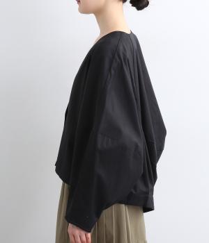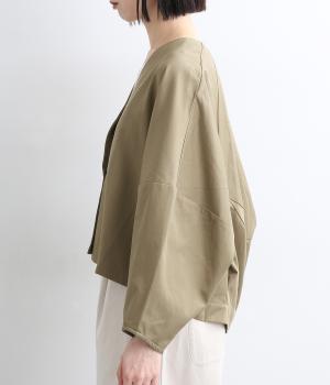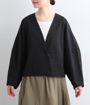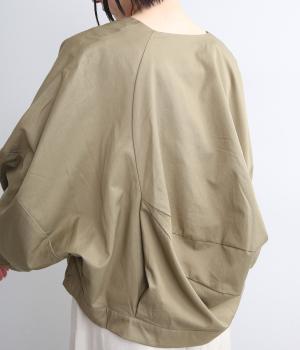 バックスタイルがアシンメトリーで、球体上になるように作成されたパターンワークが魅力のジャケット。袖も切り替えが施され、立体感のあるデザインに。フロントはくるみスナップ仕立てですっきりとした印象に見せています。
