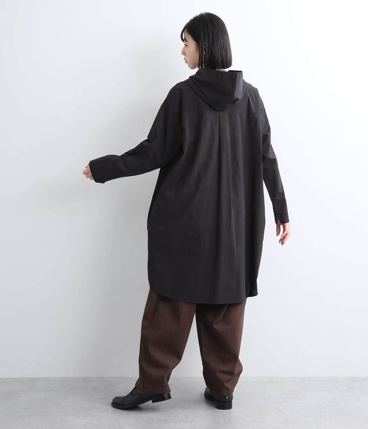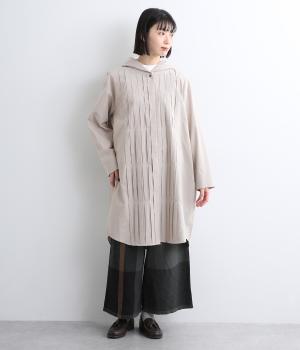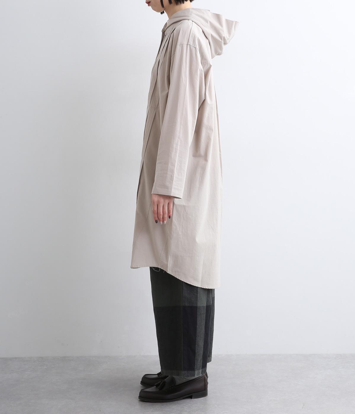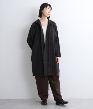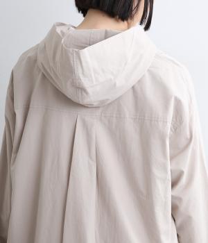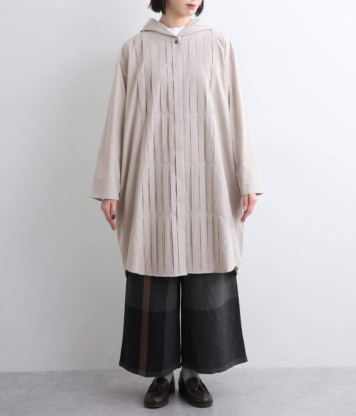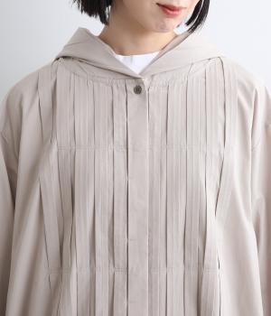 フロントにタックを入れて立体感を出したディティールがポイントのシャツです。前ボタンあきで羽織りとしても重宝する一枚。フードつきは大人カジュアルなライトアウター感覚で着用できるアイテムに。