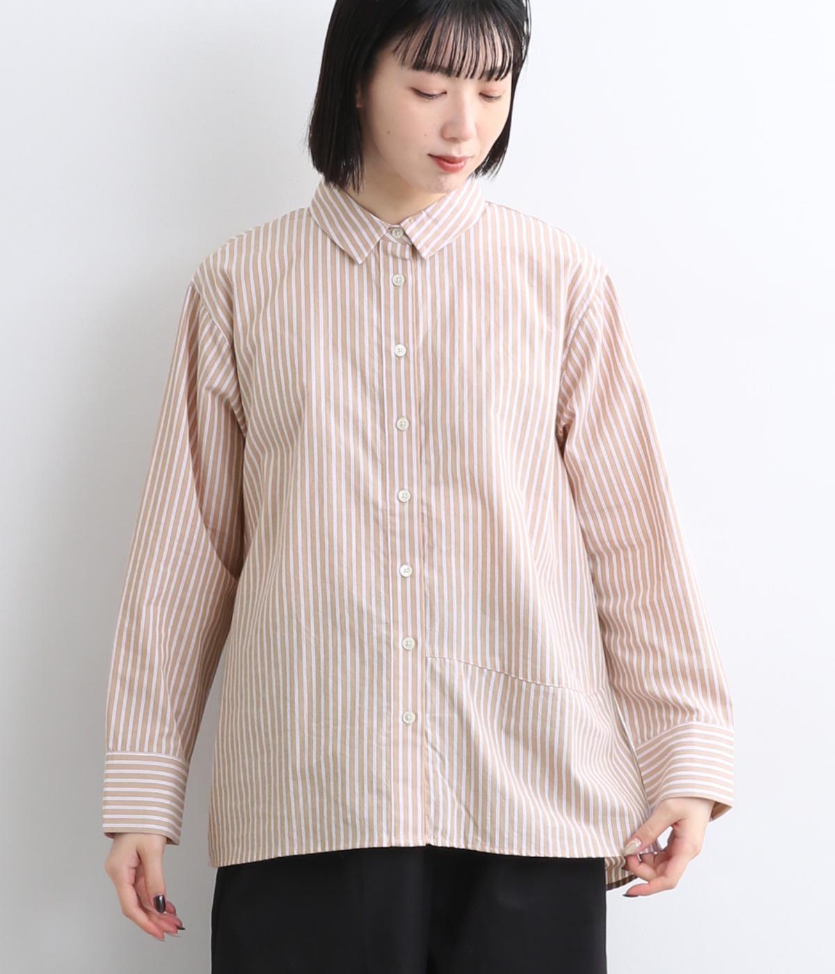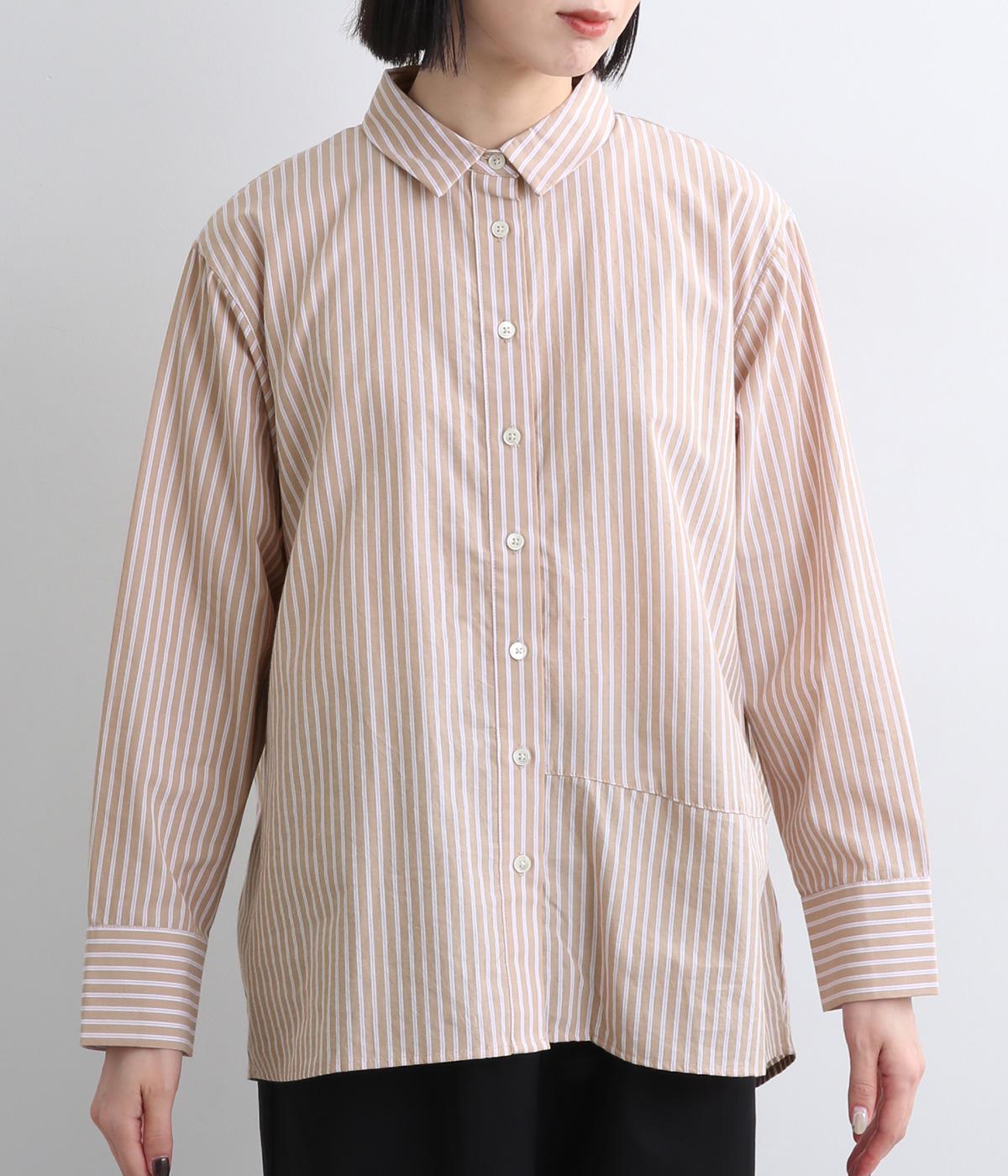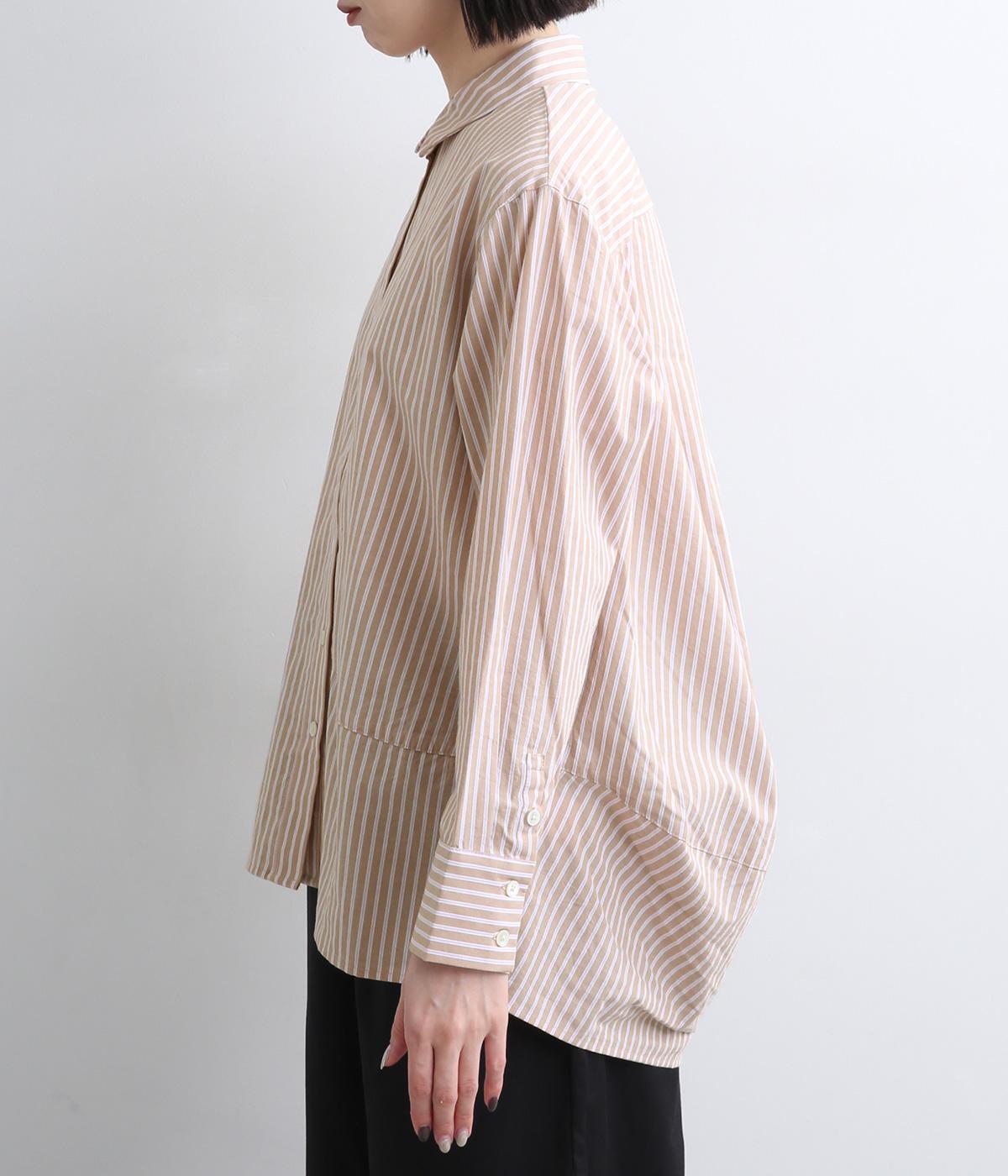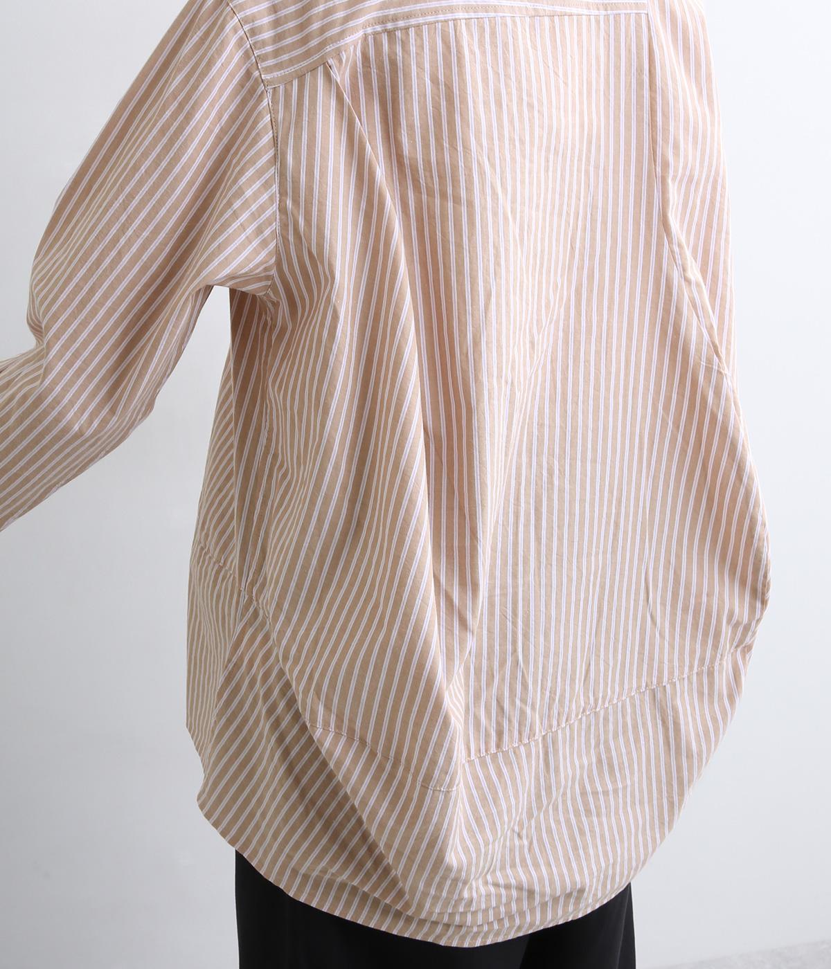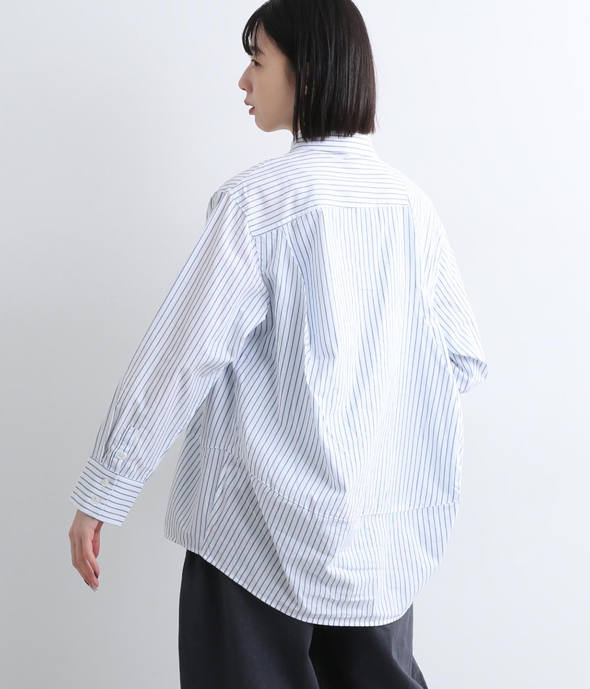 フロントにはアシンメトリー切り替え、バックスタイルは球体上のシルエットになるように制作されたパターンワークが特徴的なシャツです。長めの後ろ裾が自然とヒップをカバー。ラフに羽織って合わせるのもおすすめです。