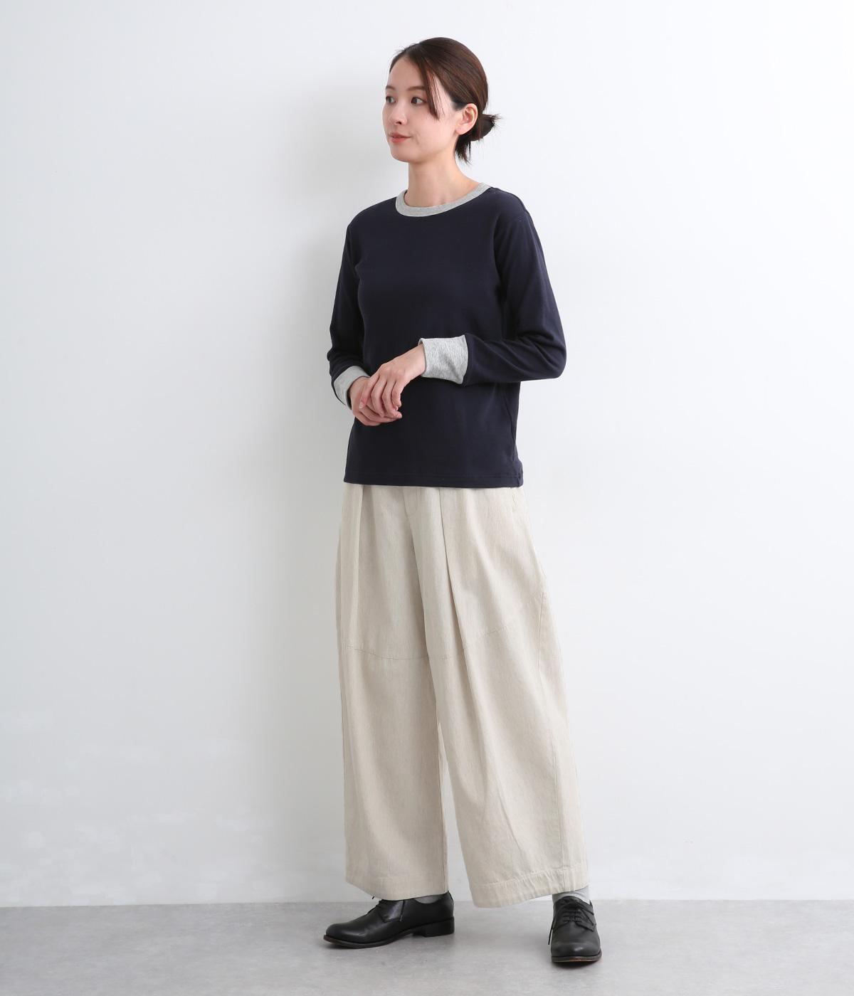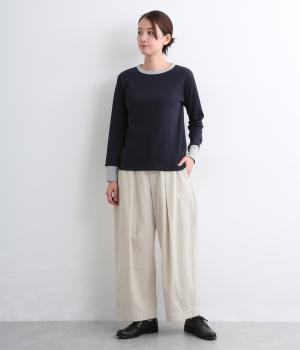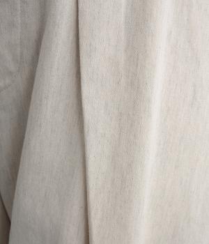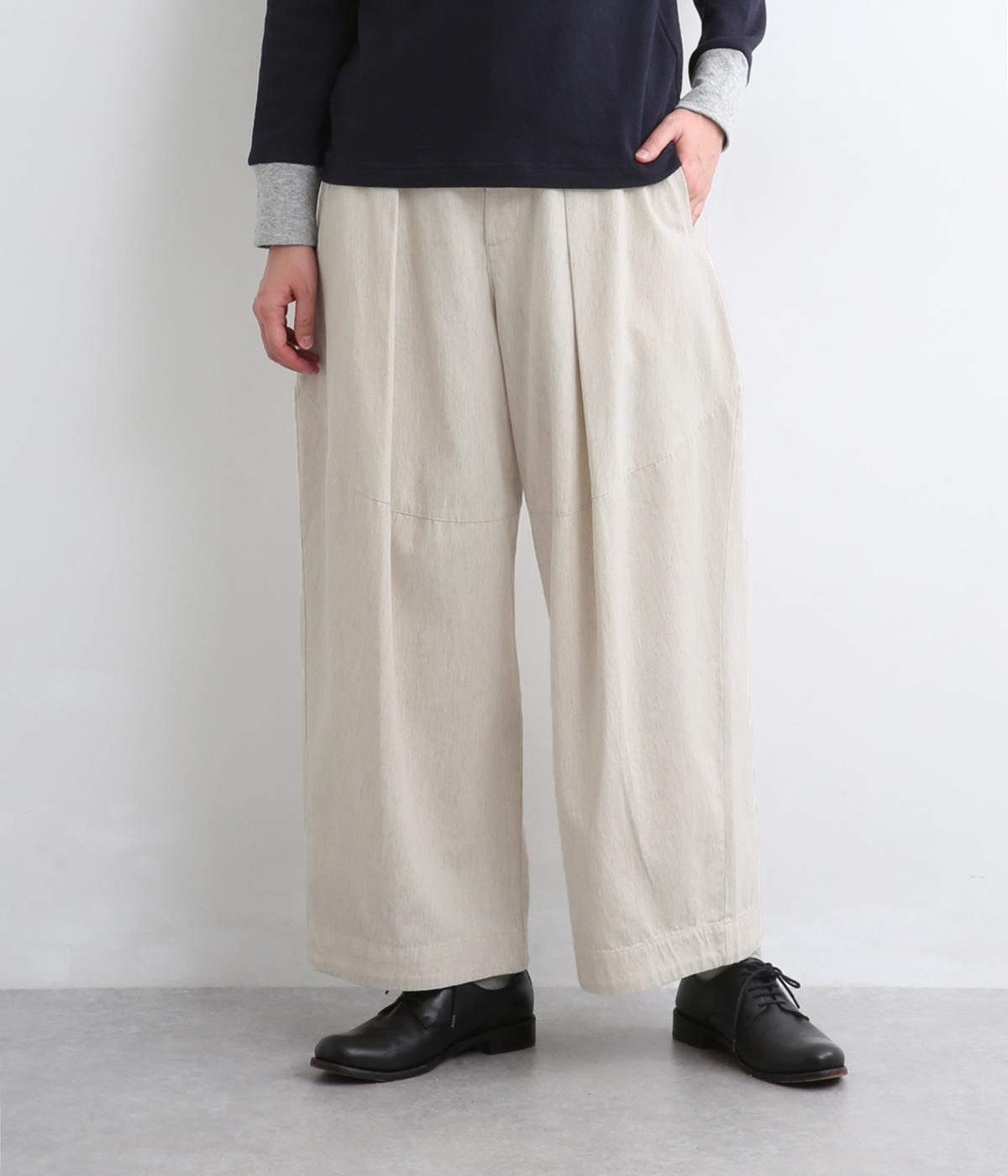 タックを入れてウエストからひざにかけてフレア感を出し、切り替えで自然な丸みと立体感をつけました。脚のラインを拾いすぎないゆとりのあるシルエットに前ファスナーでお腹まわりはすっきりと。後ろはゴム入りでフィット感も◎。
