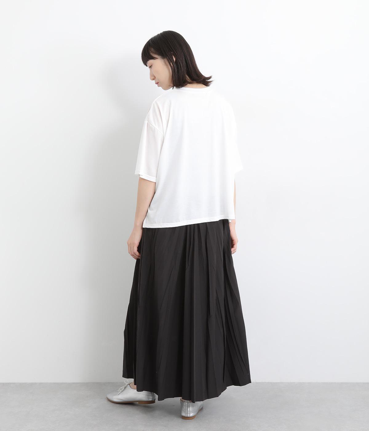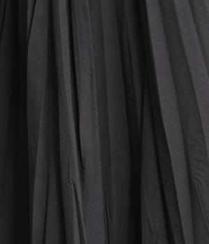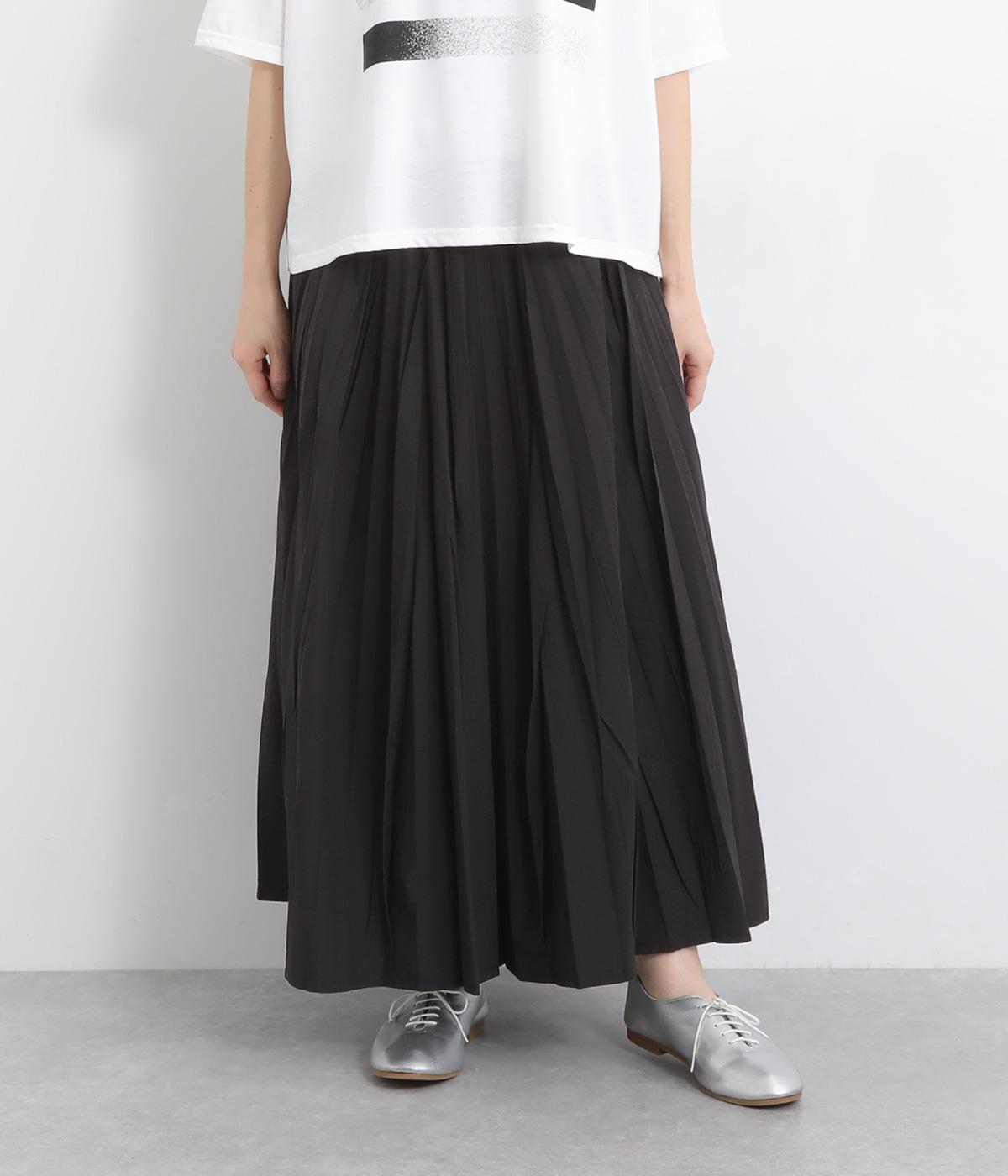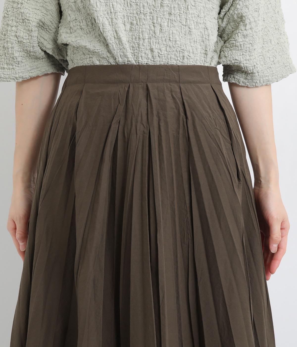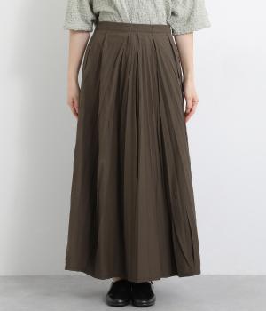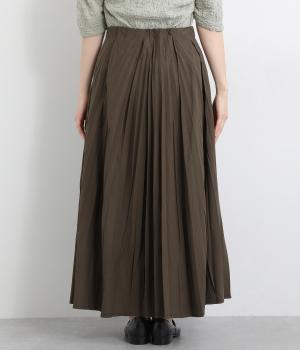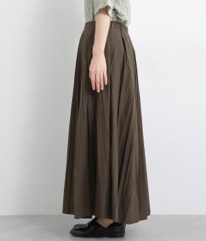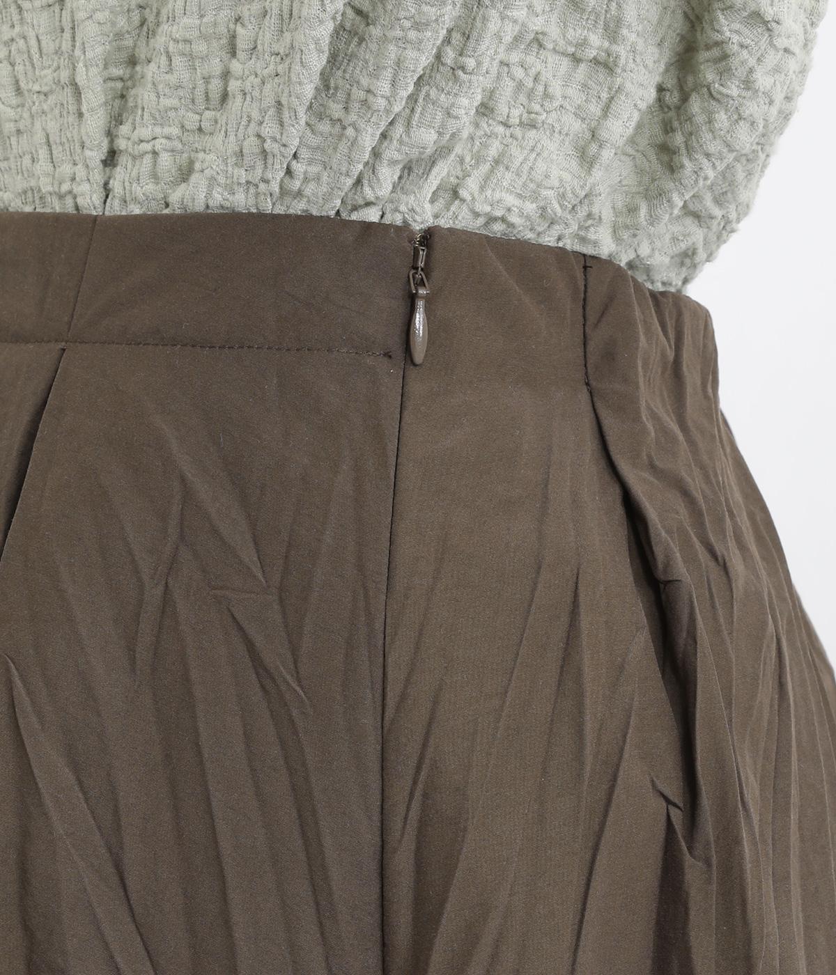 タックをランダムに縫ってからプリーツをかけることで、動きがよりでて存在感を増しています。ウエストはすっきりまとめているので、トップスインでタックディテールを強調するのもおすすめ。サイドファスナーで脱ぎはきしやすく、後ろはゴムを入れてフィット感も◎。
