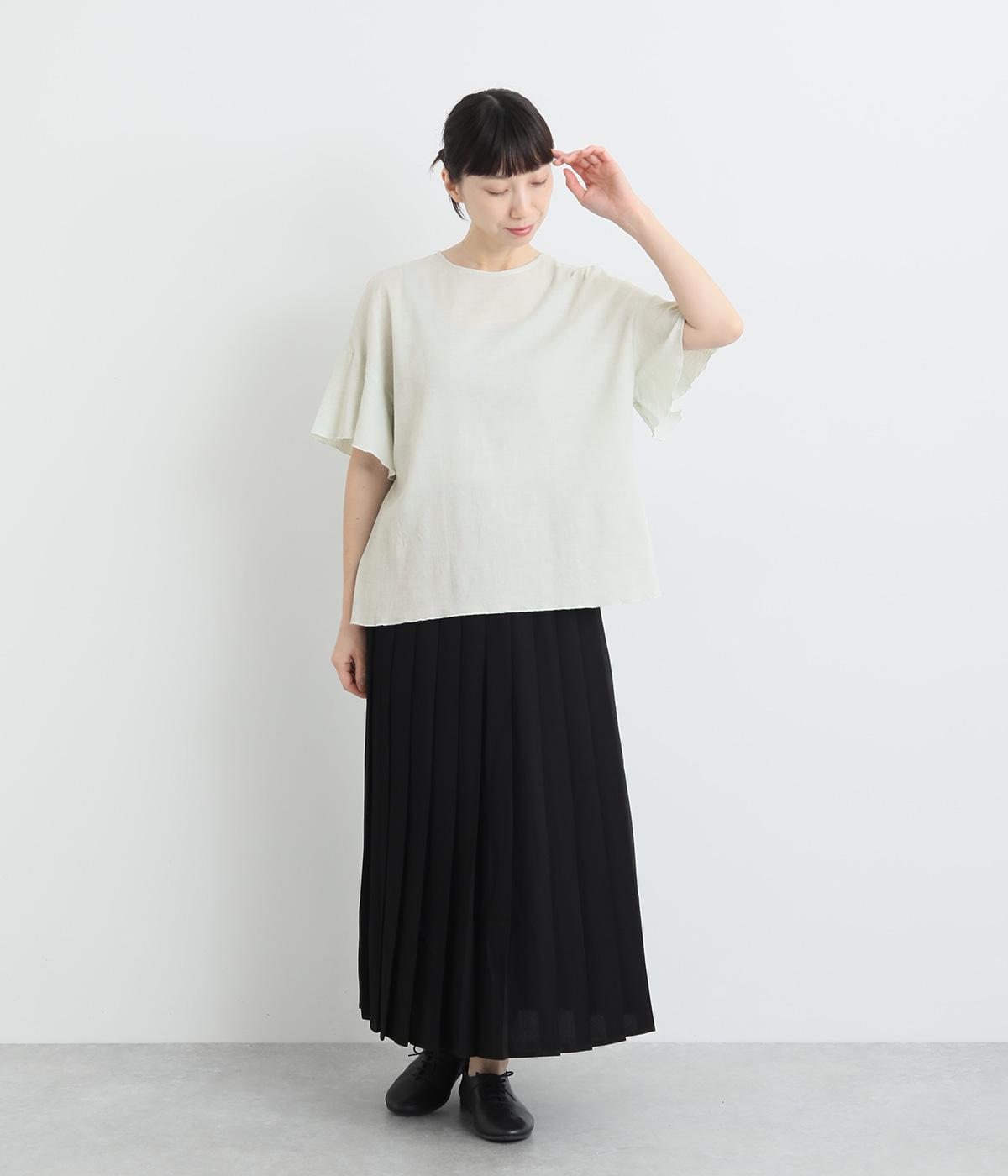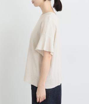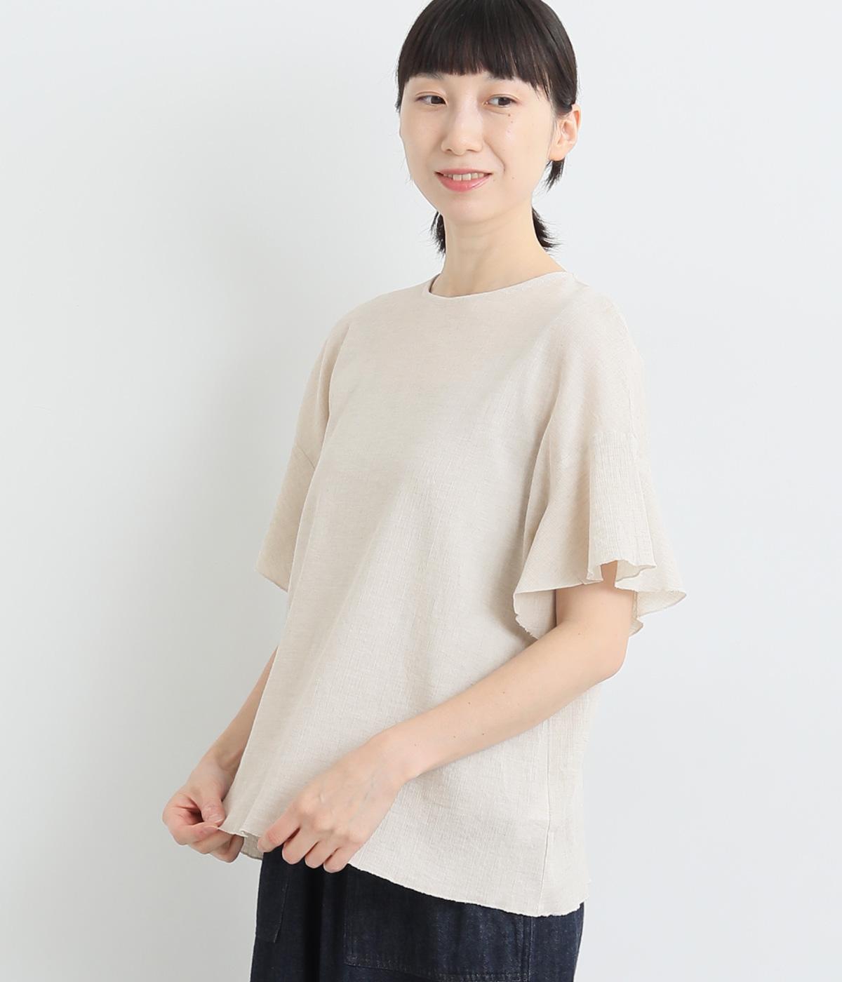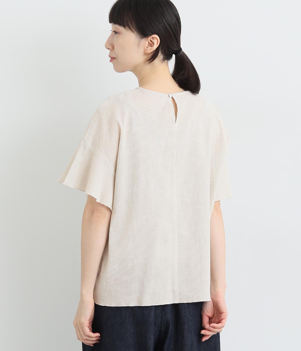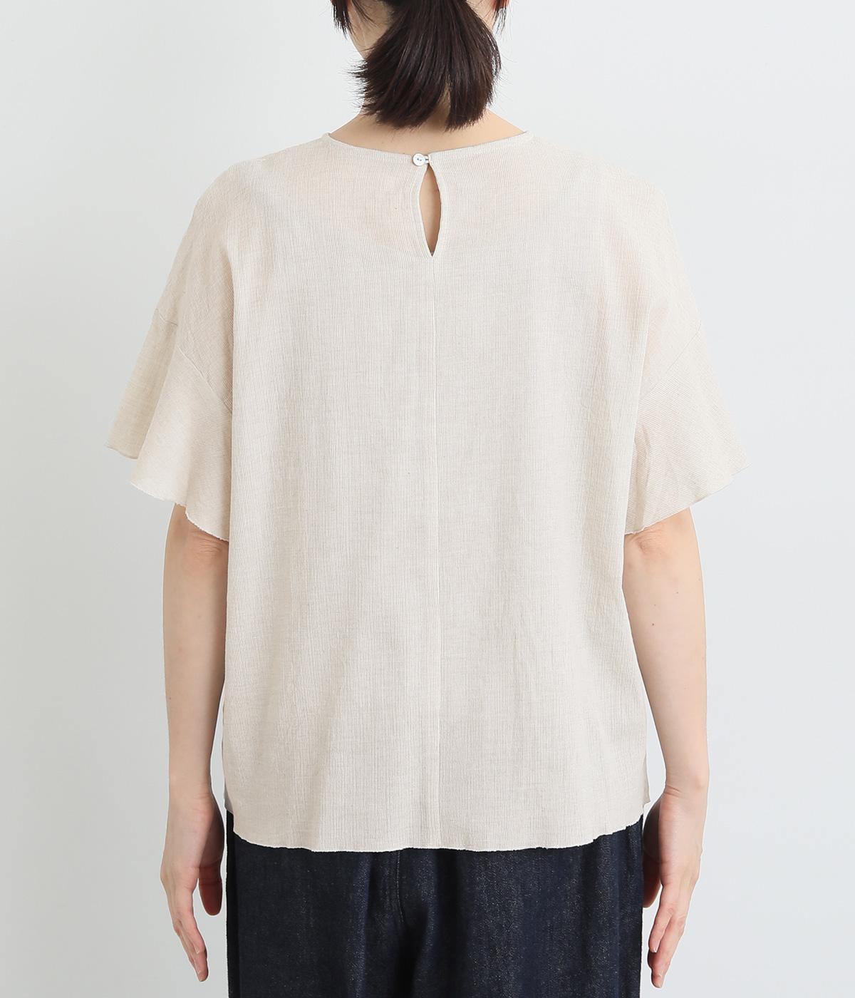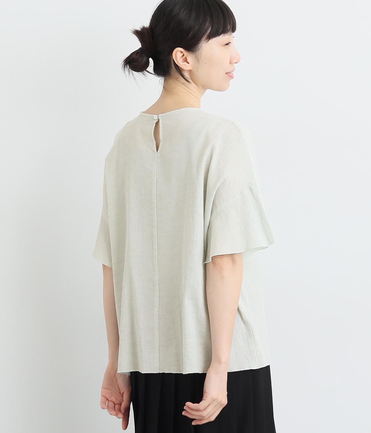 高島ちぢみのシボ感を活かしたシンプルなプルオーバーブラウス。フレアスリーブでかわいらしさとやわらかさもプラスしています。後ろ姿のアクセントになる首もとのボタンは、着脱のしやすさにも配慮されたデザイン。