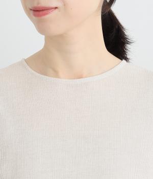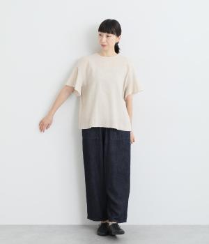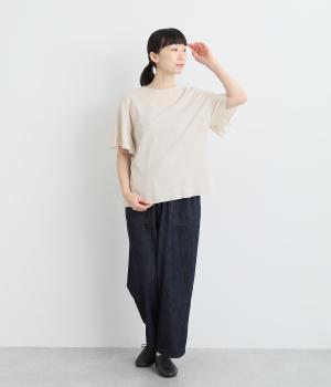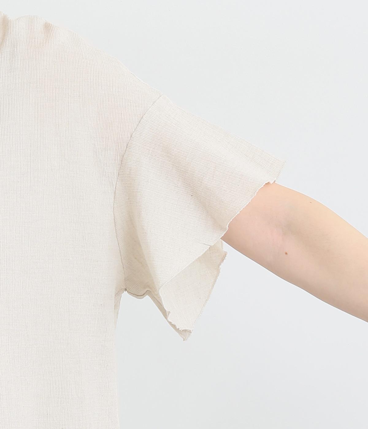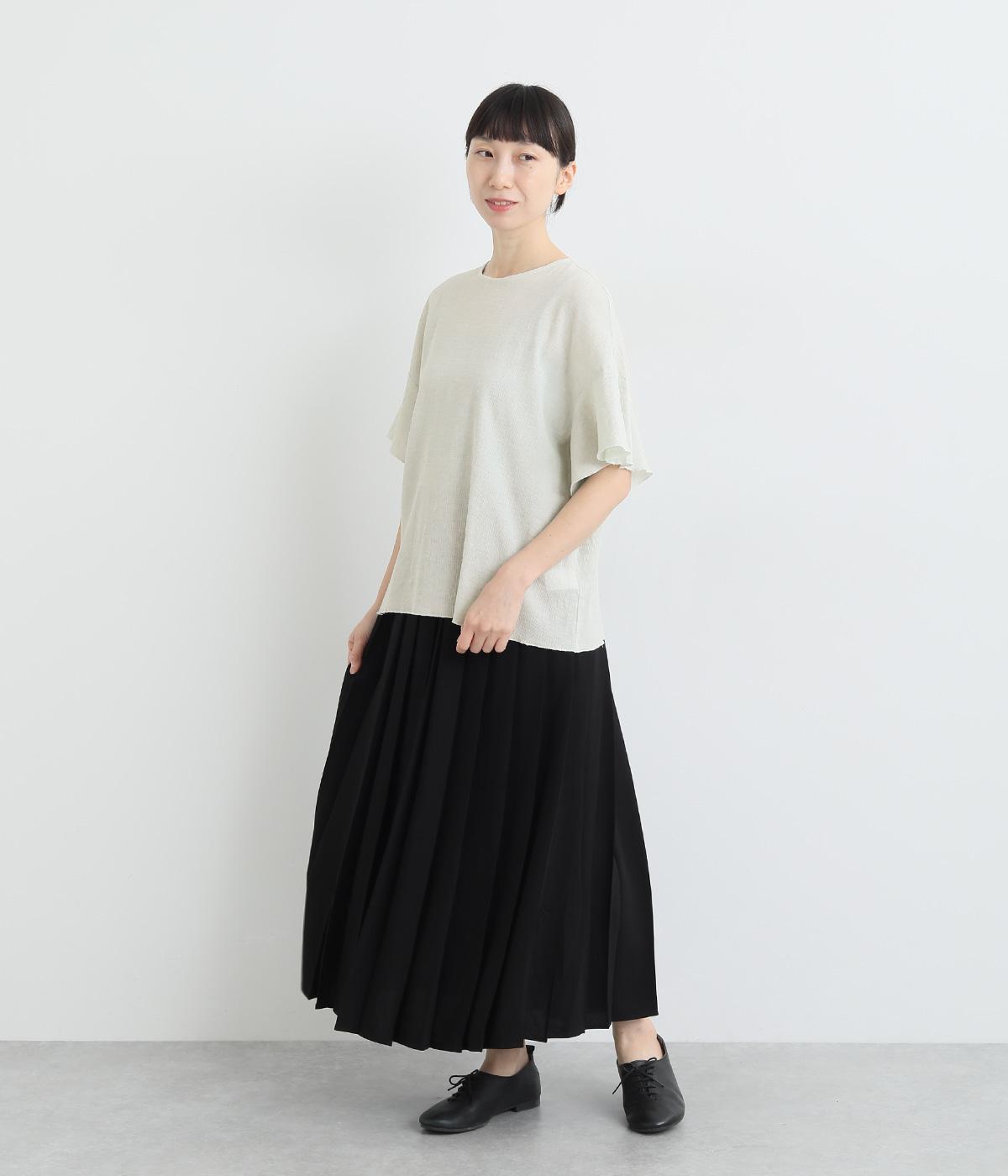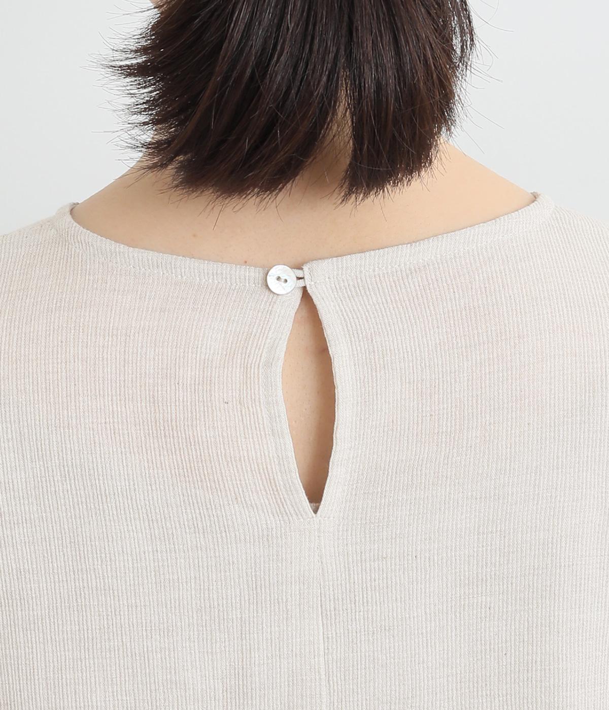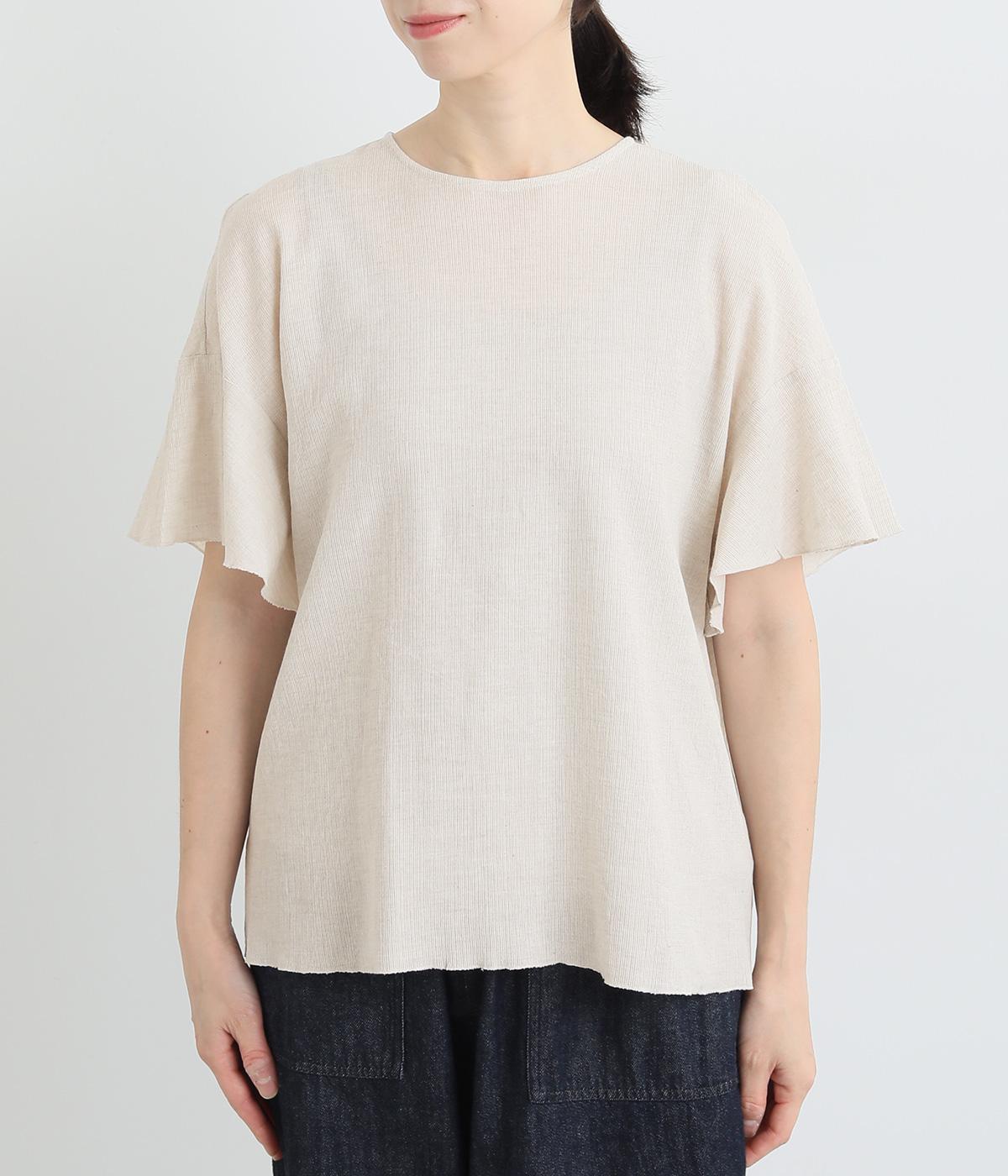 高島ちぢみのシボ感を活かしたシンプルなプルオーバーブラウス。フレアスリーブでかわいらしさとやわらかさもプラスしています。後ろ姿のアクセントになる首もとのボタンは、着脱のしやすさにも配慮されたデザイン。