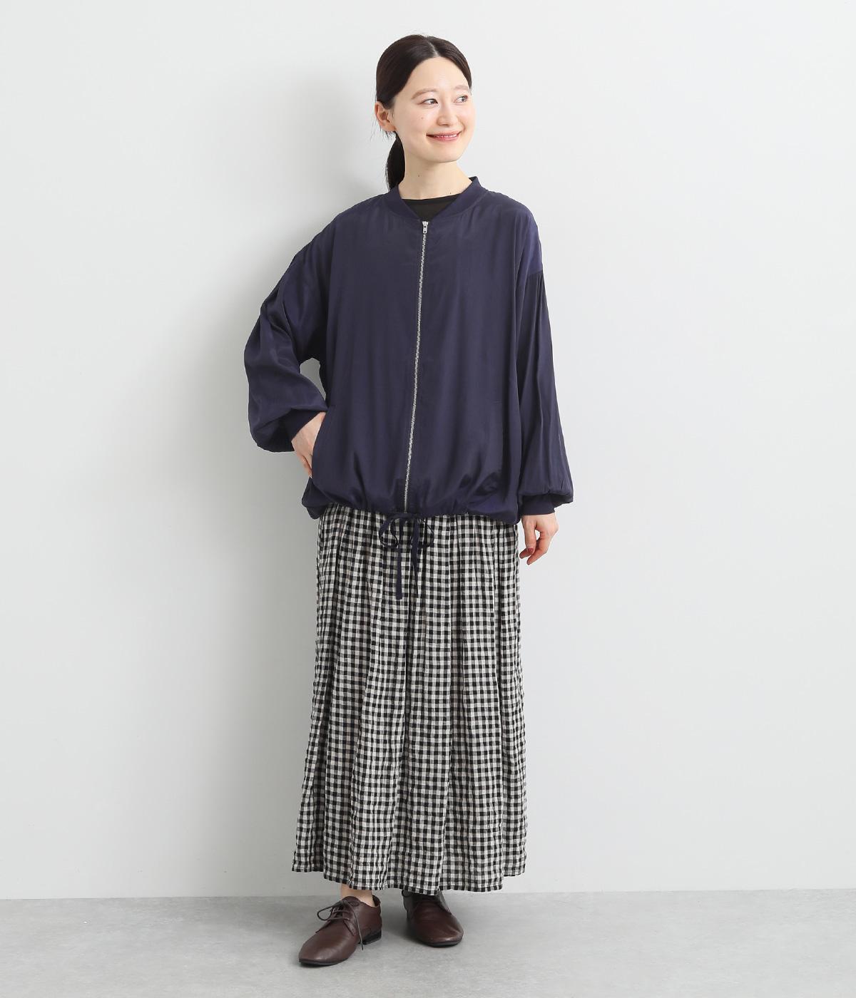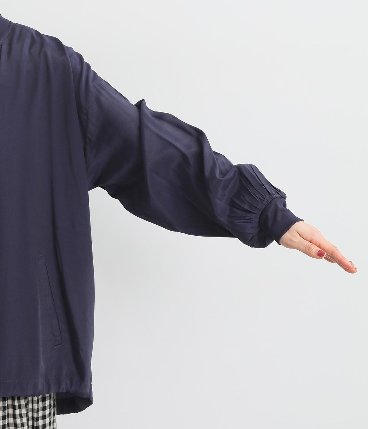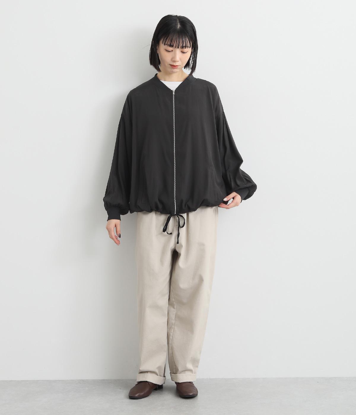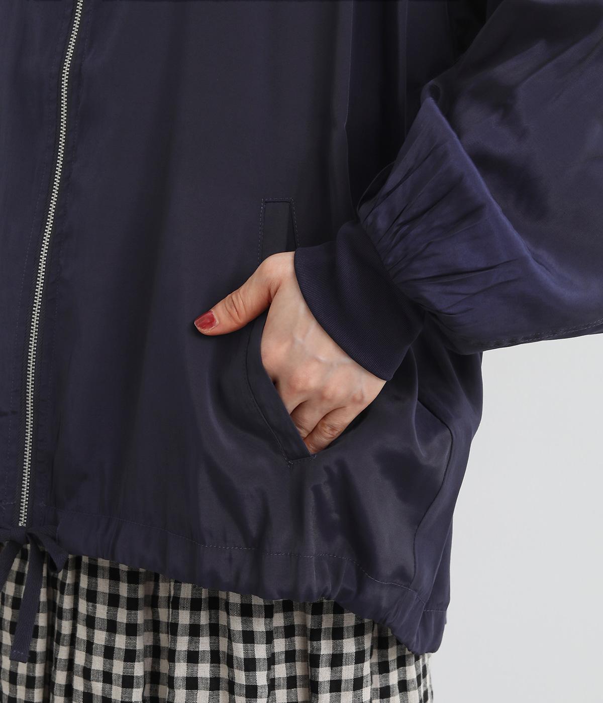 バックスタイルにたっぷりと入れたギャザーとなめらかな生地の質感が、カジュアルな中にフェミニンなムードを運ぶブルゾン。前はシンプルなデザインで、さまざまな装いに合わせやすいのが◎です。裾に通した紐を絞ればシルエットや丈感を調整できます。