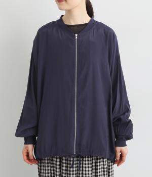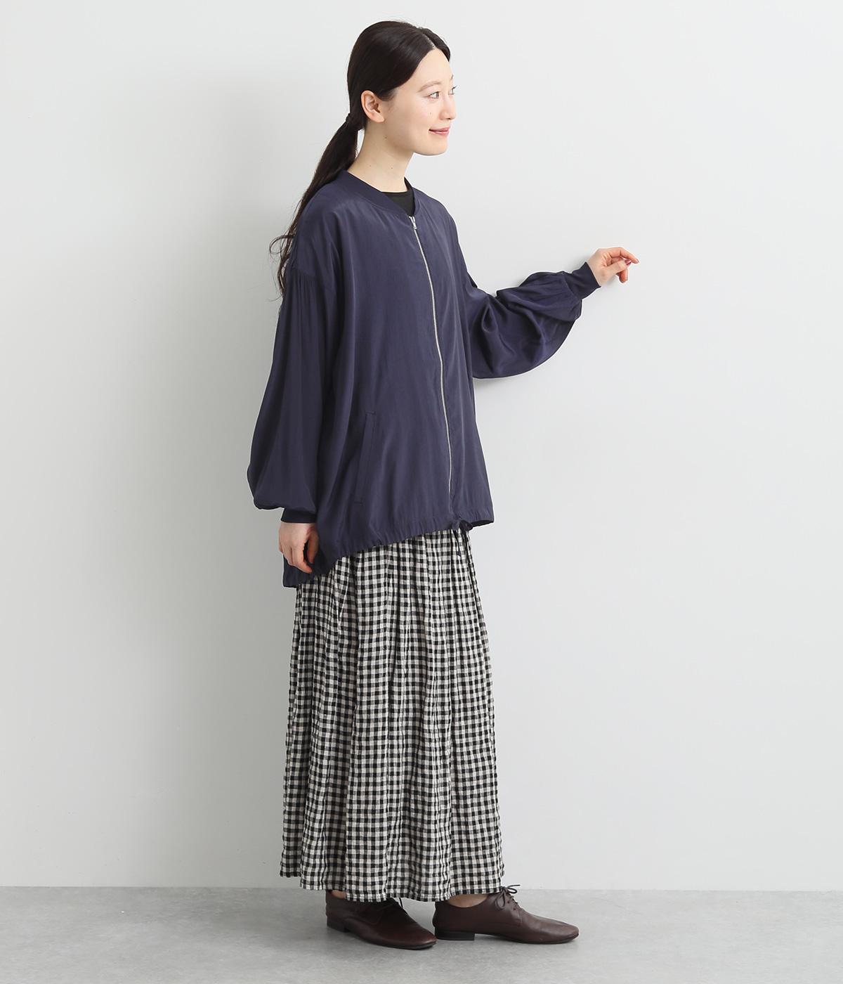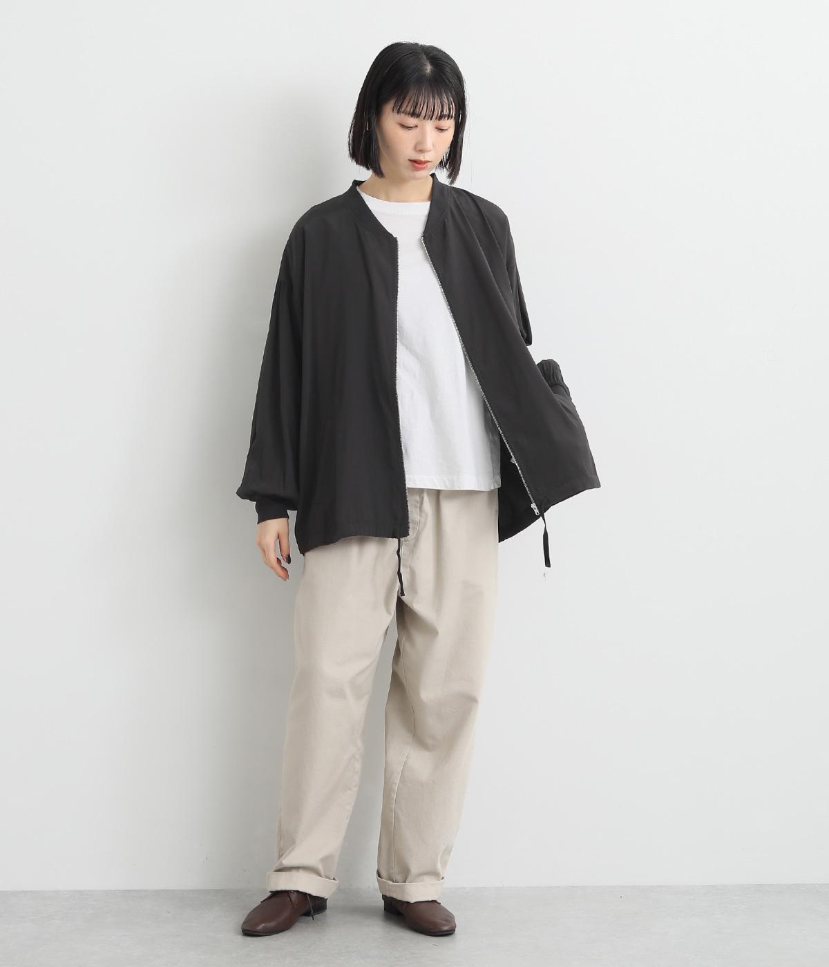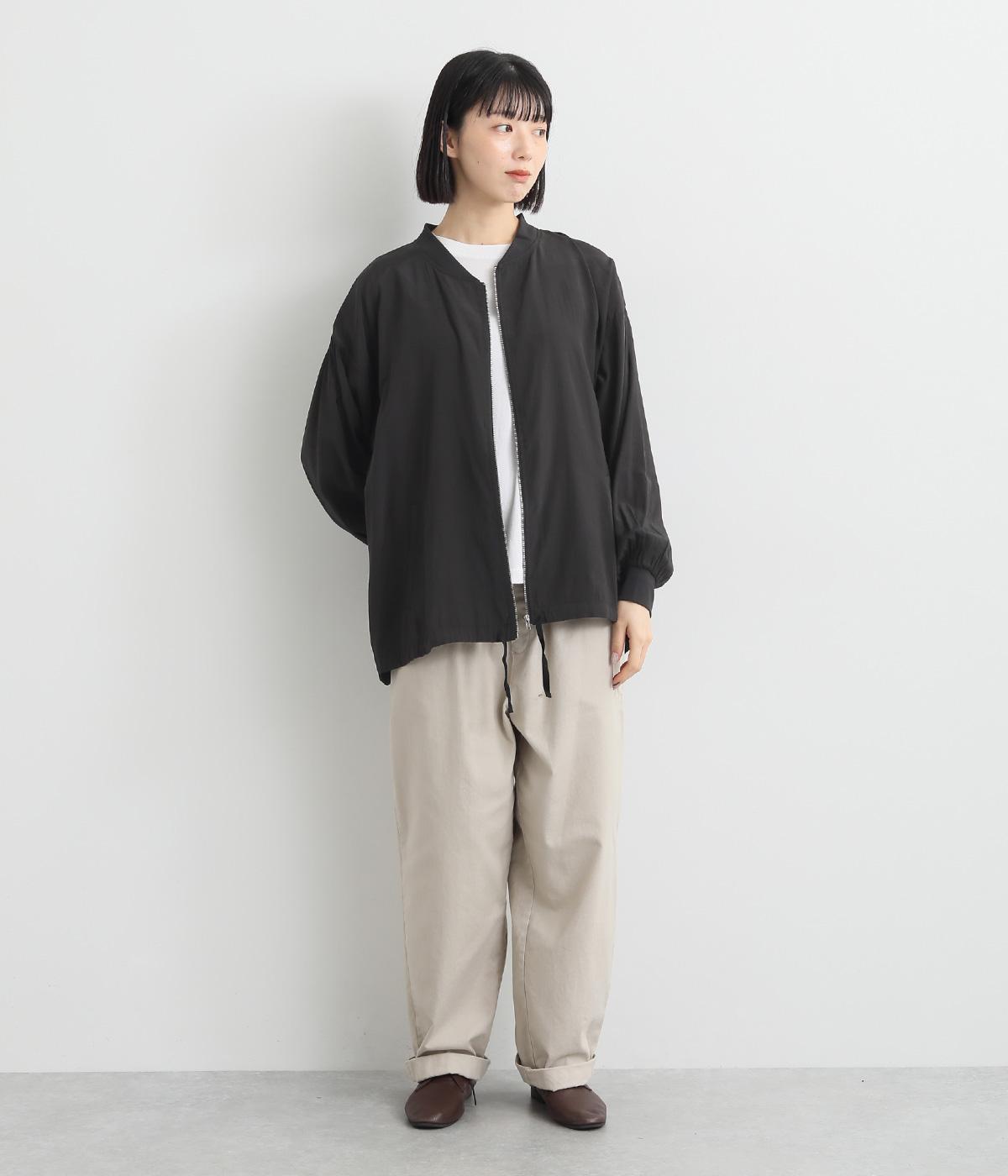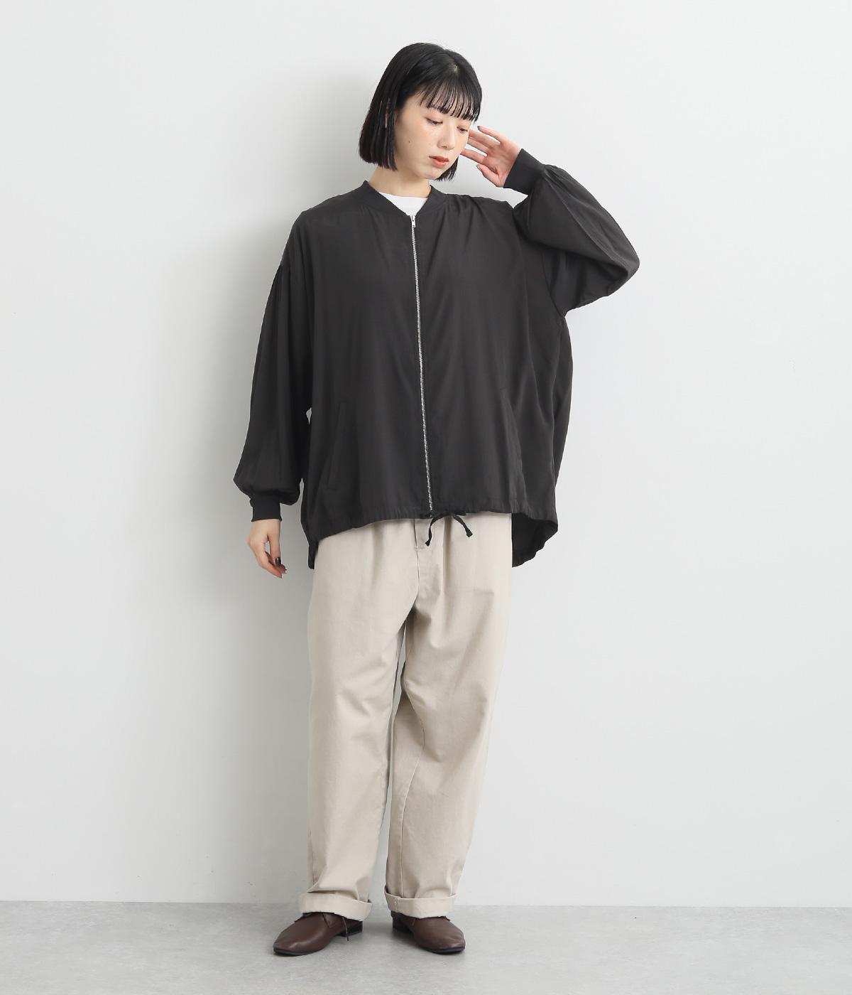 バックスタイルにたっぷりと入れたギャザーとなめらかな生地の質感が、カジュアルな中にフェミニンなムードを運ぶブルゾン。前はシンプルなデザインで、さまざまな装いに合わせやすいのが◎です。裾に通した紐を絞ればシルエットや丈感を調整できます。