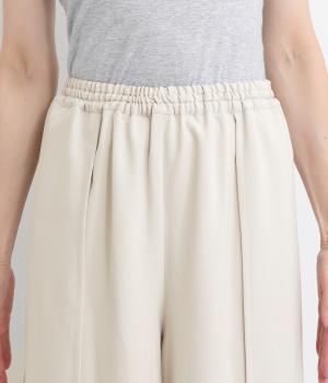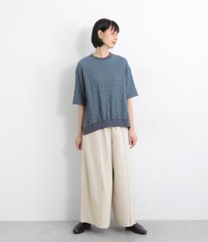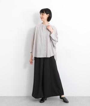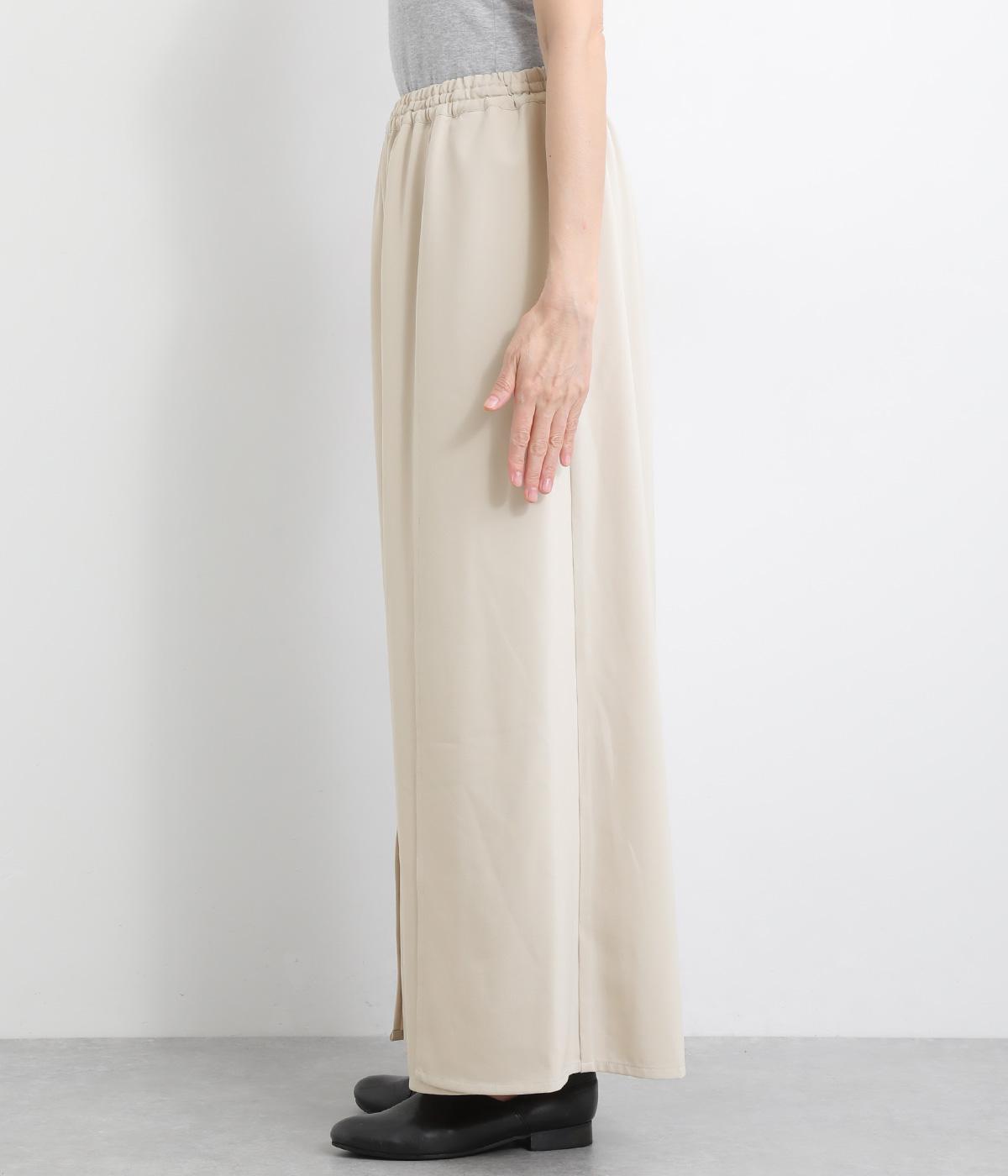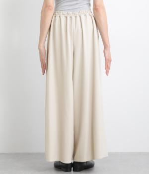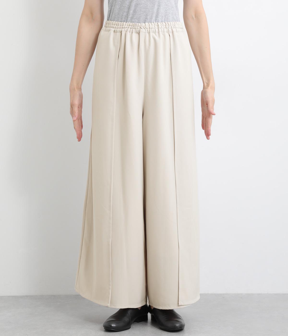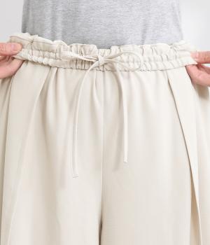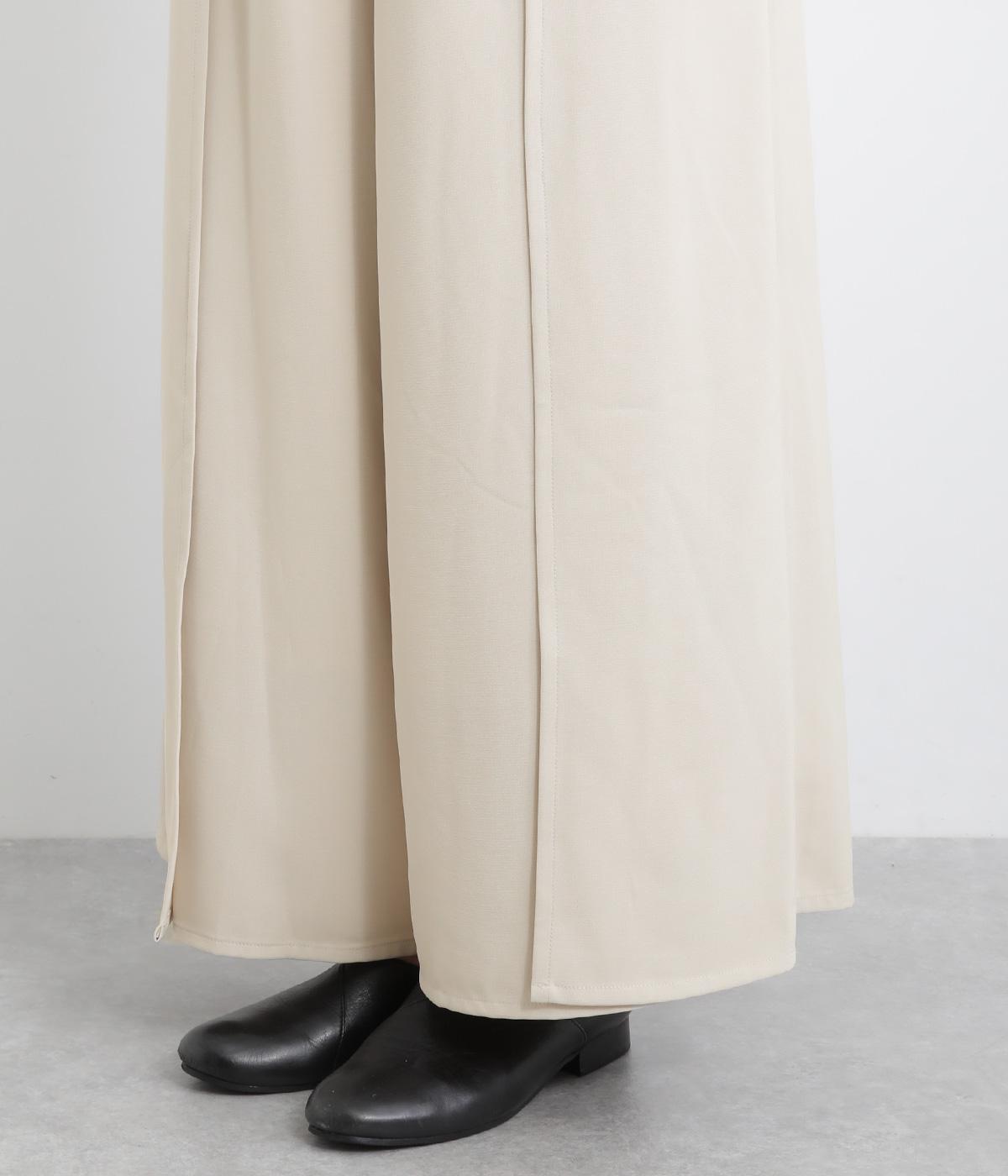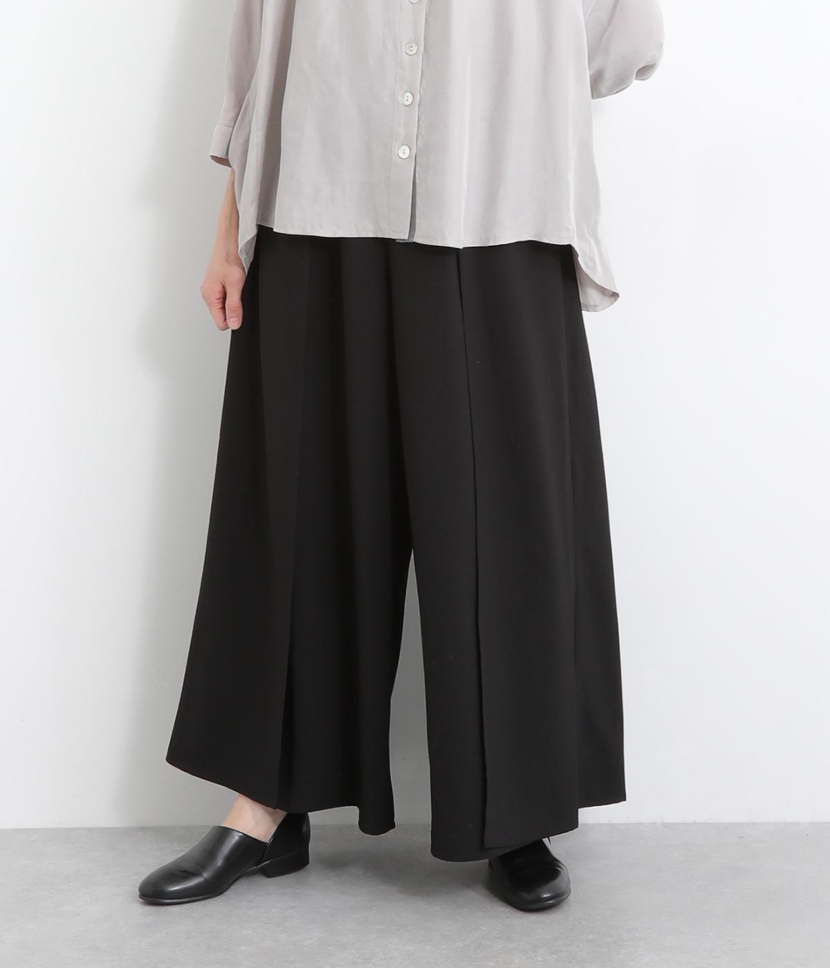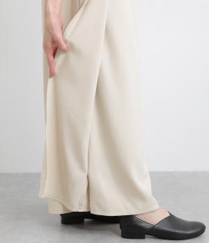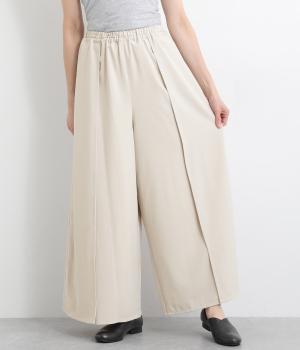 ラップ風に見える重ねデザインが目を惹く、ゆったりとしたワイドシルエットパンツ。風や動きによってなびいても捲れてこないよう、ラップは奥で留めて足が見えすぎないよう工夫しています。ウエストはオールゴムギャザーでストレスを軽減し、内紐入りで微調整も可能に。