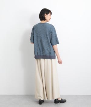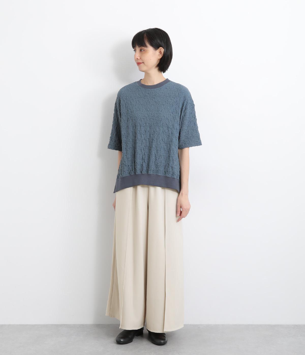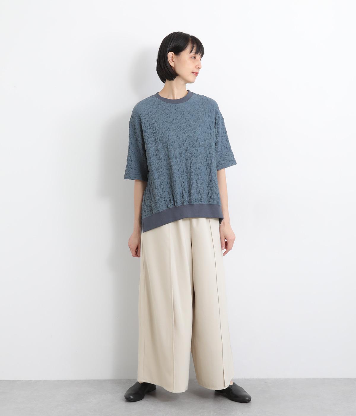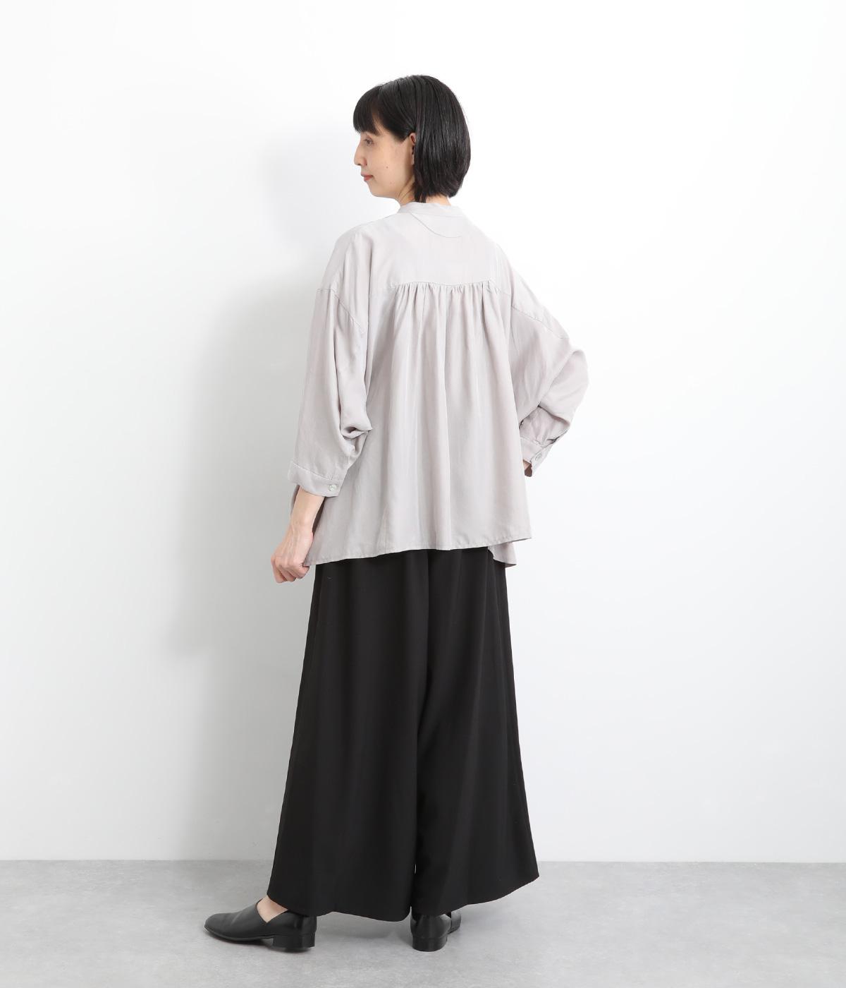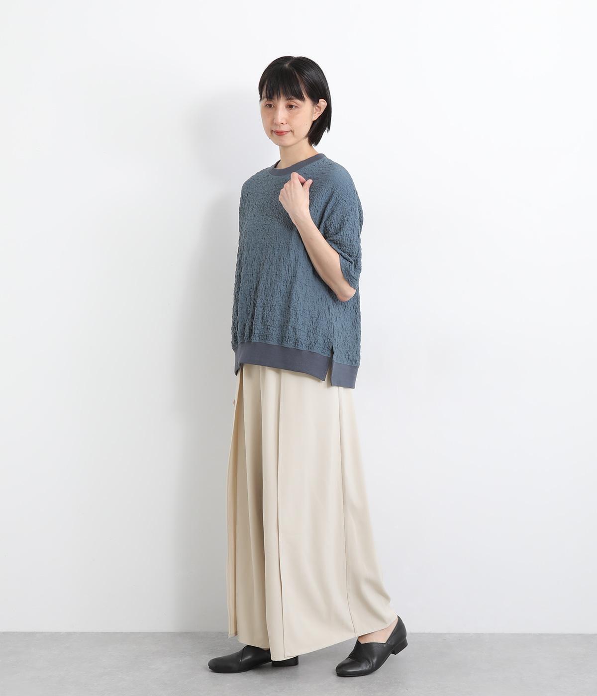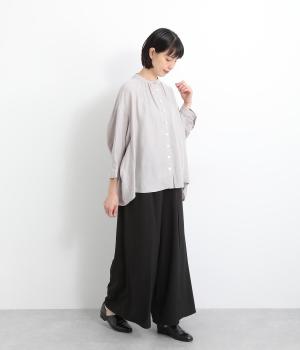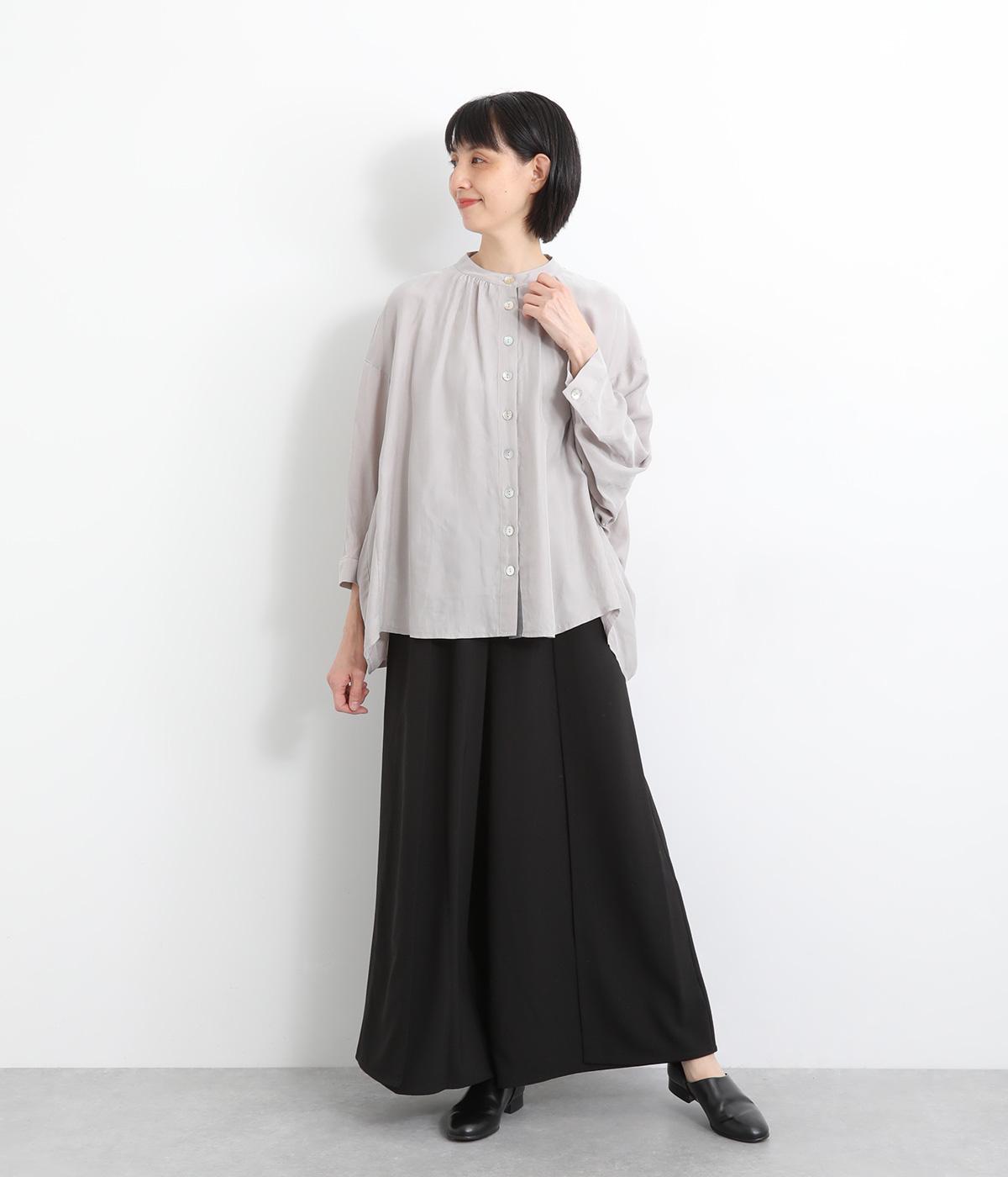 ポリエステルをベースにして、ドライタッチで心地よい落ち感のある仕立てにしました。ほんのりとした光沢が大人顔で優雅な印象もあり、きれいめな装いにもはまります。