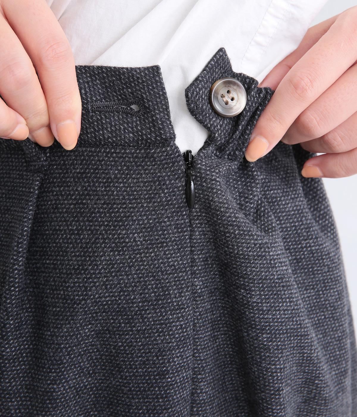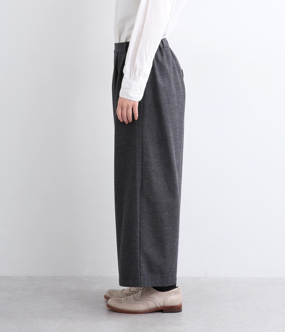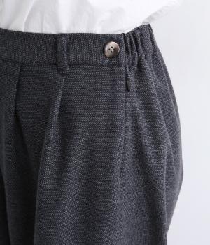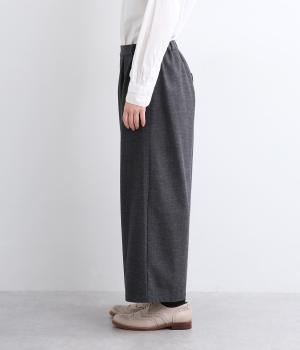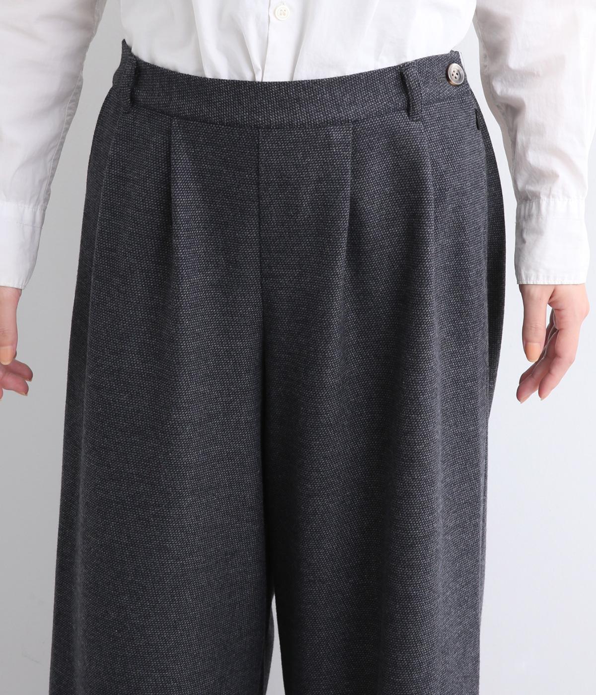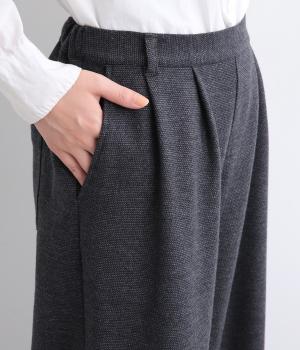 ほどよいワイドシルエットが女性らしい上品さを引き立てるパンツ。前後に入ったタックが腰まわりをすっきり見せます。ウエストはサイドのボタンとファスナー開き。うしろ部分はゴム仕様のため快適な穿き心地です。