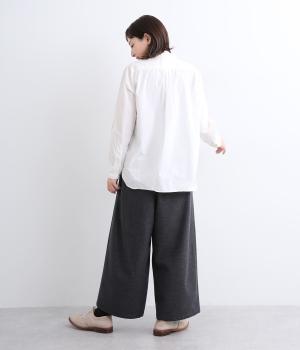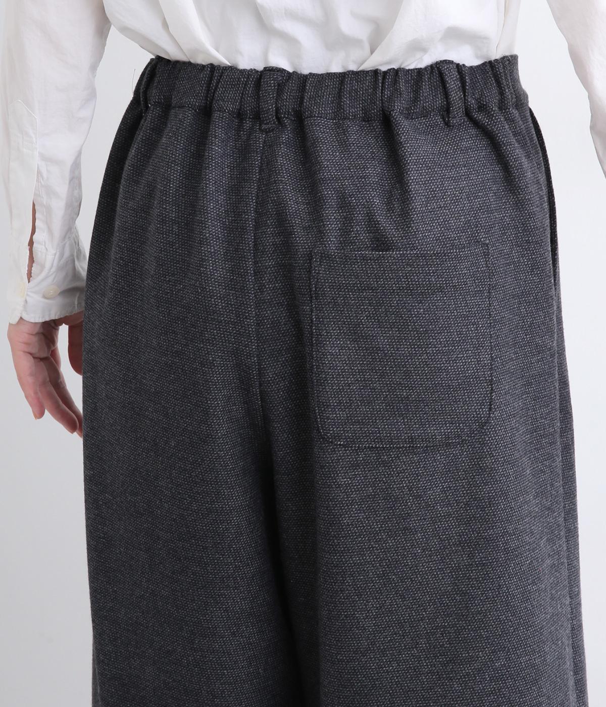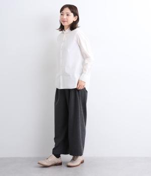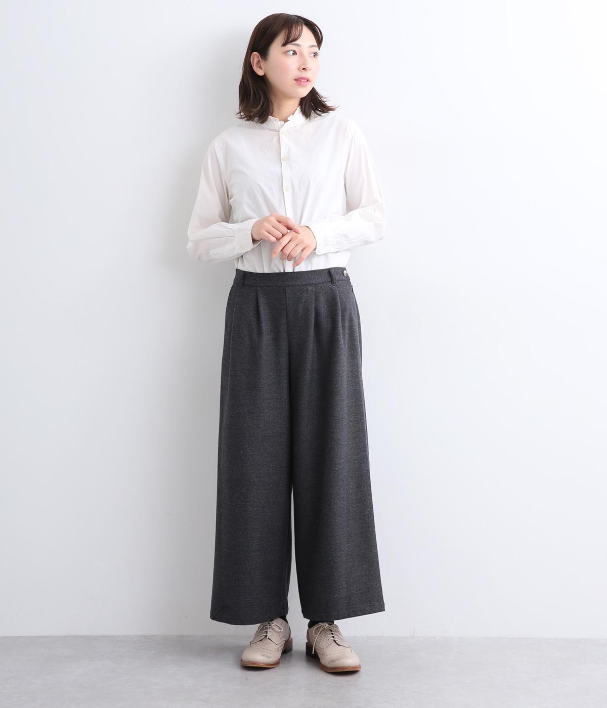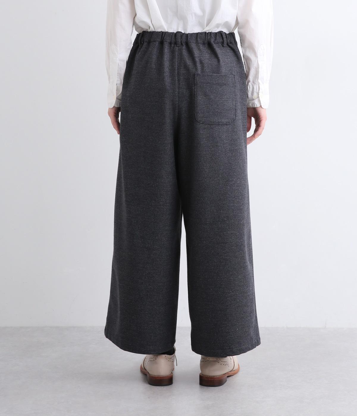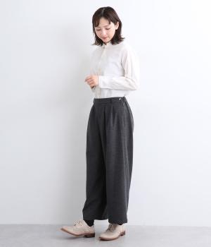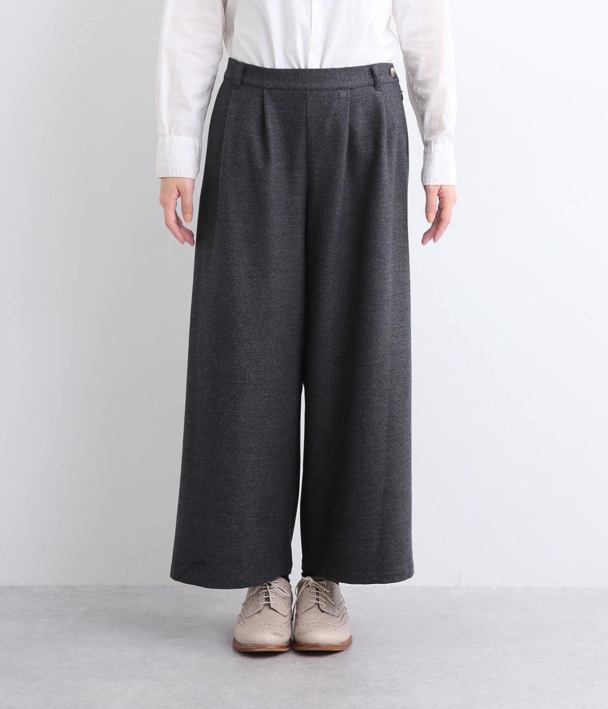 ほどよいワイドシルエットが女性らしい上品さを引き立てるパンツ。前後に入ったタックが腰まわりをすっきり見せます。ウエストはサイドのボタンとファスナー開き。うしろ部分はゴム仕様のため快適な穿き心地です。