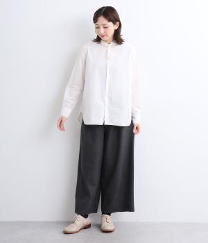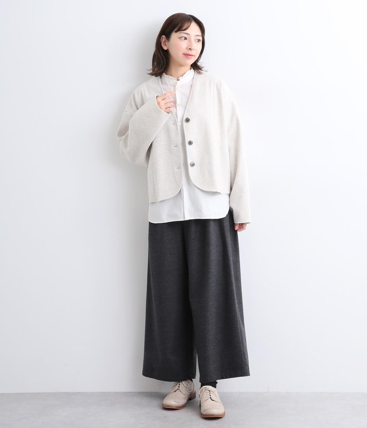 ポリエステルとレーヨンを混紡した両面起毛素材で仕立てました。やわらかい肌ざわりで快適な着心地です。なめらかな質感が品のある雰囲気を演出します。