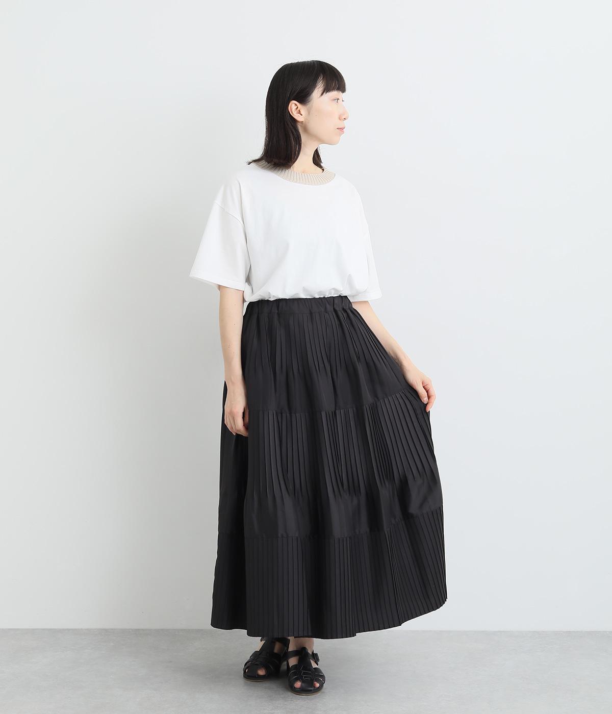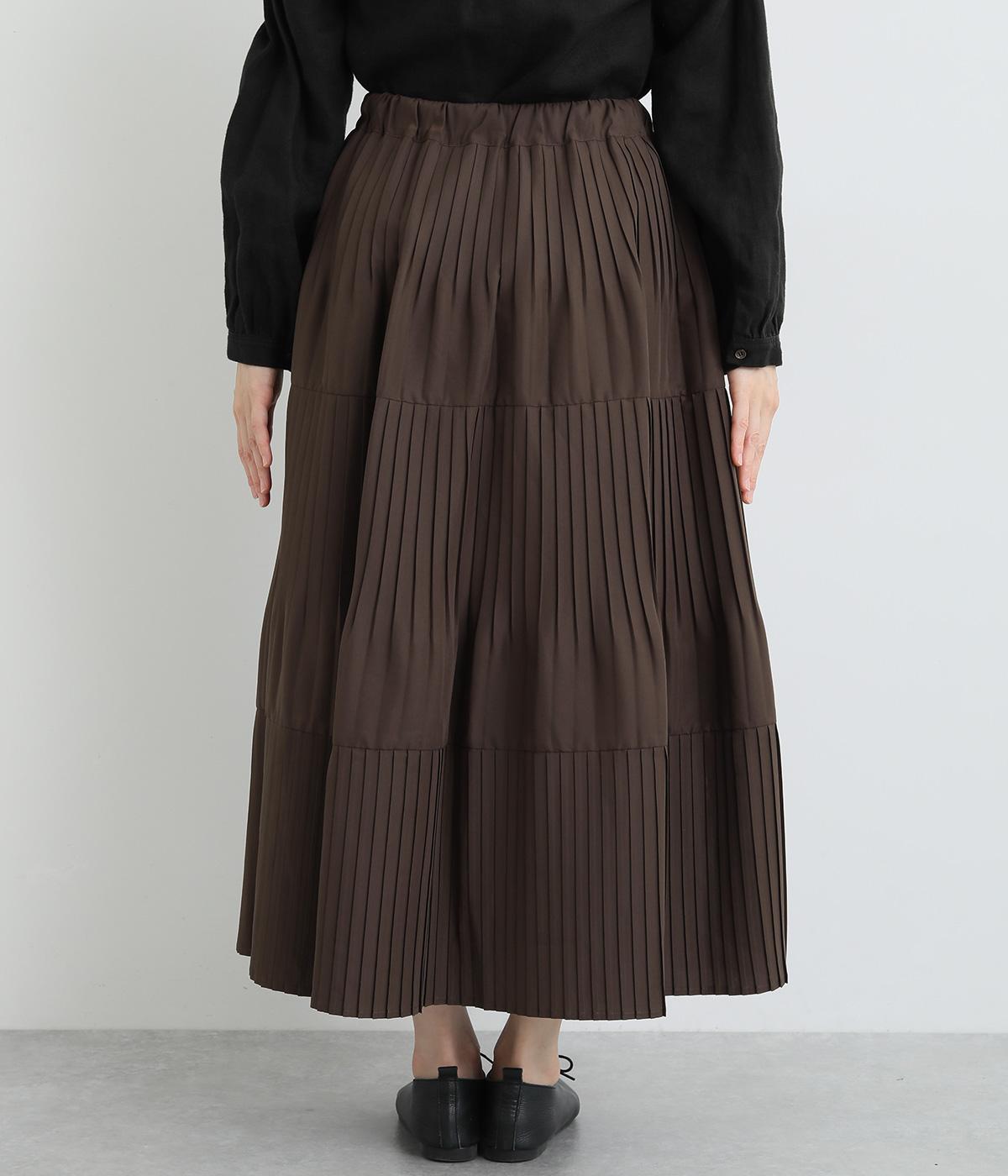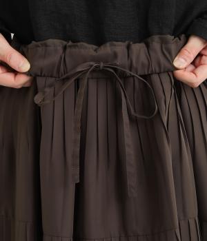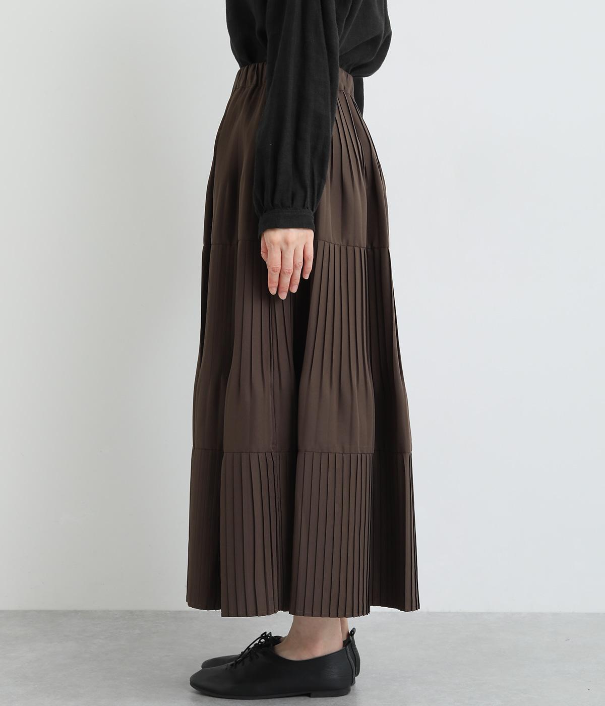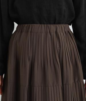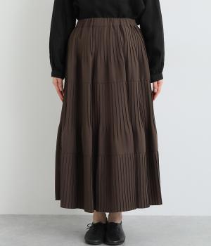 途中から消えるようにかけたプリーツを3段重ね、独特のふんわり感を出したティアードスカートです。落ち着いたカラー展開と上品な素材感で、デイリーからきれいめにも着ていただけます。ウエスト総ゴム、内ひもつきではき心地も快適です。