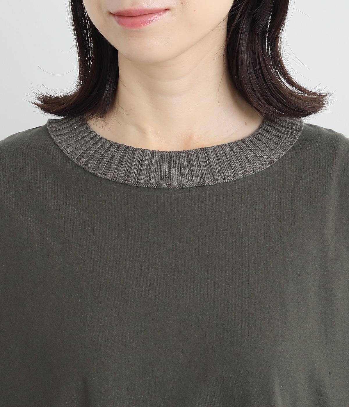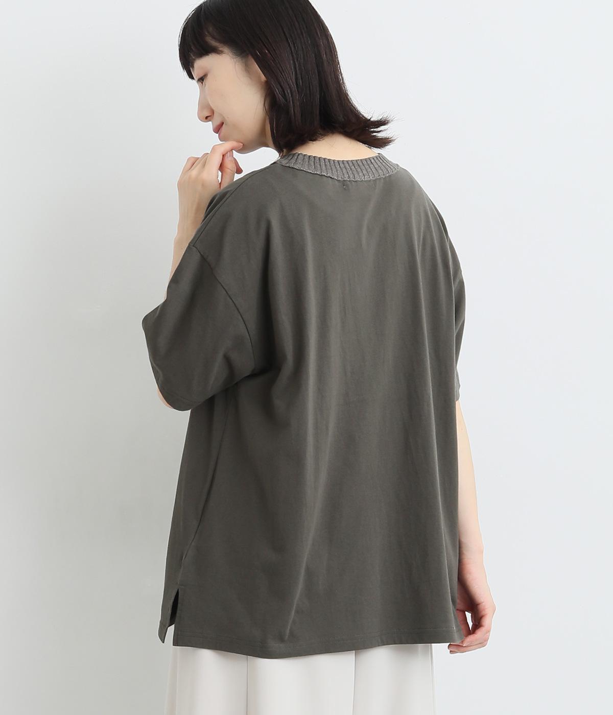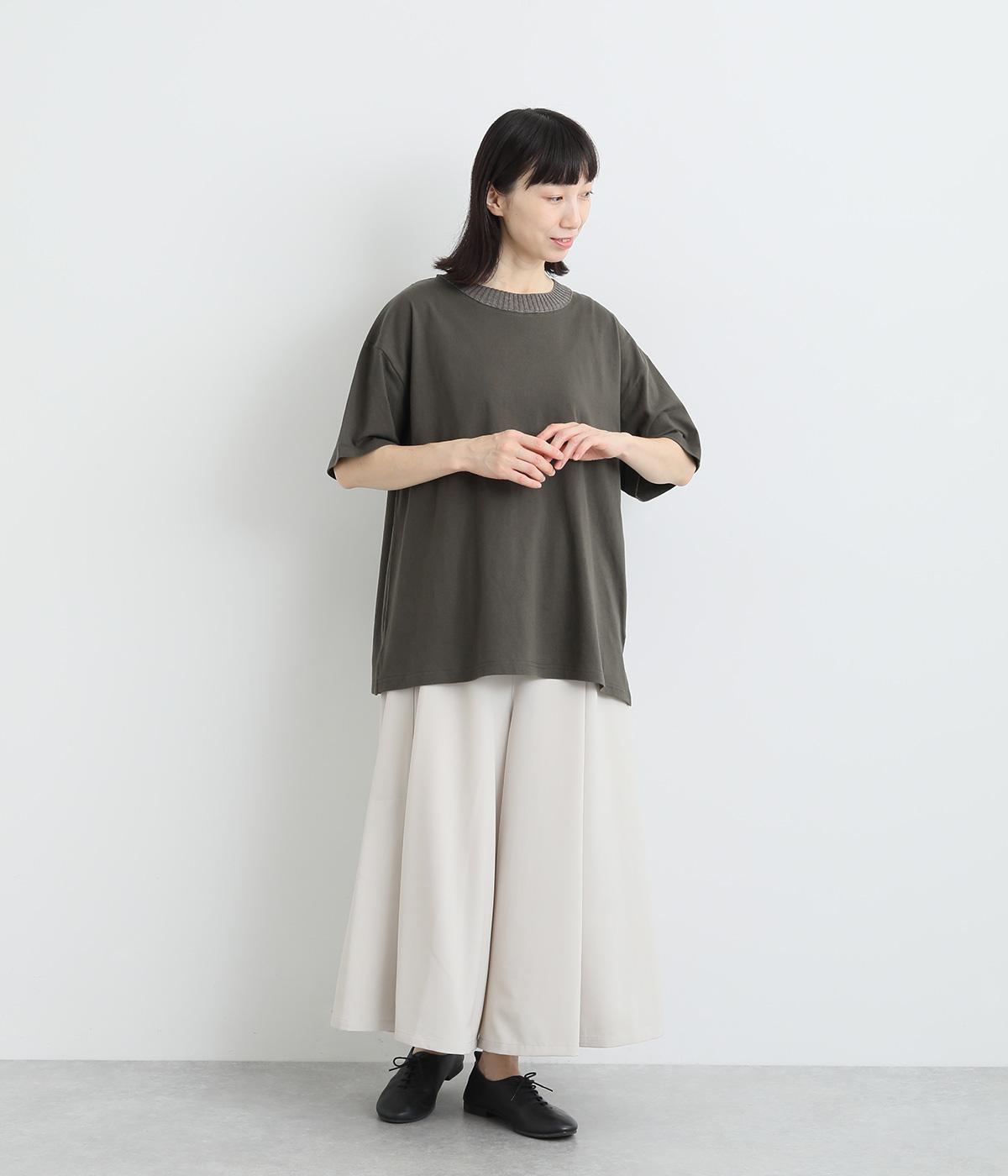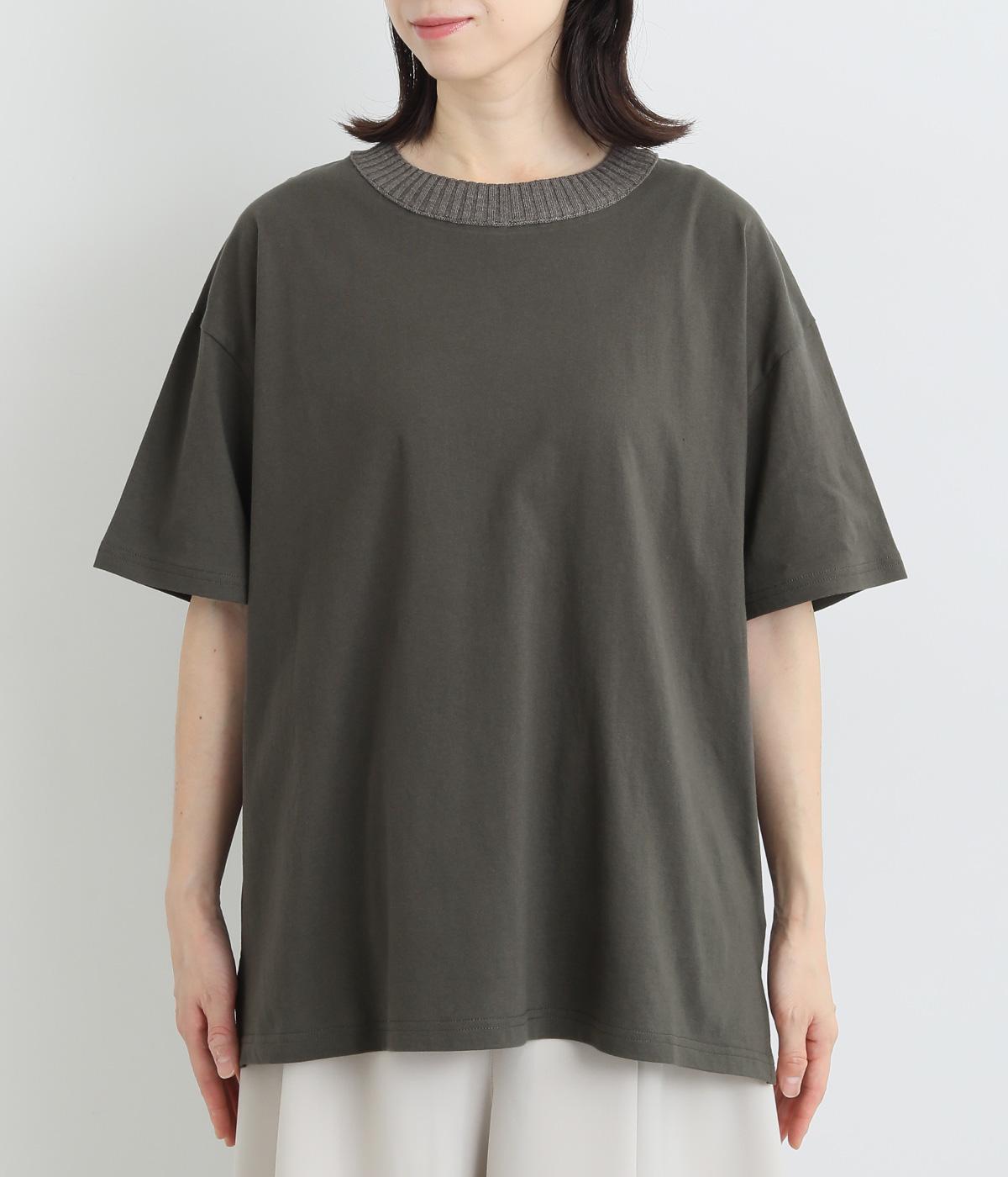 ゆったりシルエットのTシャツにリブニットの襟でデザインポイントをプラス。二の腕をすっぽり覆う長めの袖丈で、安心感のある着心地です。シンプルながら計算されたシルエットでトップスアウトでもバランスが取りやすいです。