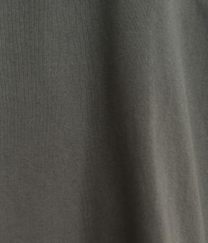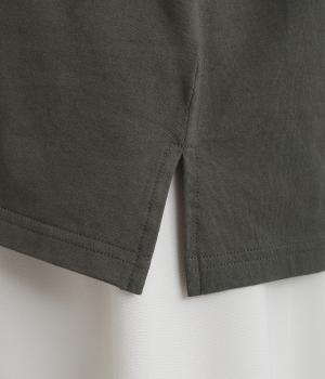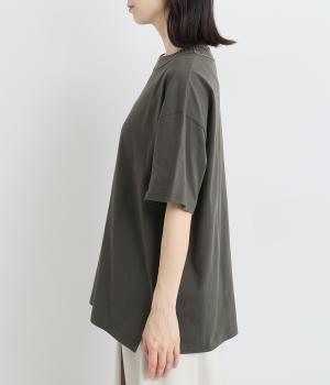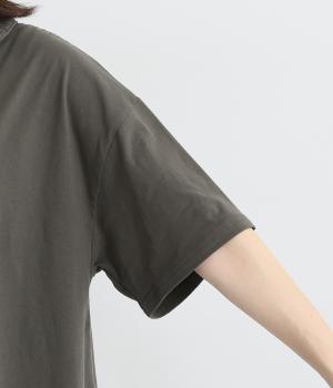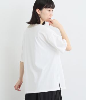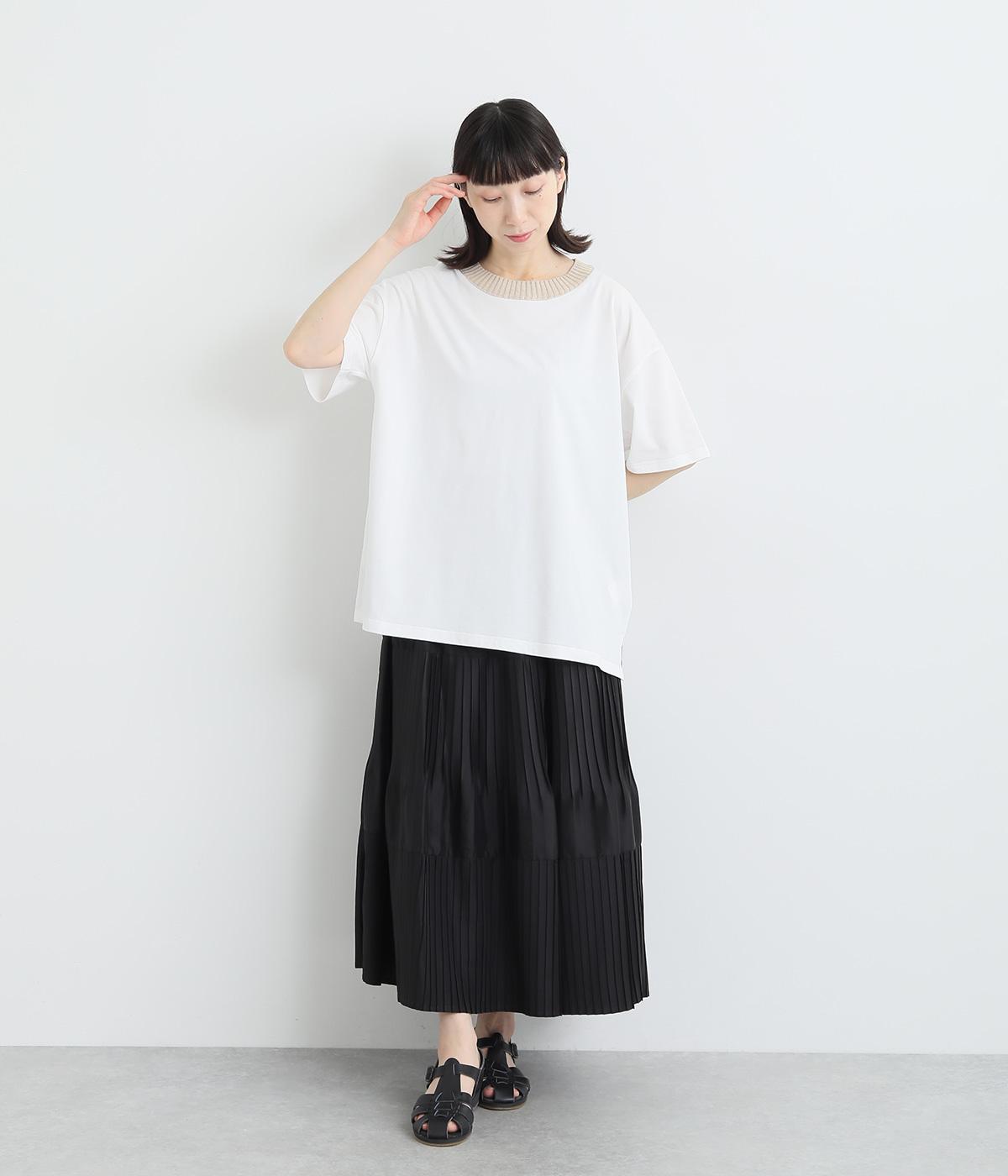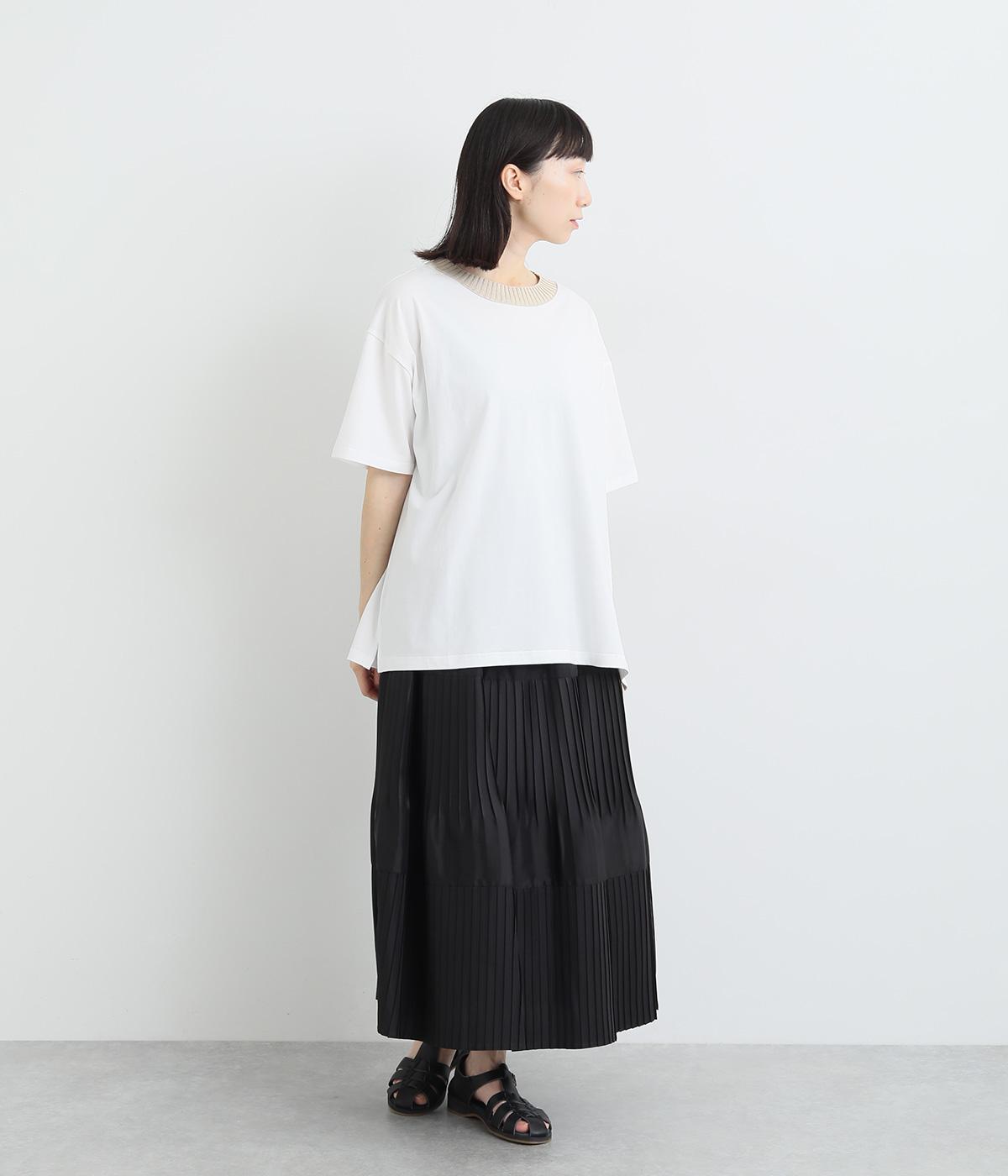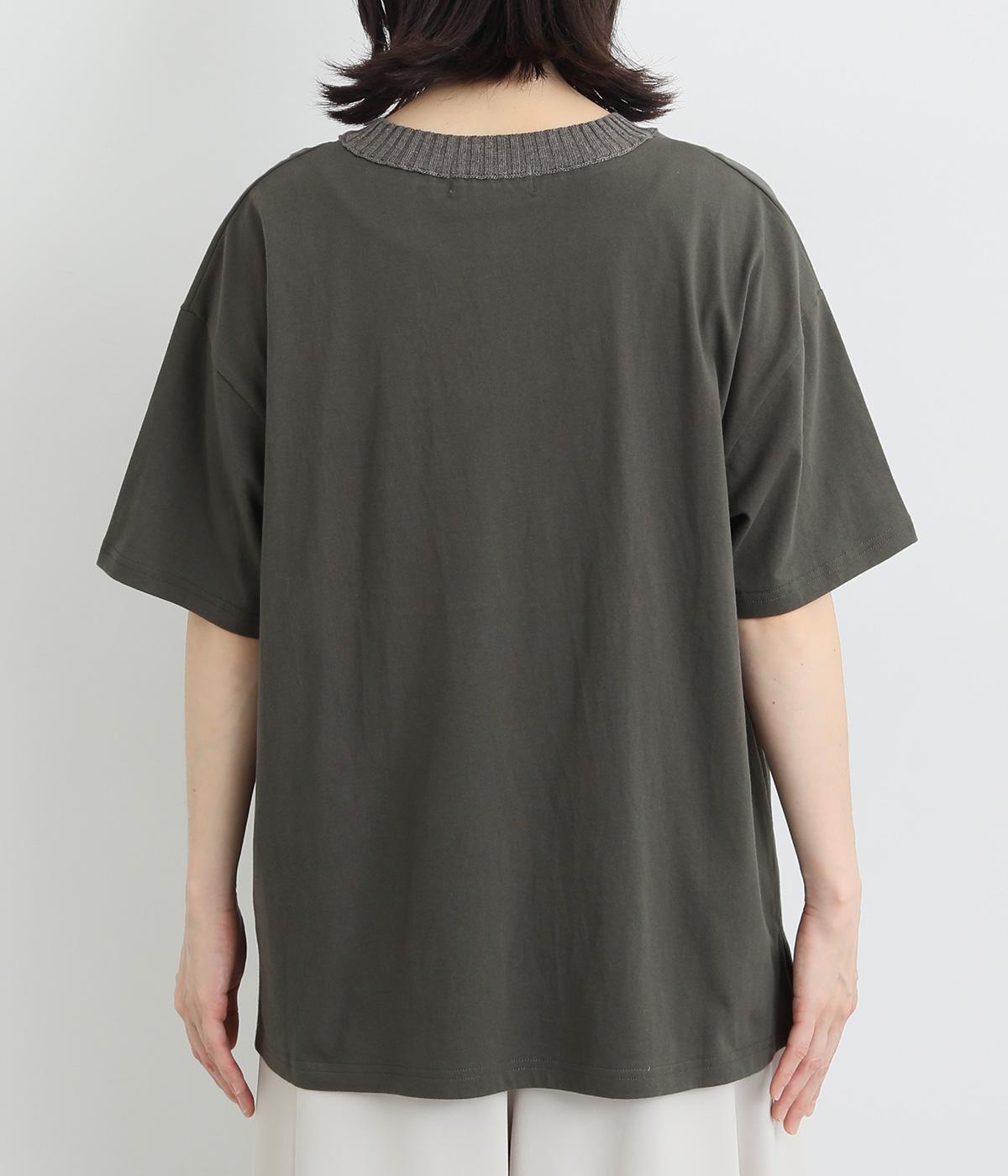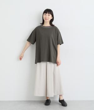 ゆったりシルエットのTシャツにリブニットの襟でデザインポイントをプラス。二の腕をすっぽり覆う長めの袖丈で、安心感のある着心地です。シンプルながら計算されたシルエットでトップスアウトでもバランスが取りやすいです。