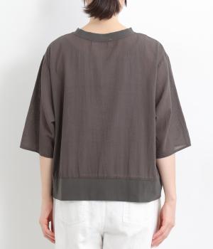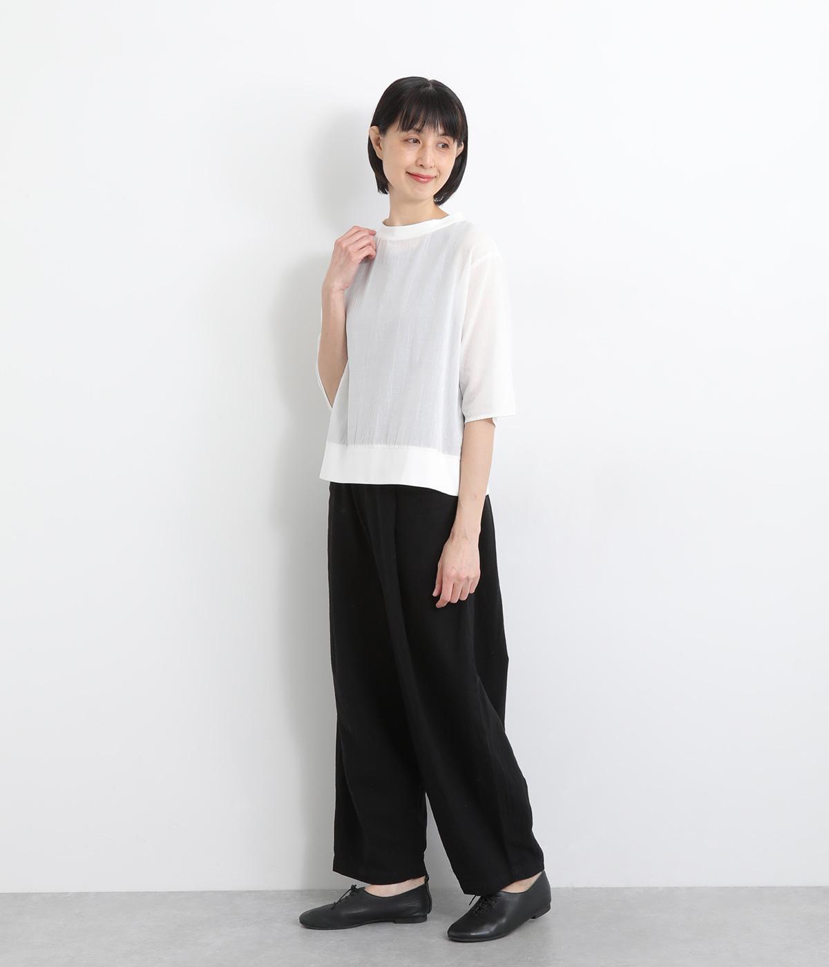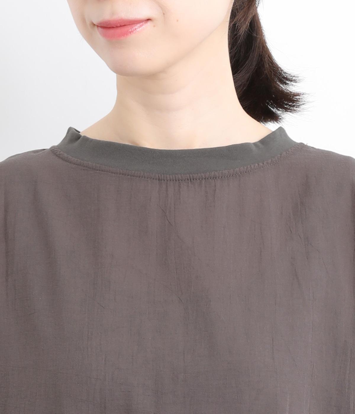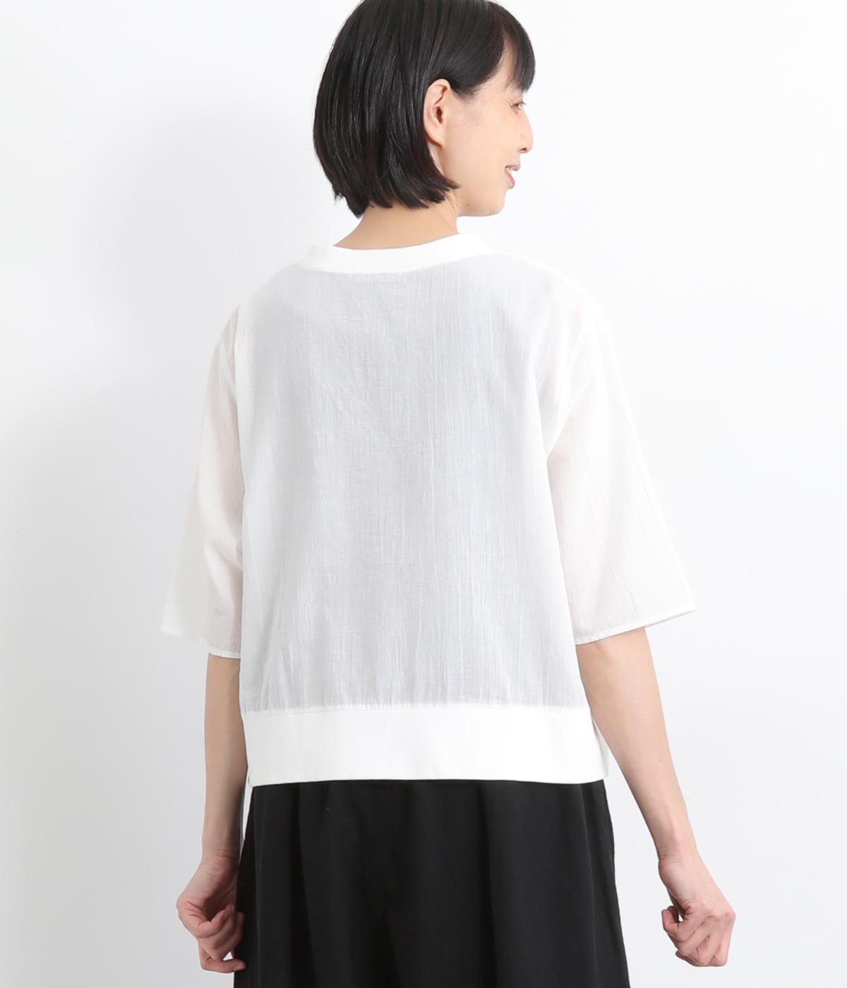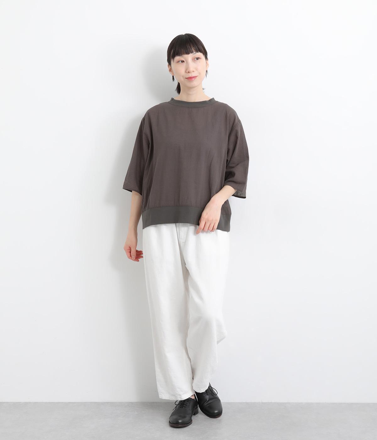 上品な透け感のあるコットン素材をベースに使用しています。襟や裾にドッキングしたリブにはレーヨン混素材を用いてきれいめな印象をキープしました。