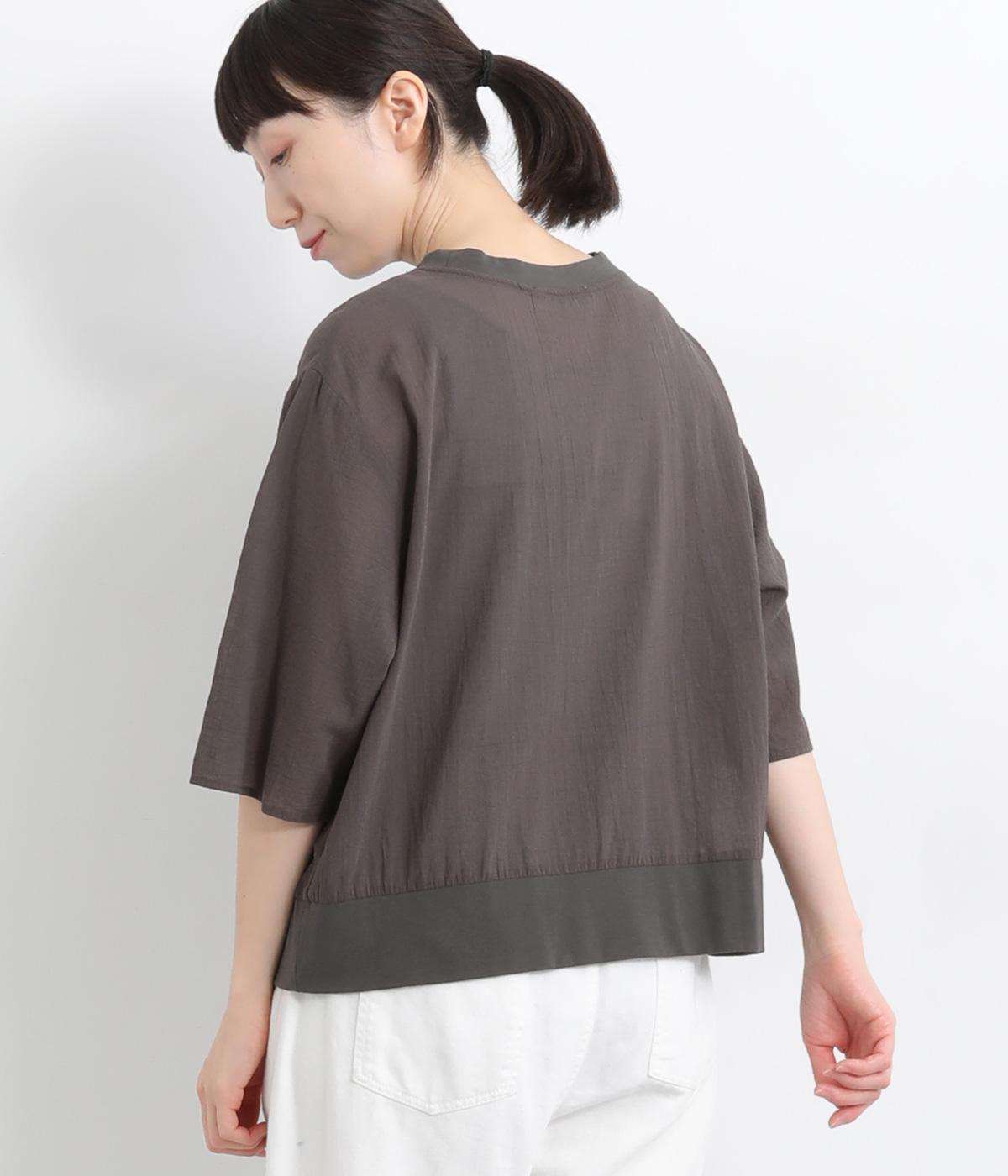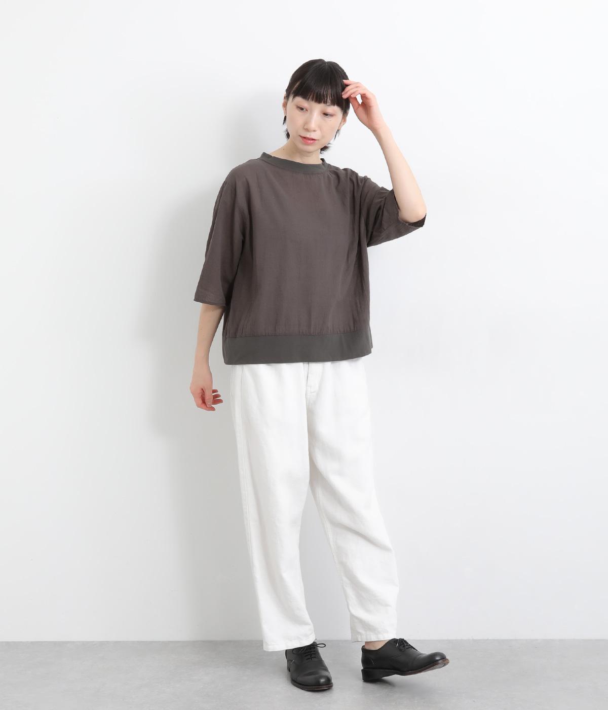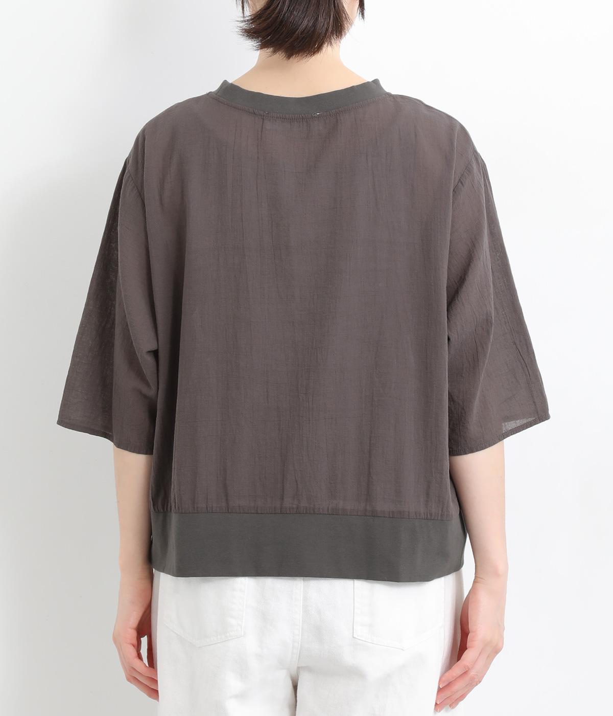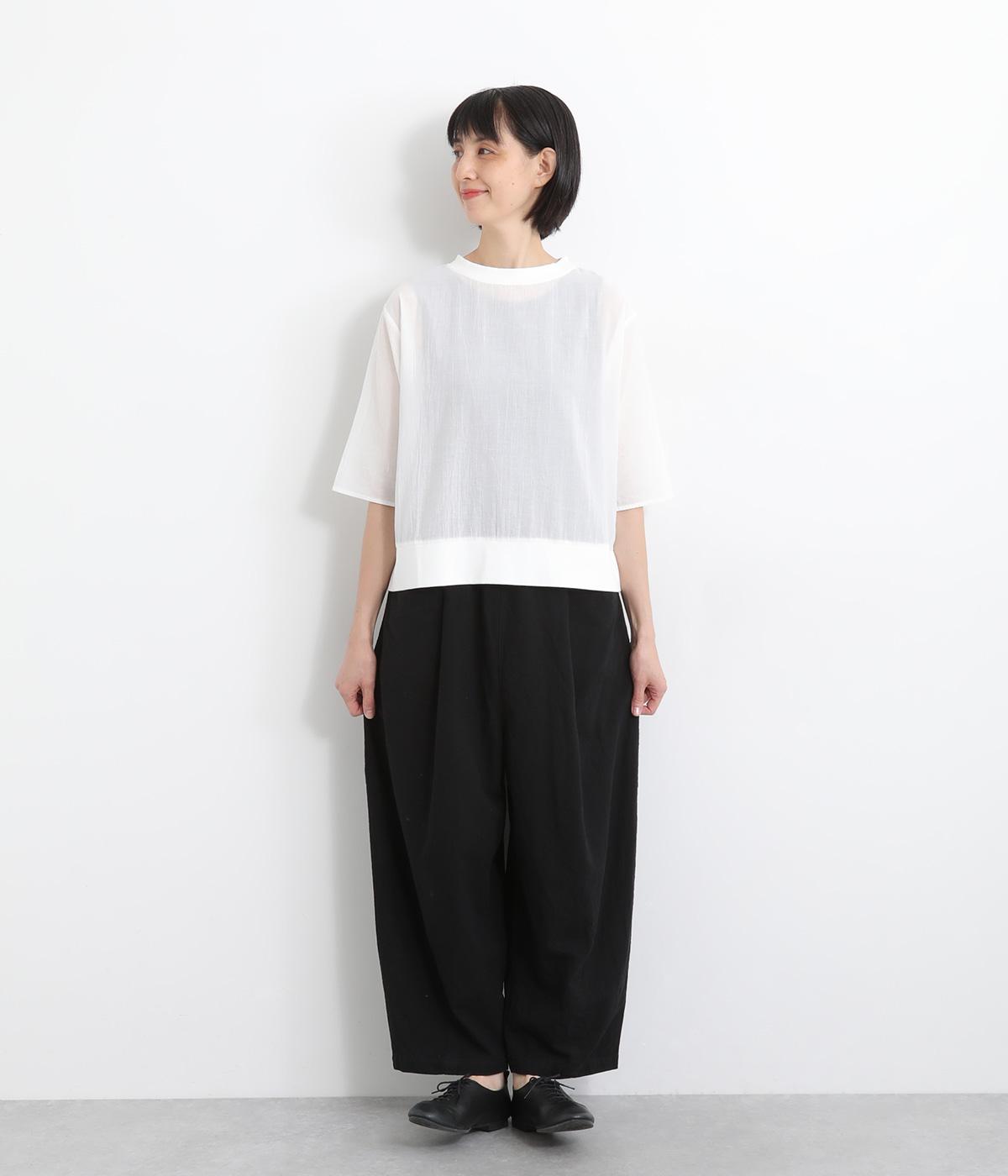 上品な透け感のあるコットン素材をベースに使用しています。襟や裾にドッキングしたリブにはレーヨン混素材を用いてきれいめな印象をキープしました。