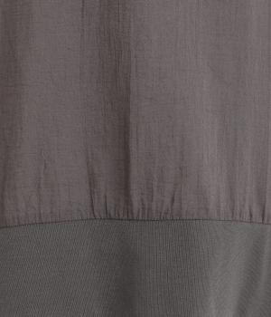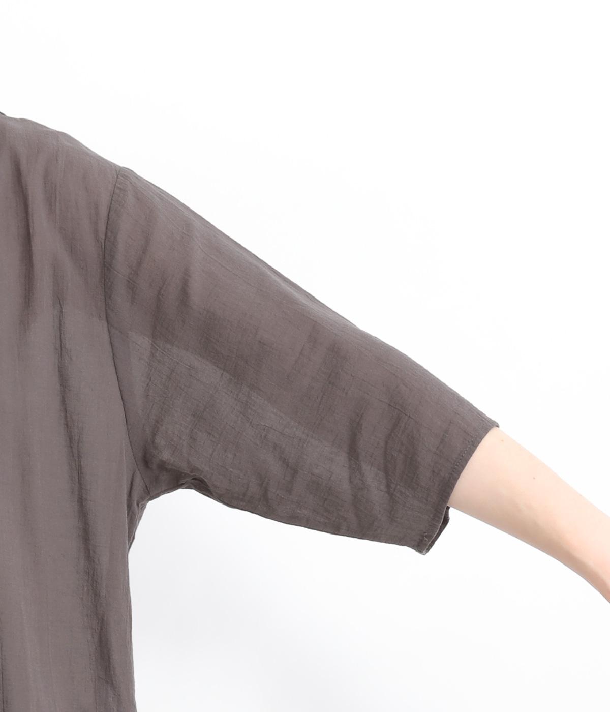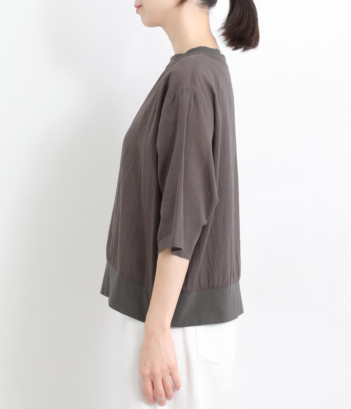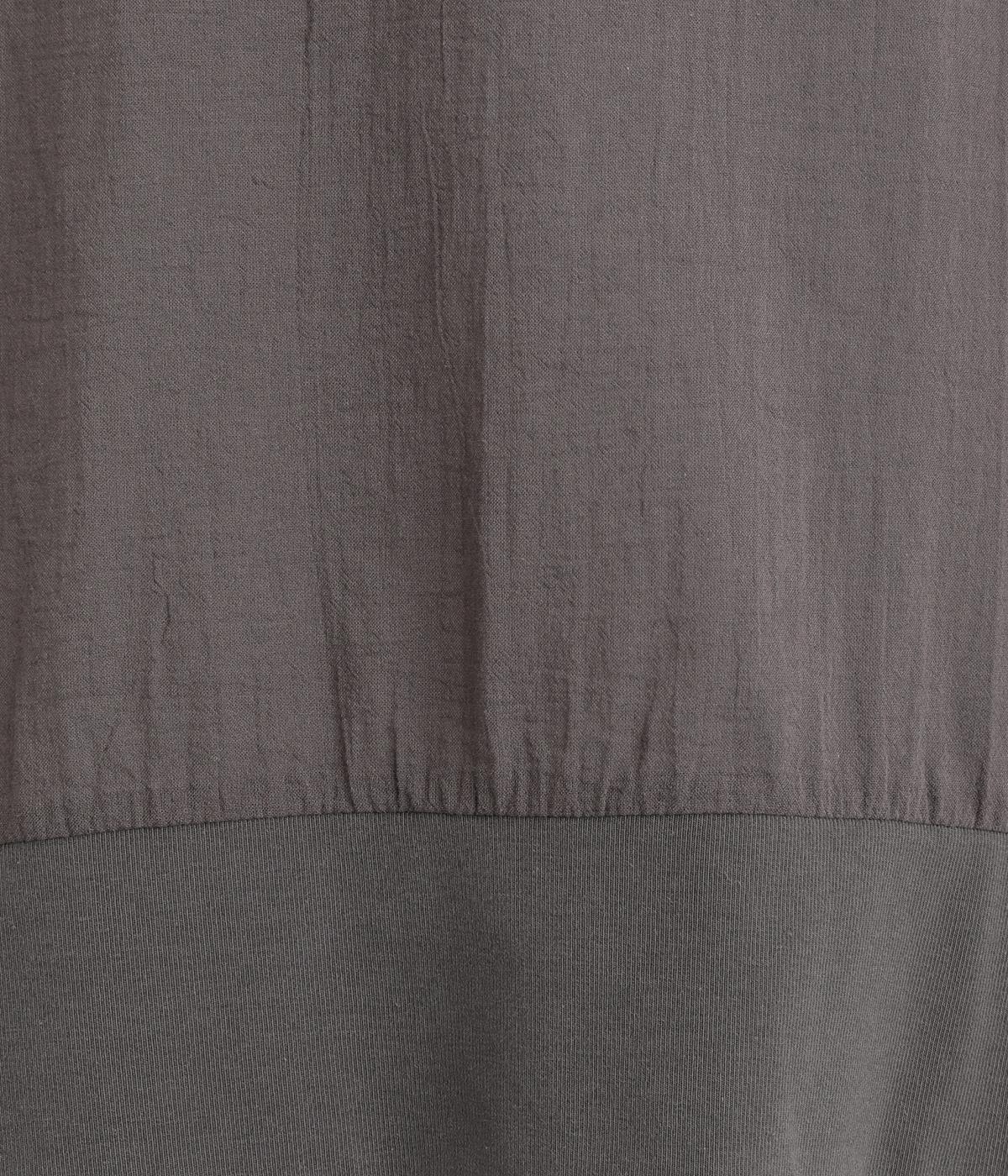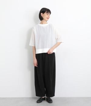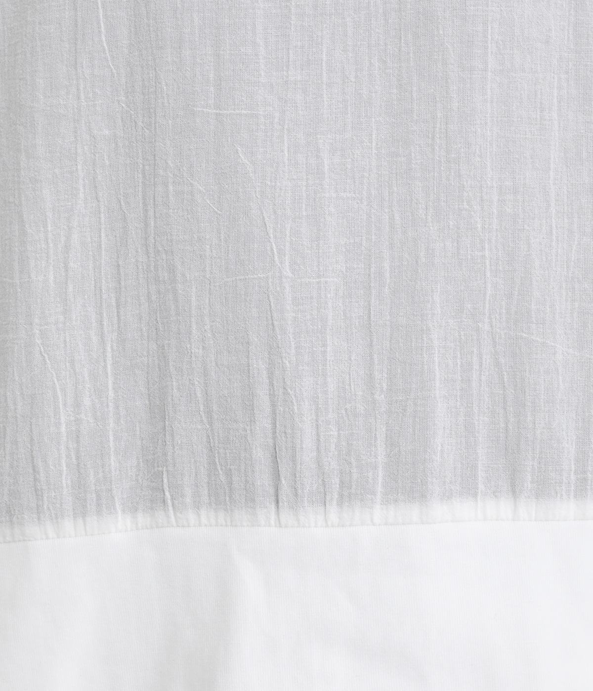 上品な透け感のあるコットン素材をベースに使用しています。襟や裾にドッキングしたリブにはレーヨン混素材を用いてきれいめな印象をキープしました。