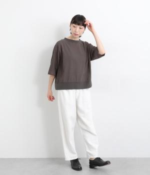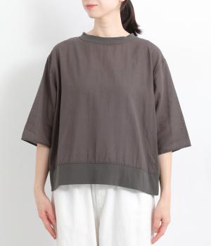 襟や裾にきれいめリブ素材をドッキングしたショート丈のプルオーバー。シンプルなデザインながらもシアーで奥行きのあるスタイリングを叶えてくれます。ひじにかかるほどの袖丈もグッドポイントで、汗ばむ季節に着やすい素材感ながら冷房対策にも活躍。