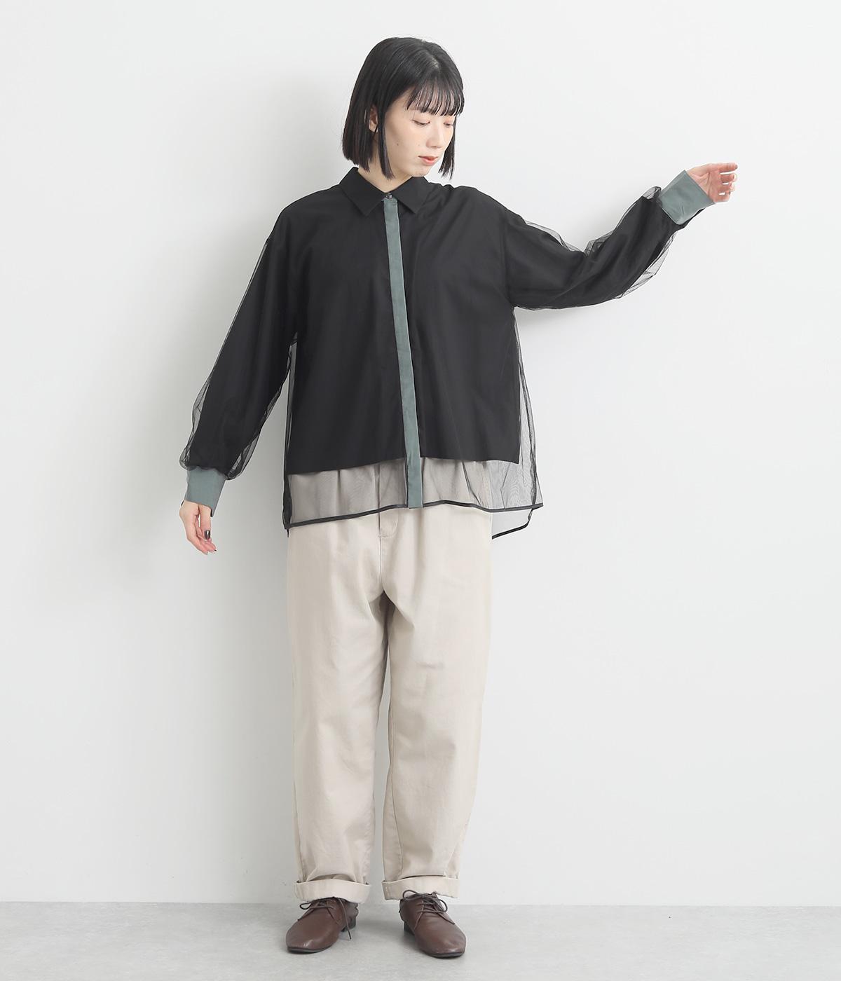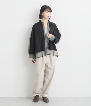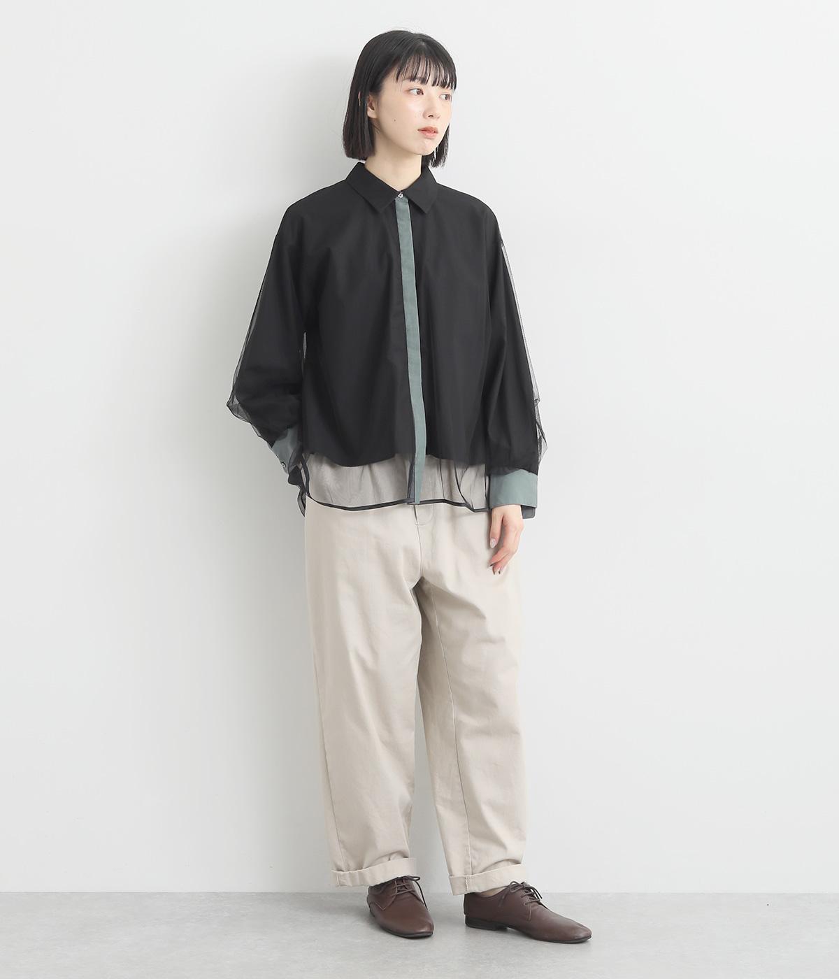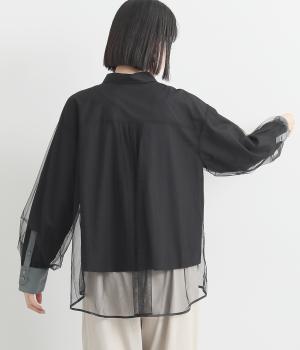 テクニックいらずで洒落感たっぷりの着こなしが完成するシャツブラウス。上品なチュールがハンサムなシャツを女性らしく昇華してくれます。すっきり見えを叶える、袖口や前立ての配色デザインも◎。チュールはシャツよりも丈を長くしており、裾の軽やかな透け感も素敵です。