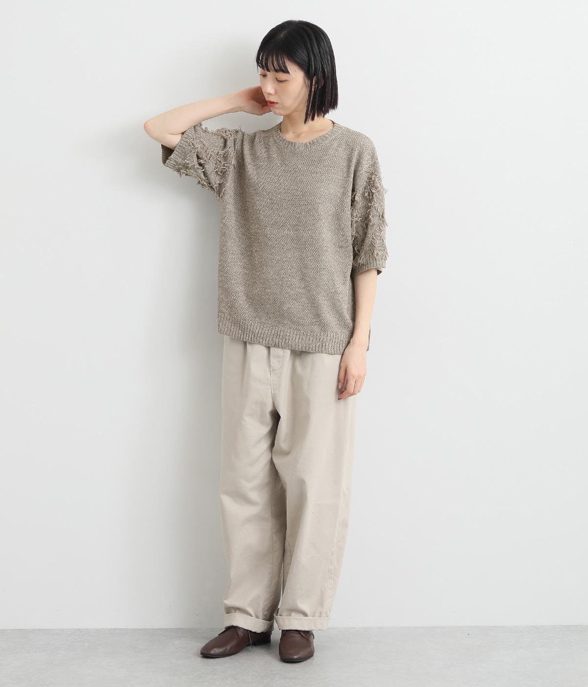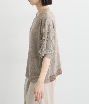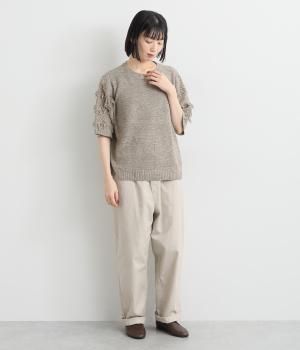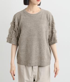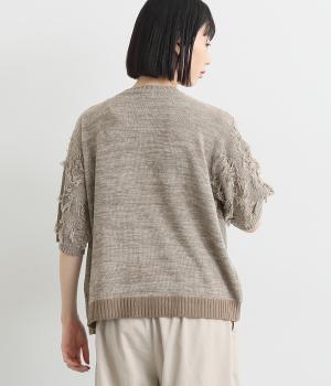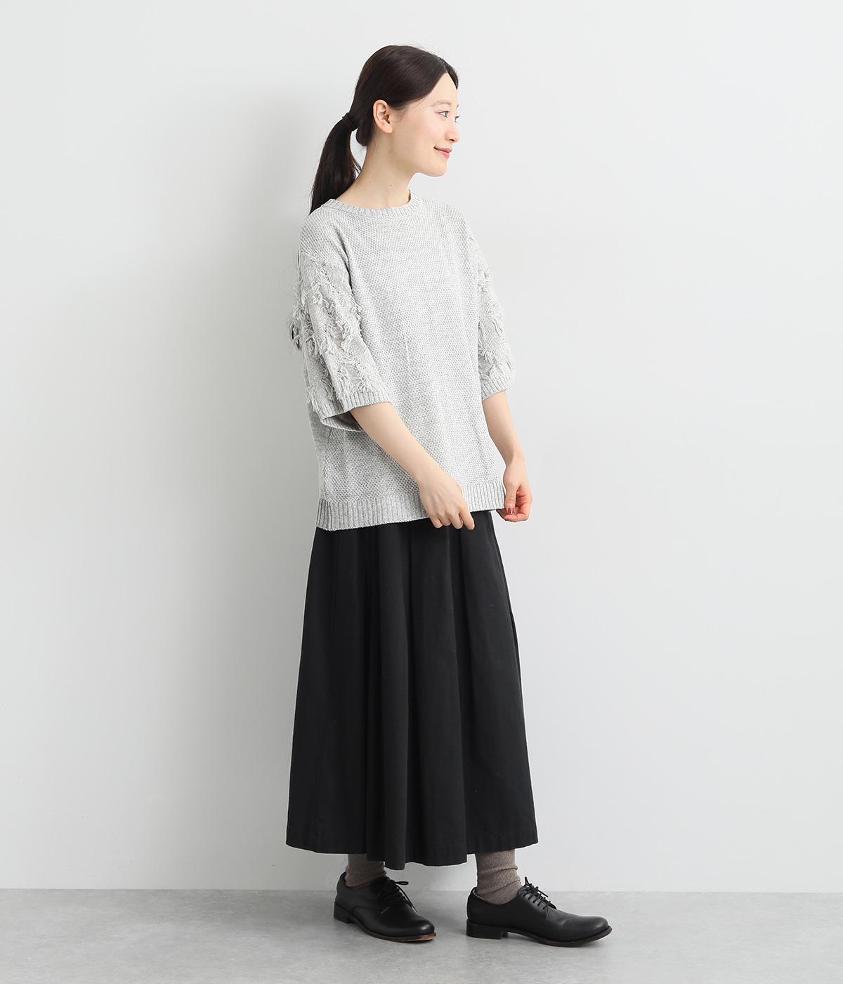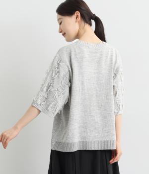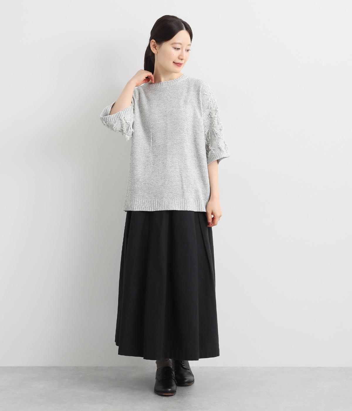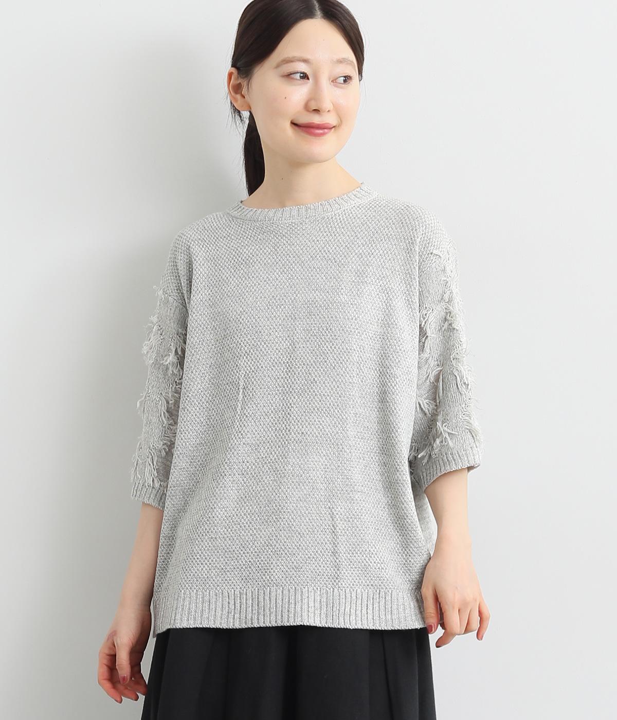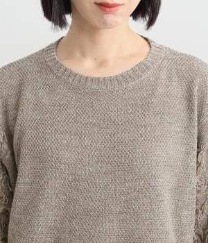 着まわし力の高さは保ちつつも、袖のフリンジで洒落感をぐっとアップさせたニットプルオーバー。前後で編み方に変化をつけており、さりげないこだわりが光ります。ひじにかかる五分袖とフリンジが気になる二の腕をカバーしてくれるのも魅力です。
