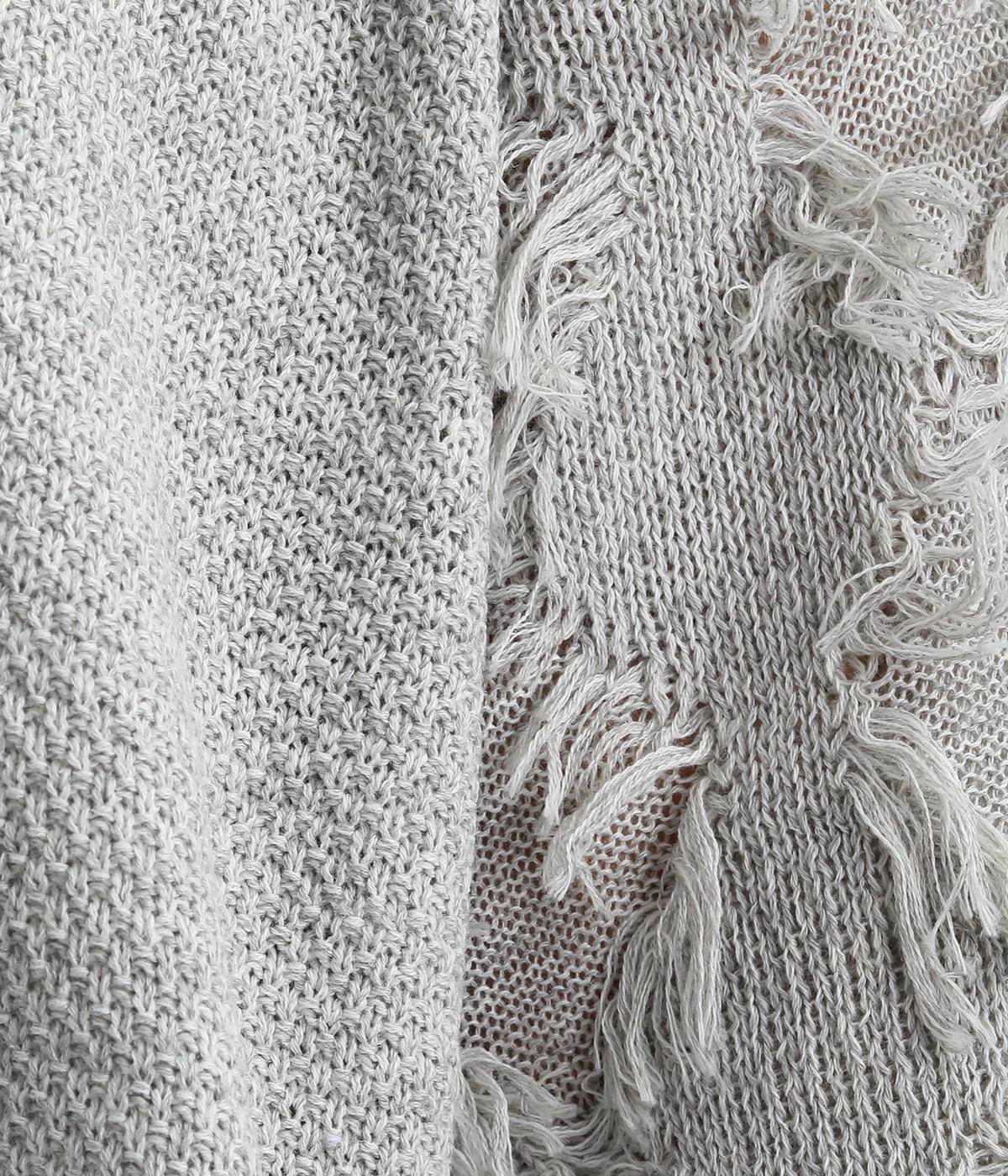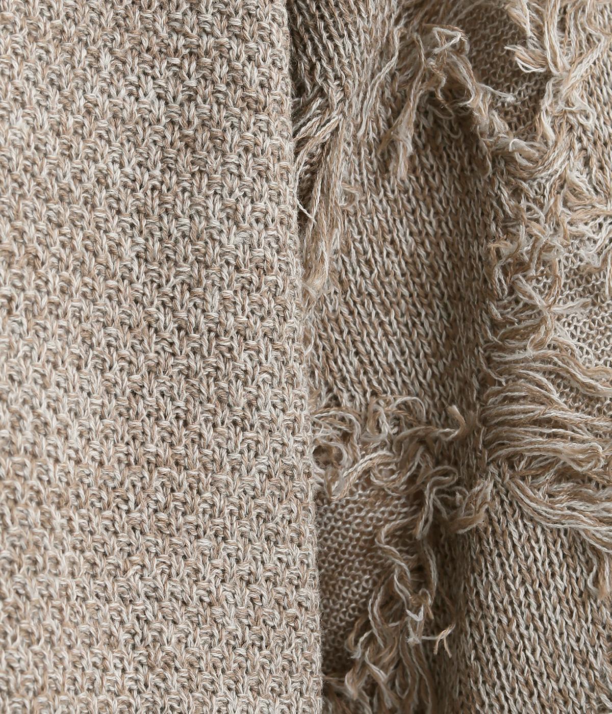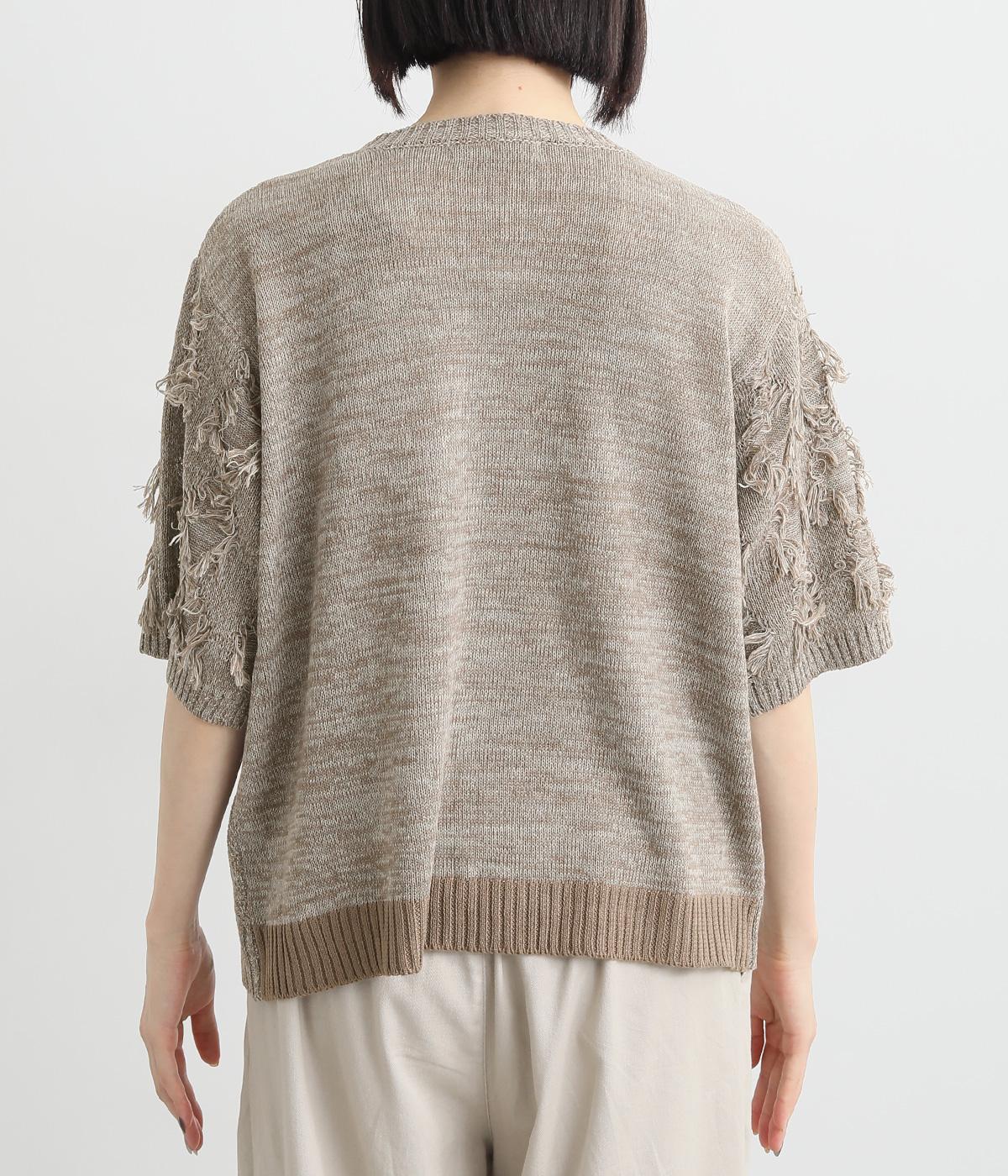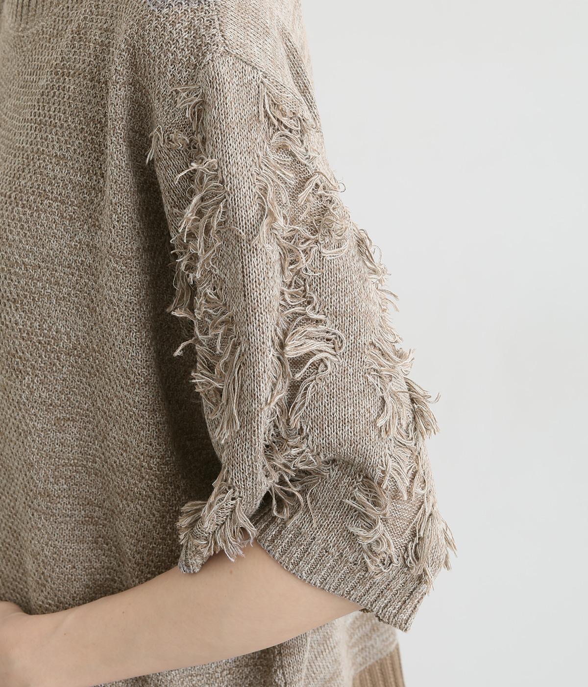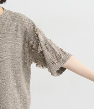 着まわし力の高さは保ちつつも、袖のフリンジで洒落感をぐっとアップさせたニットプルオーバー。前後で編み方に変化をつけており、さりげないこだわりが光ります。ひじにかかる五分袖とフリンジが気になる二の腕をカバーしてくれるのも魅力です。