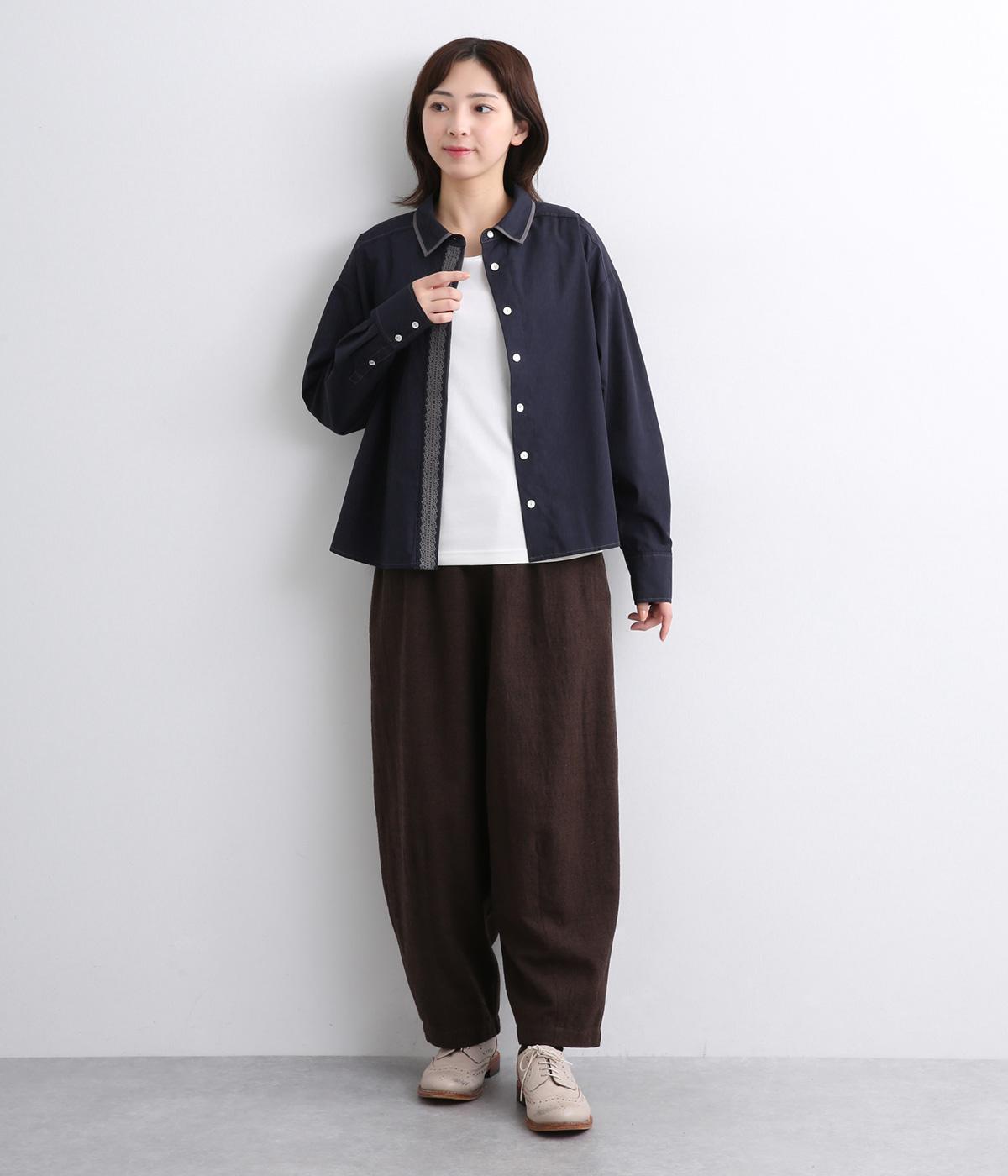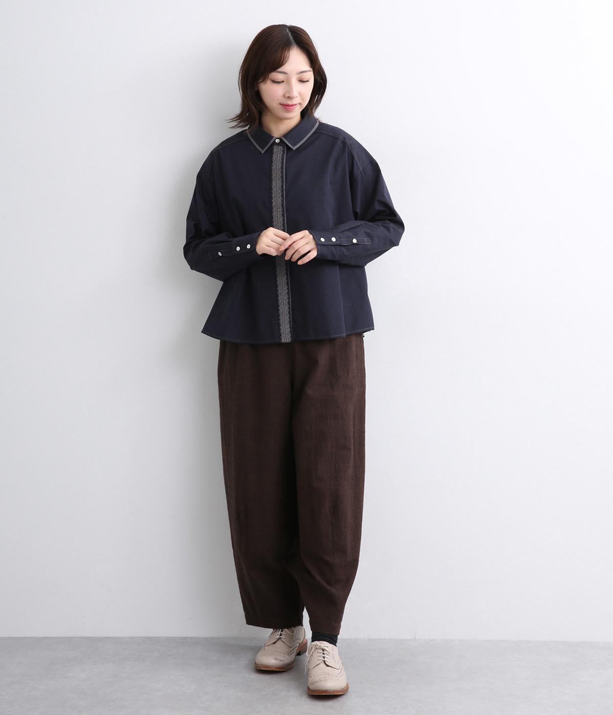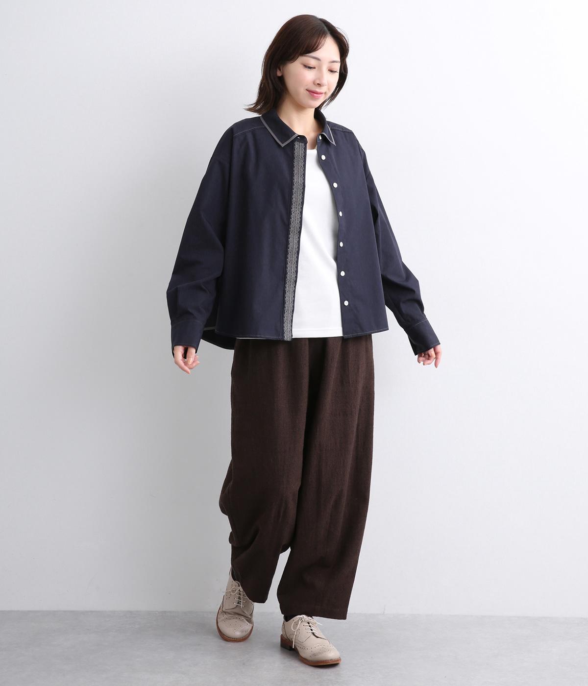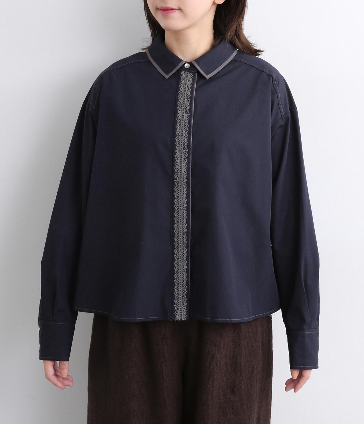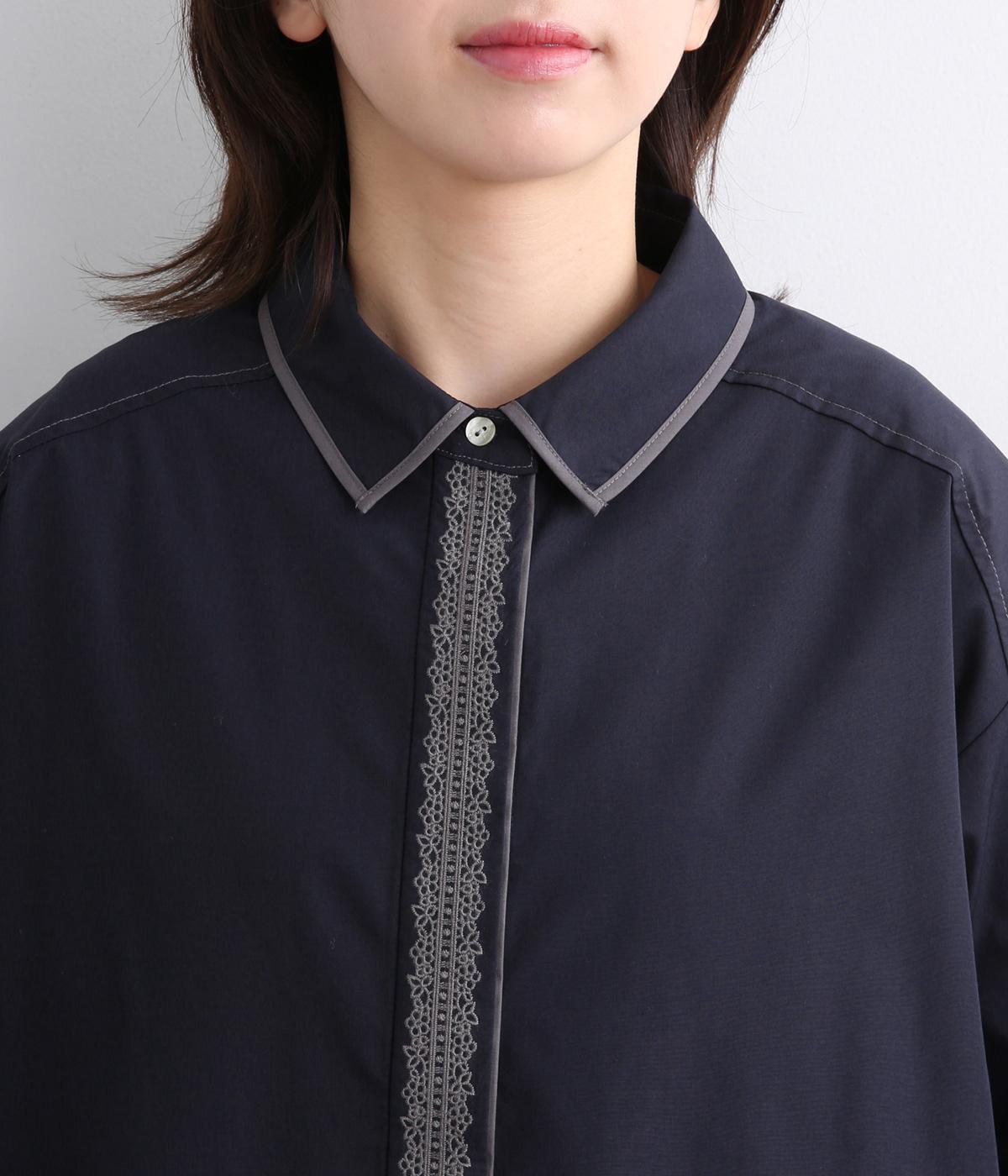 前立ての繊細なレース刺しゅうをほどこしたシャツ。襟とうしろ裾のパイピングがアクセントになっています。一枚で着映えし、オンにもオフにも活躍します。カジュアルアイテムとも好相性で着まわし力も◎。