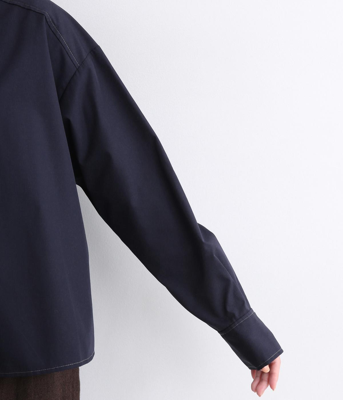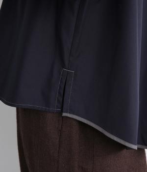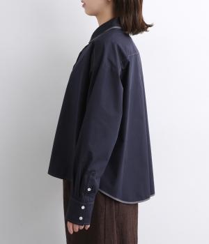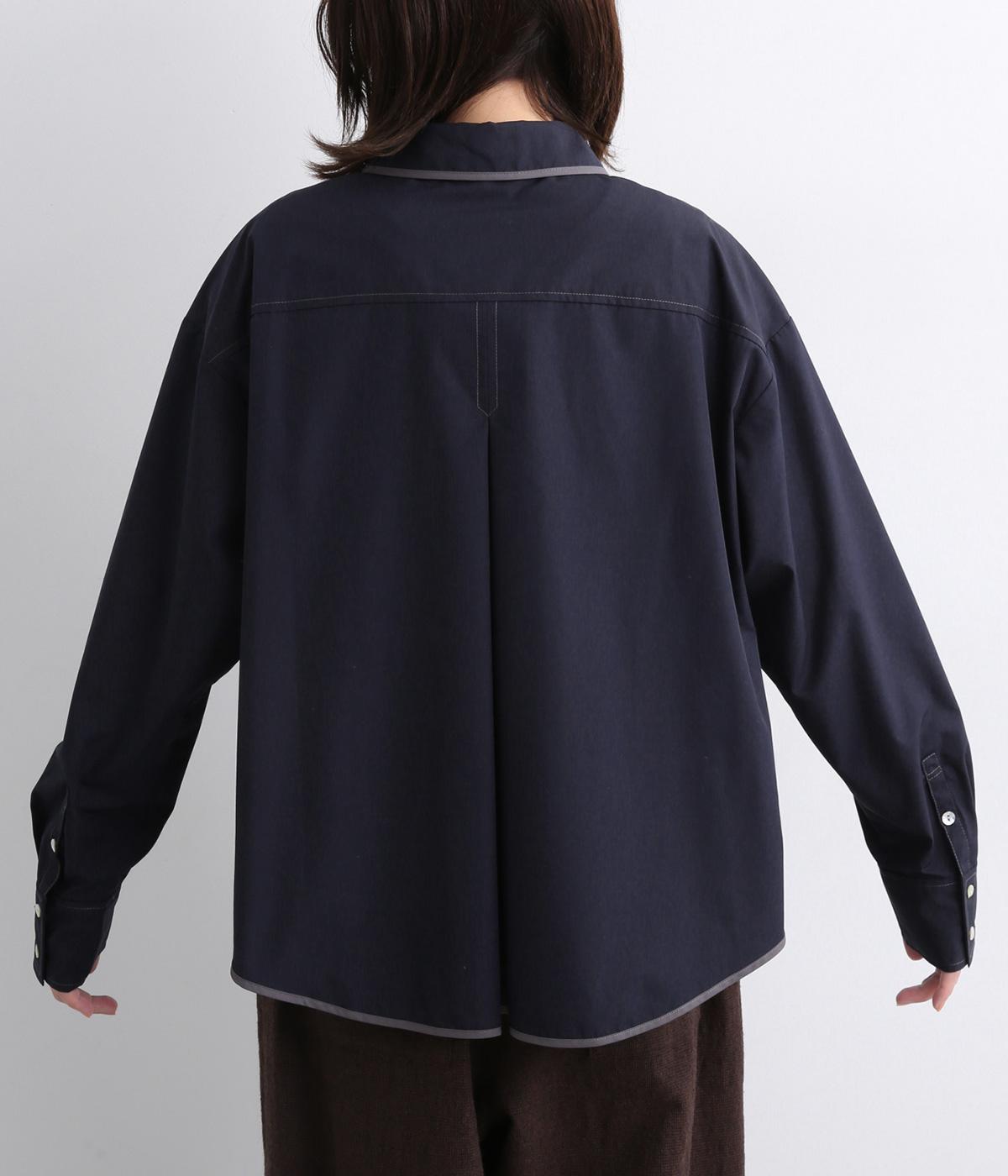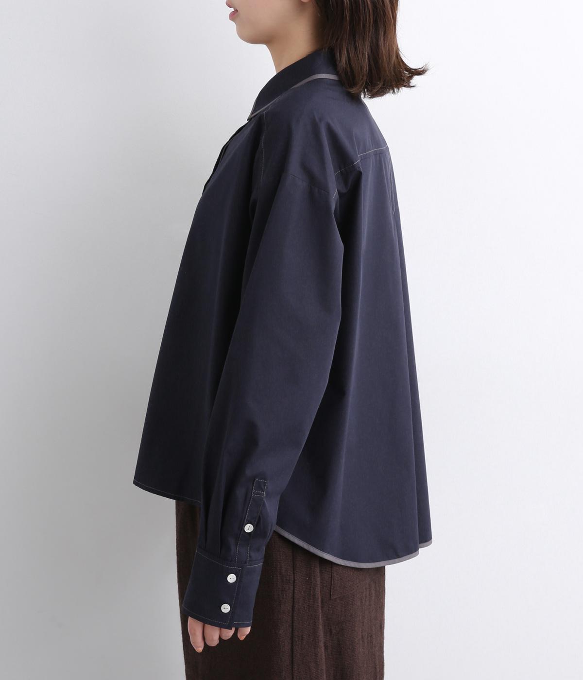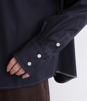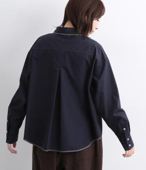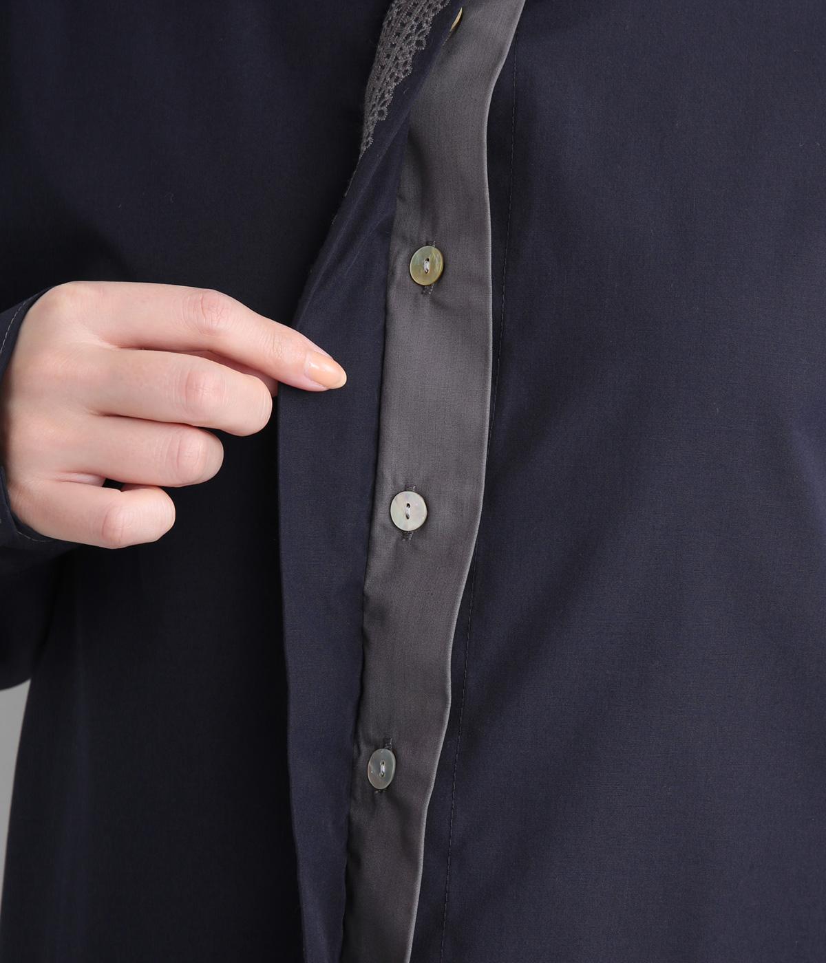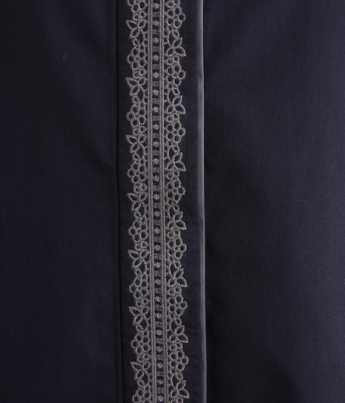 前立ての繊細なレース刺しゅうをほどこしたシャツ。襟とうしろ裾のパイピングがアクセントになっています。一枚で着映えし、オンにもオフにも活躍します。カジュアルアイテムとも好相性で着まわし力も◎。