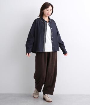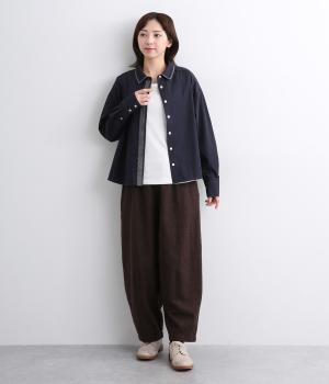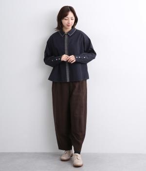 適度なハリ感がきちんと見えする素材感です。ドライな質感でほんのり光沢があり品のある雰囲気に仕立てています。綿ポリエステルで扱いやすいのもうれしいポイントです。
