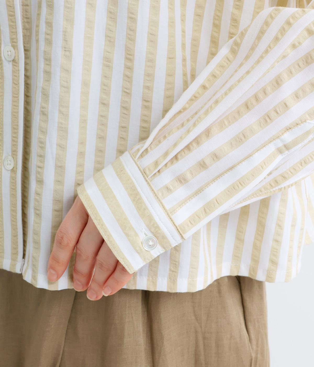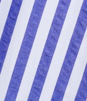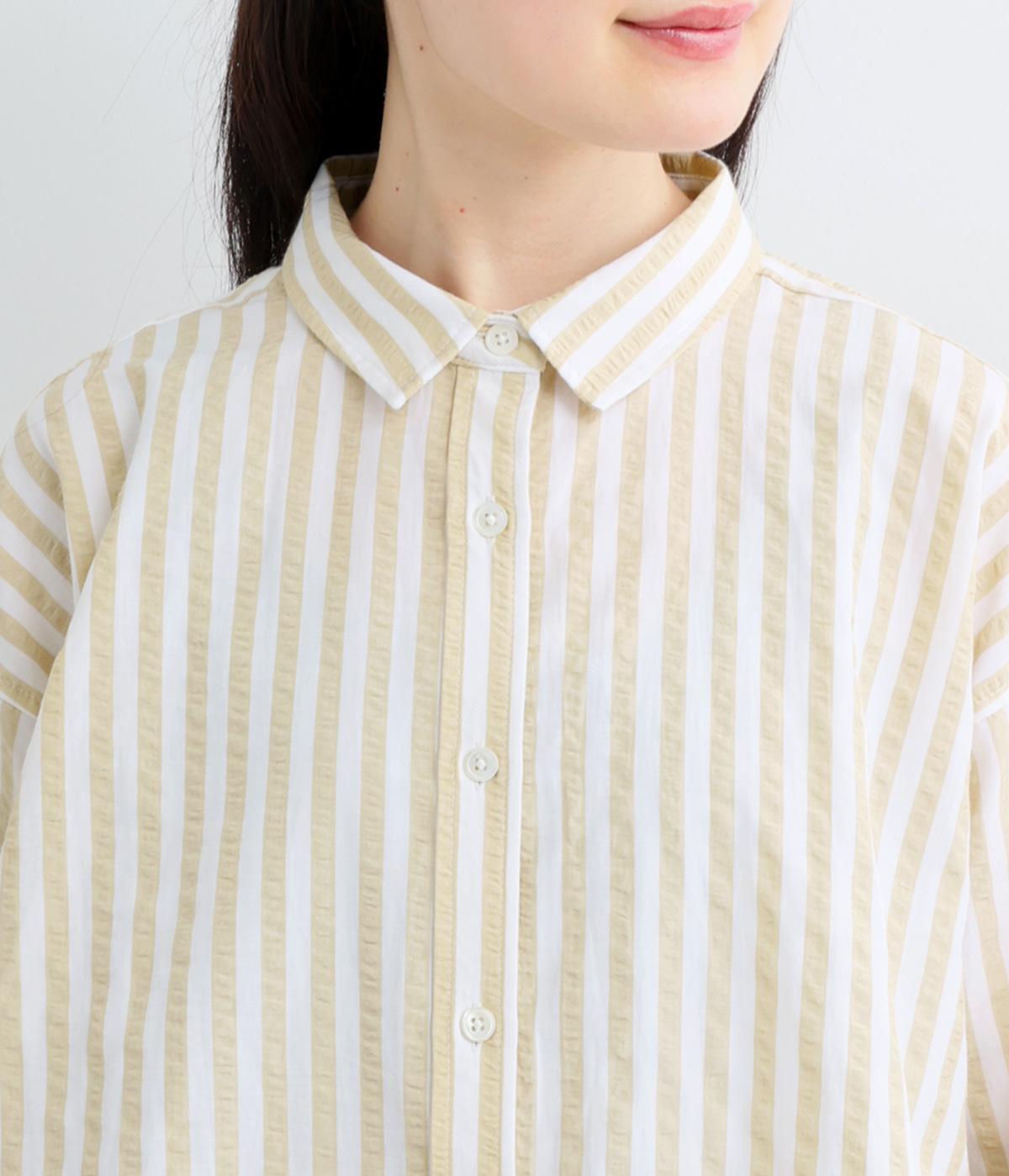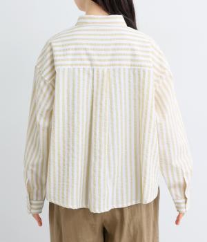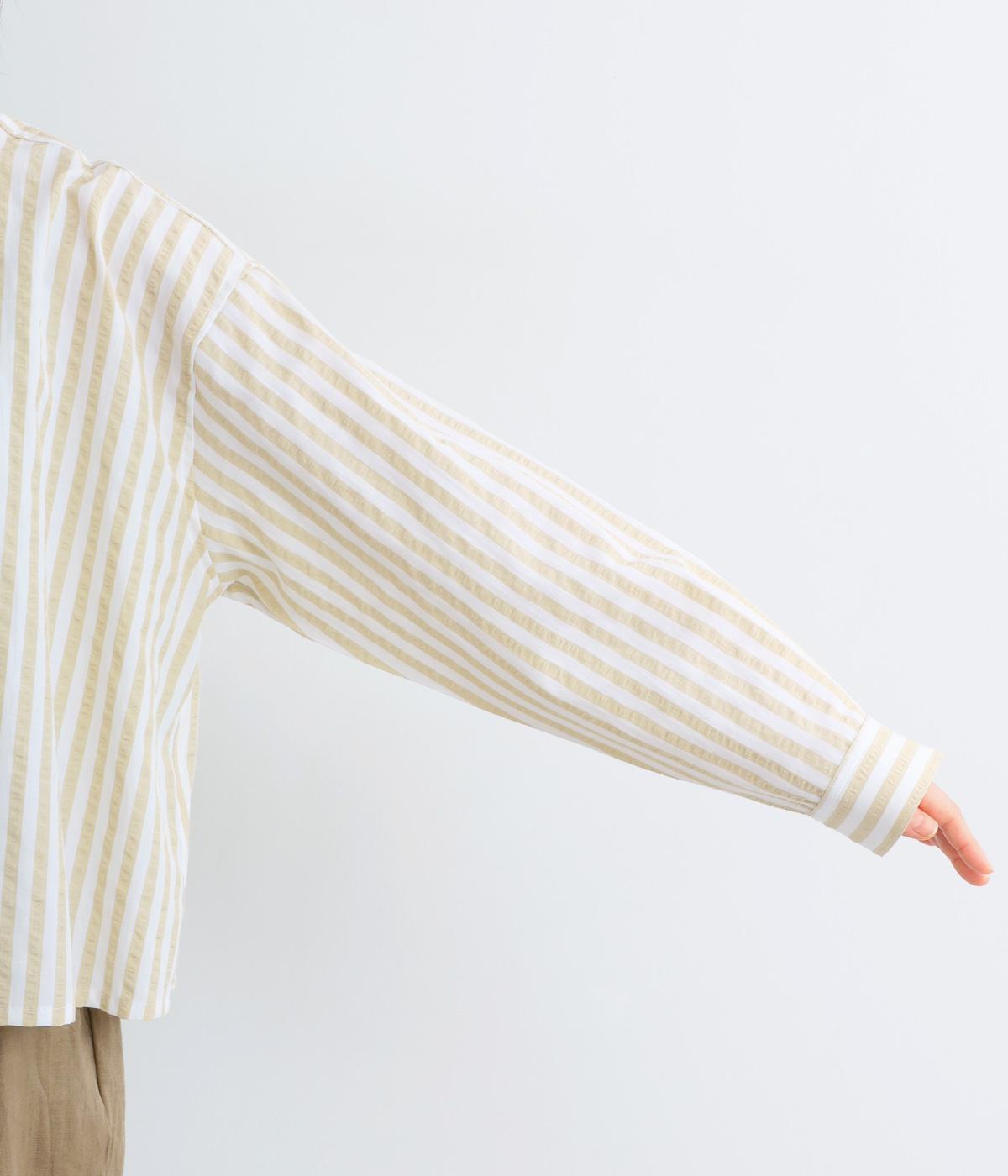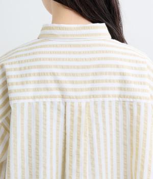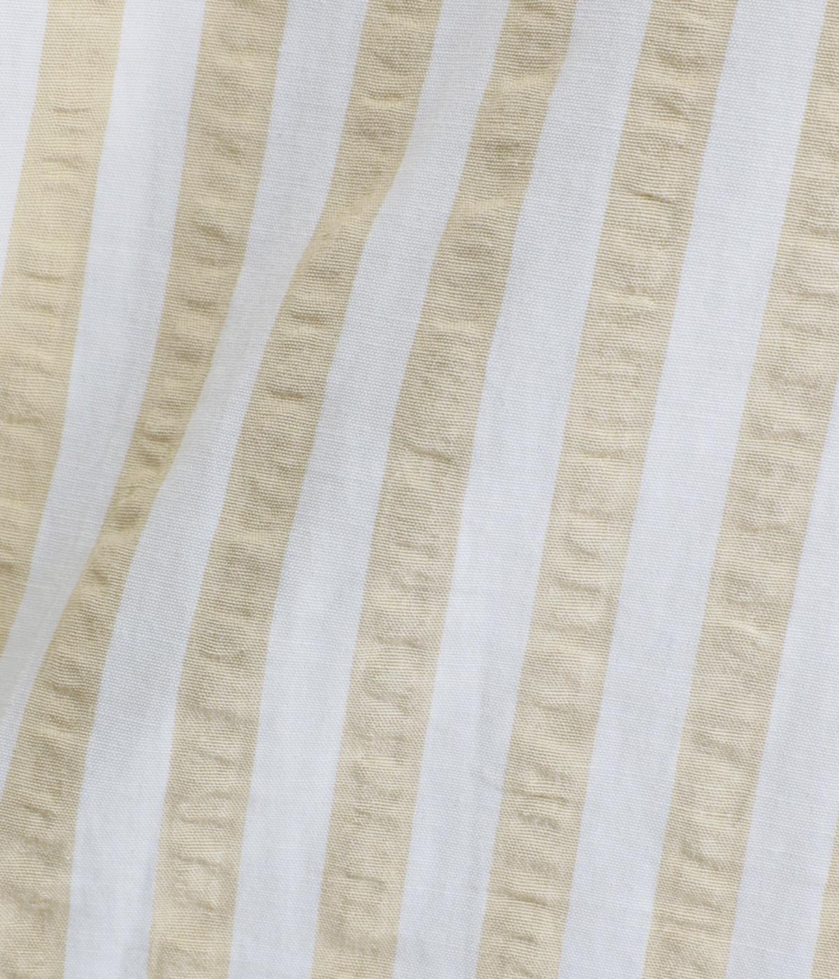 コットンとポリエステルでストライプを表現しました。軽やかな素材感がさわやかな雰囲気を後押しします。シボ感のある表面でシワになりづらく、速乾性に優れた生地です。