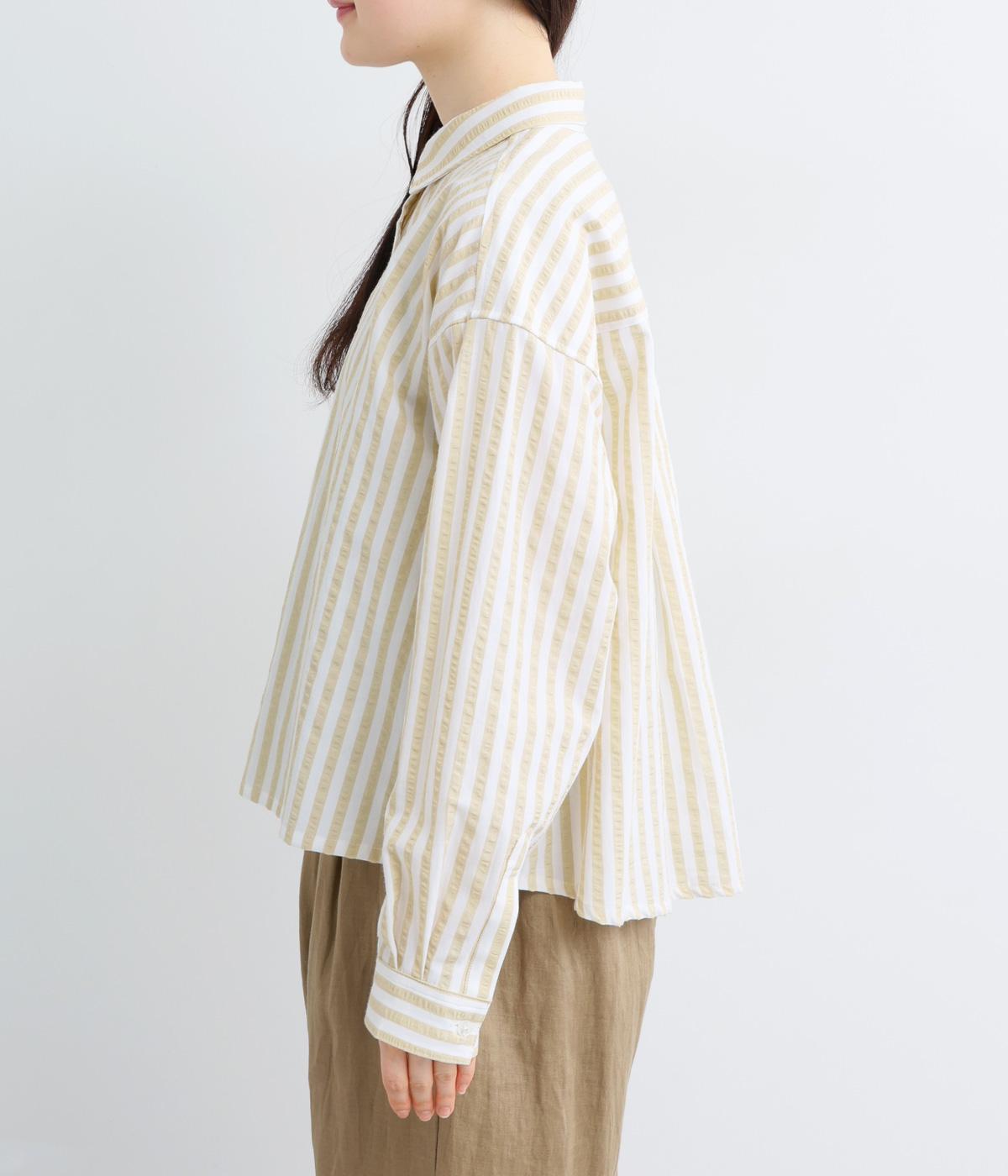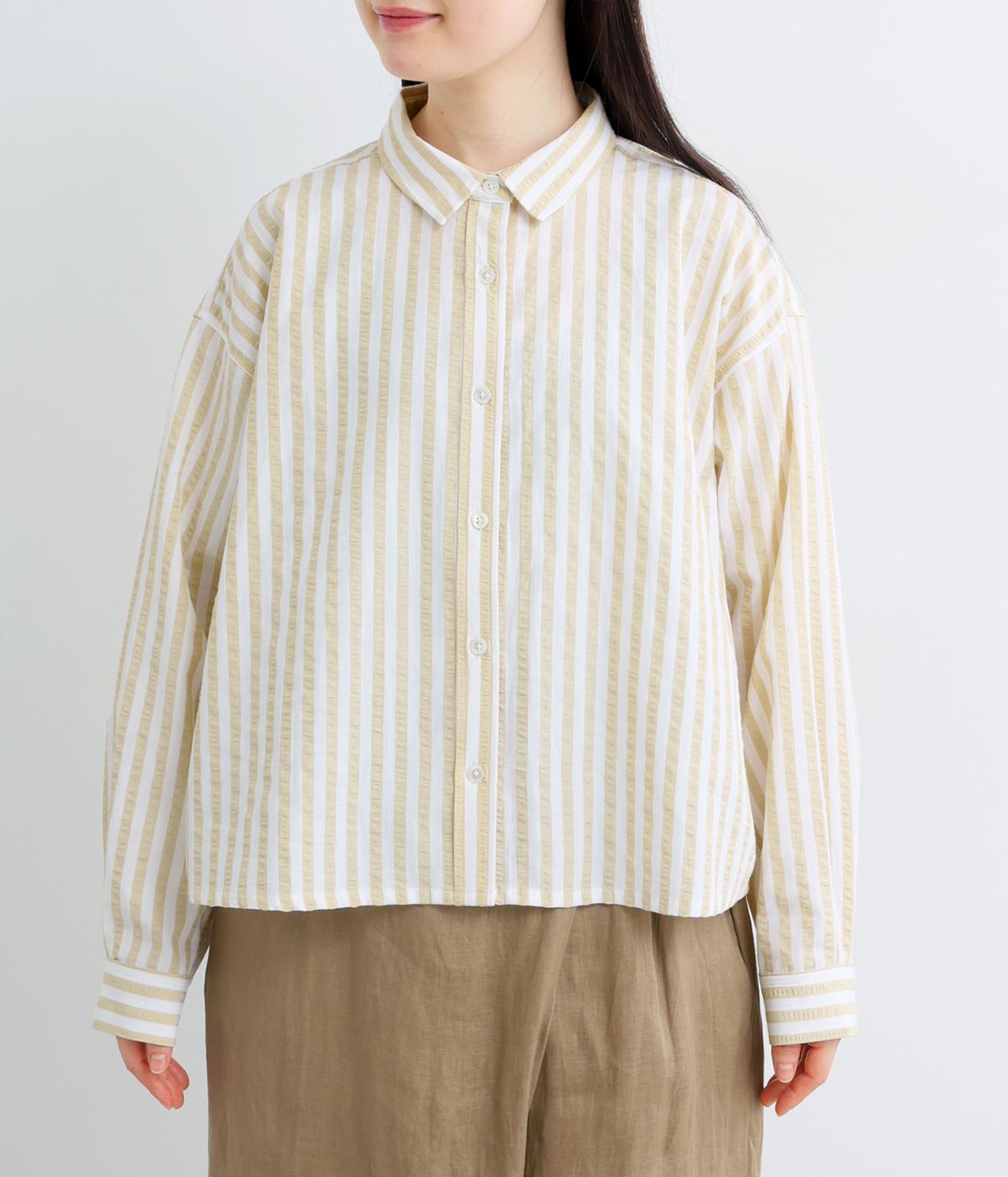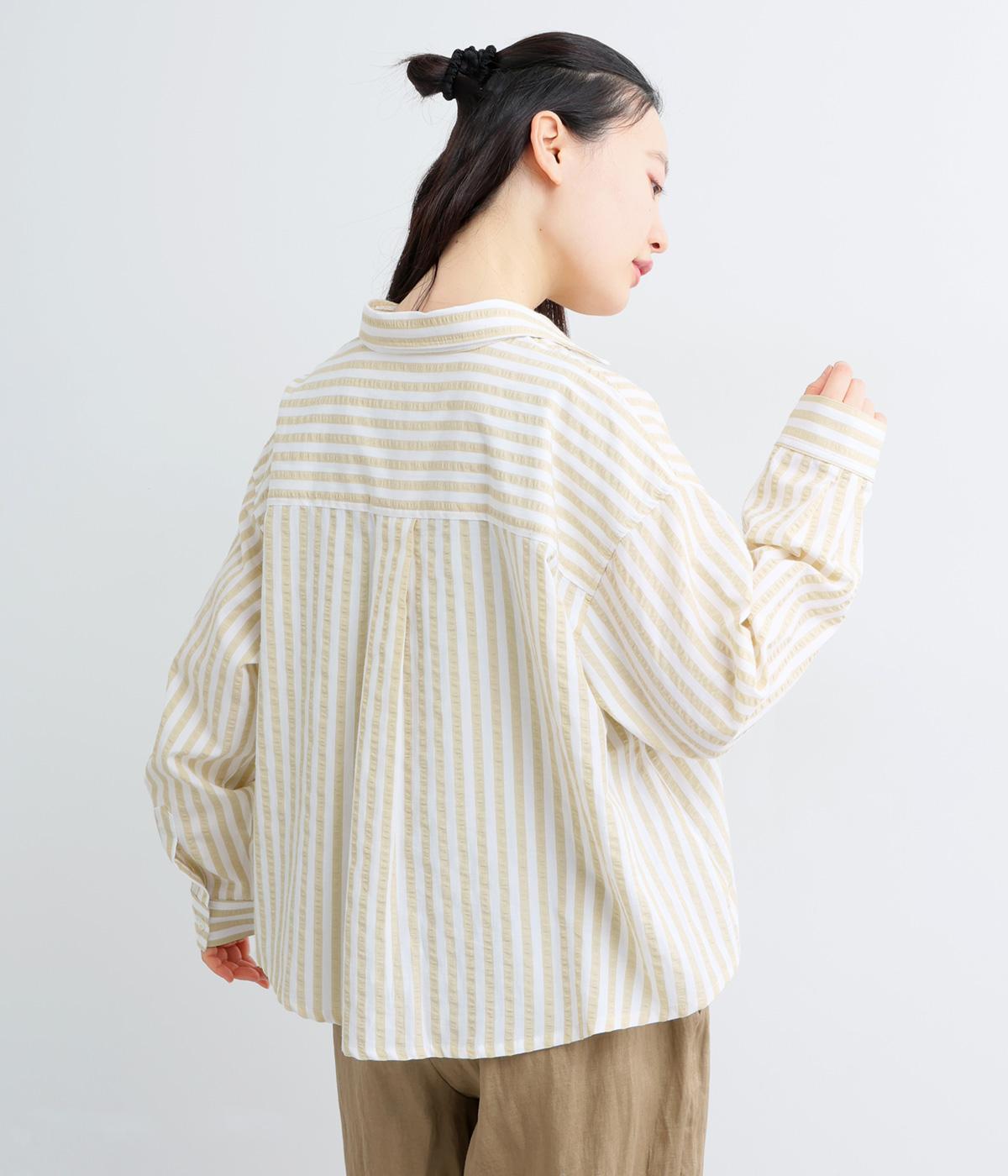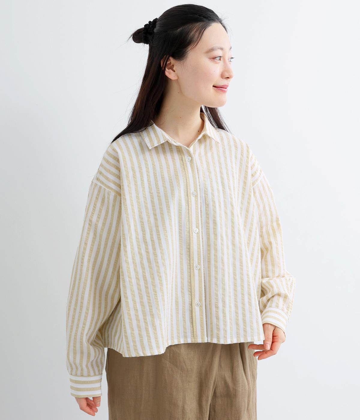 コットンとポリエステルでストライプを表現しました。軽やかな素材感がさわやかな雰囲気を後押しします。シボ感のある表面でシワになりづらく、速乾性に優れた生地です。