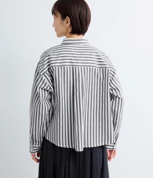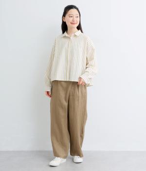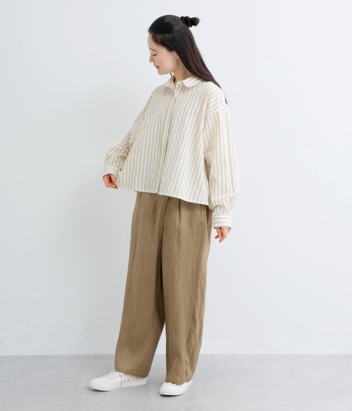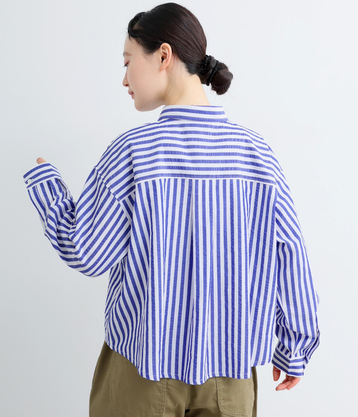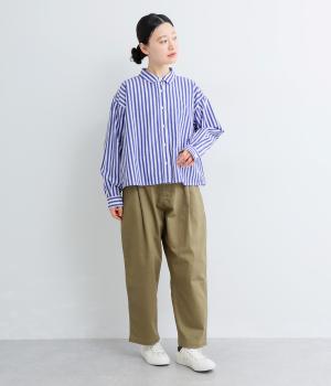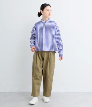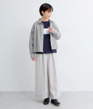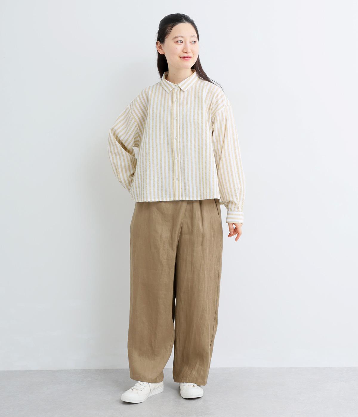 コットンとポリエステルでストライプを表現しました。軽やかな素材感がさわやかな雰囲気を後押しします。シボ感のある表面でシワになりづらく、速乾性に優れた生地です。